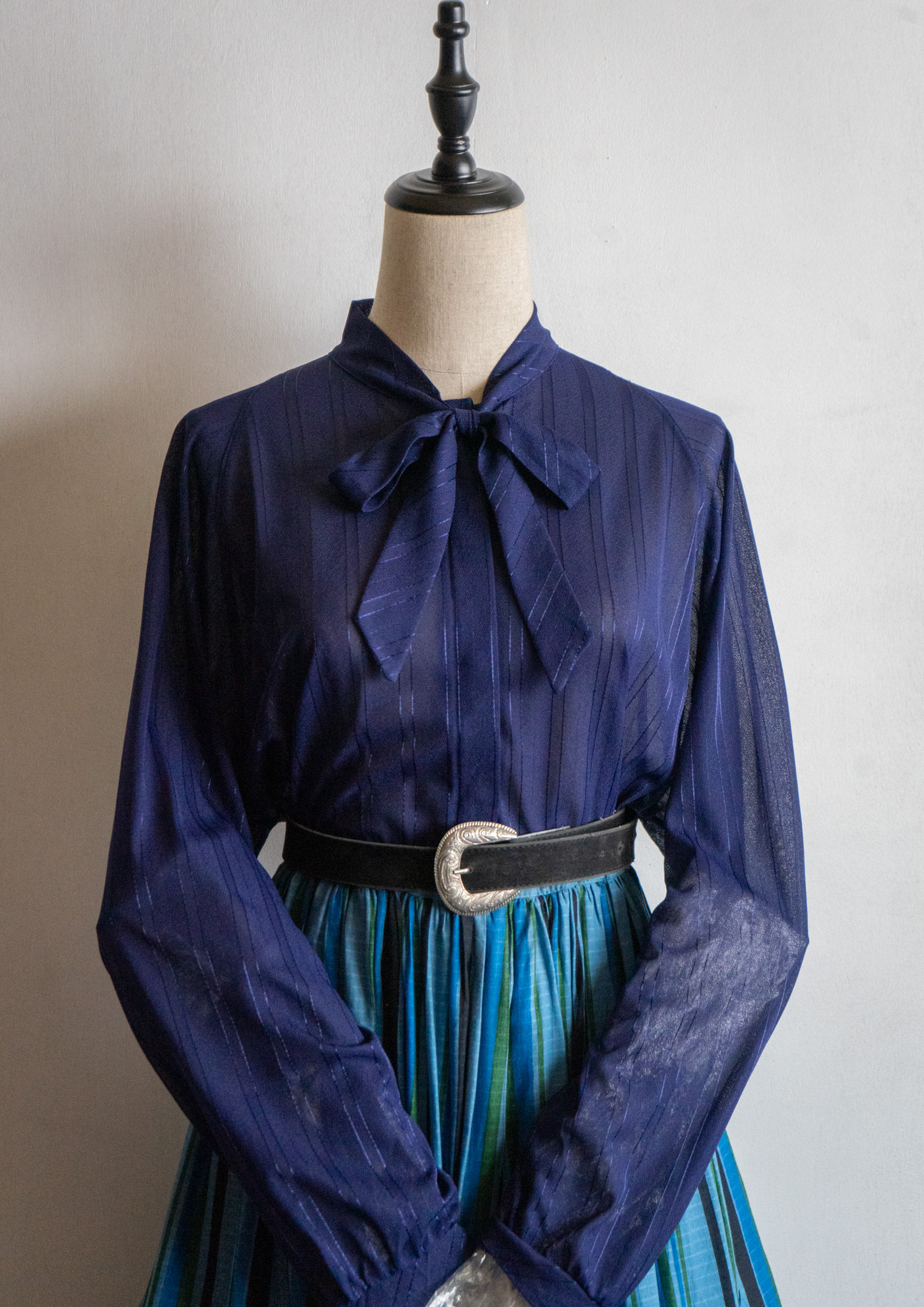 80~90's Euro Stripe Pattern Navy Sheer Bow-tie Blouse