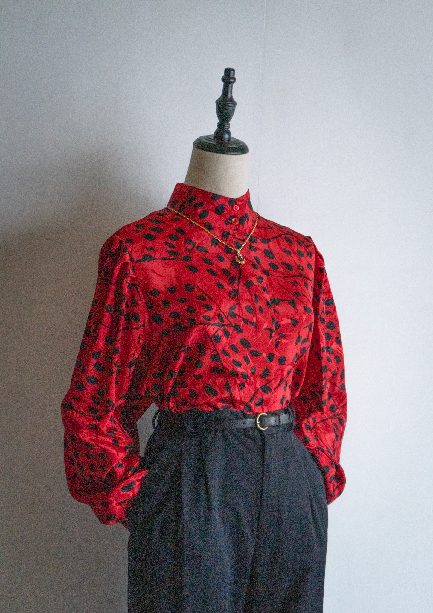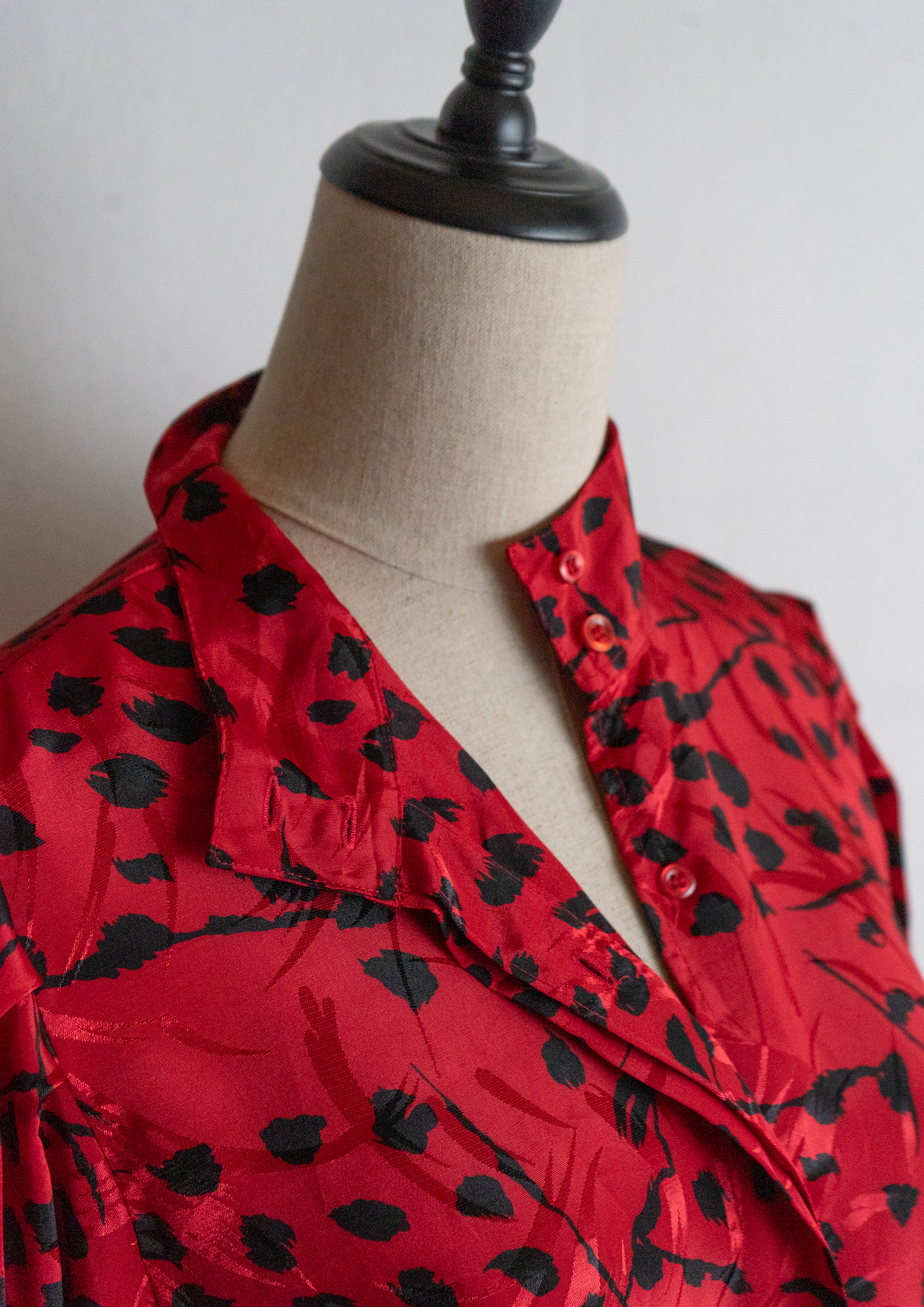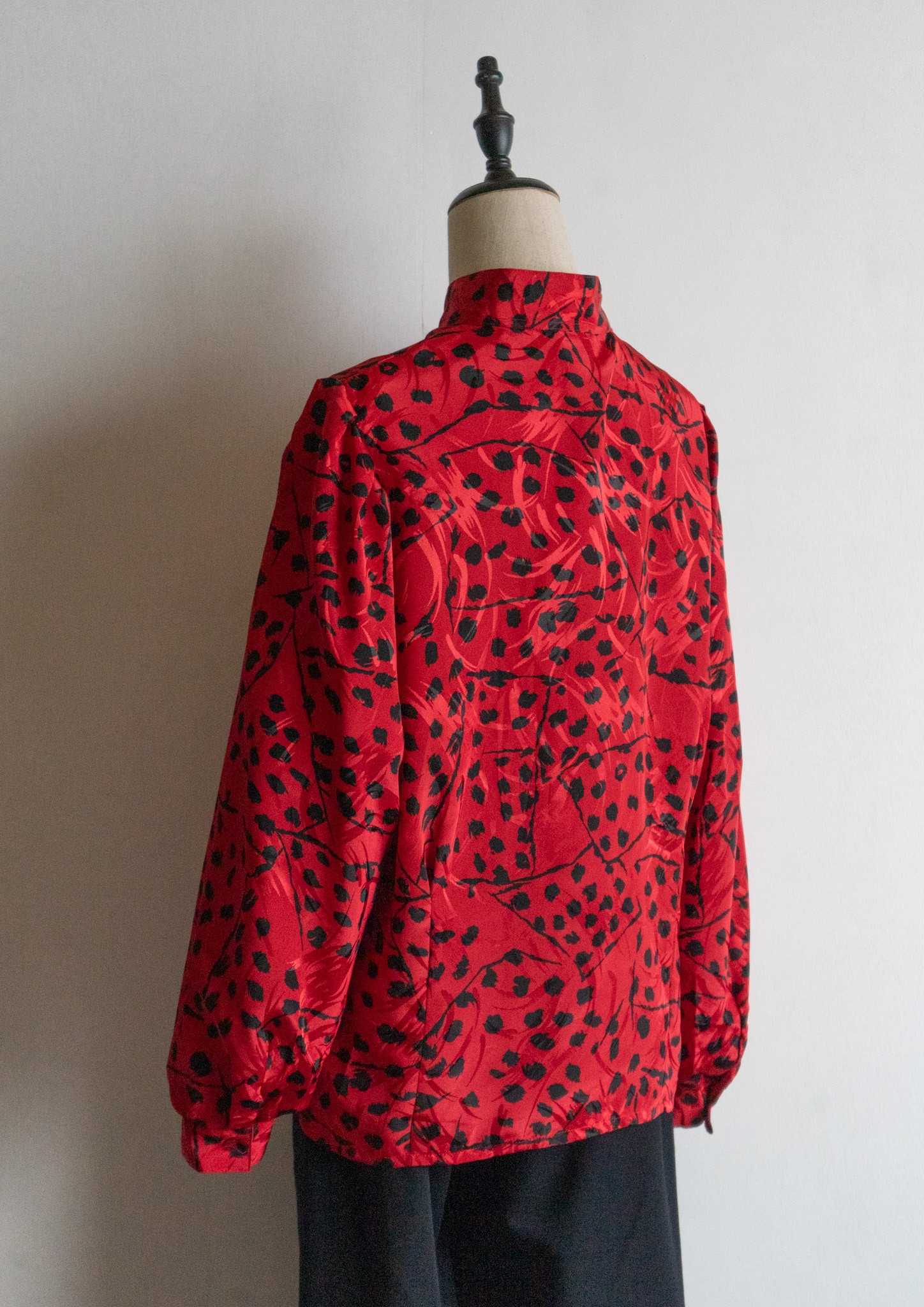 80~90's Euro C&A Black Art Pattern Glossy Red Blouse