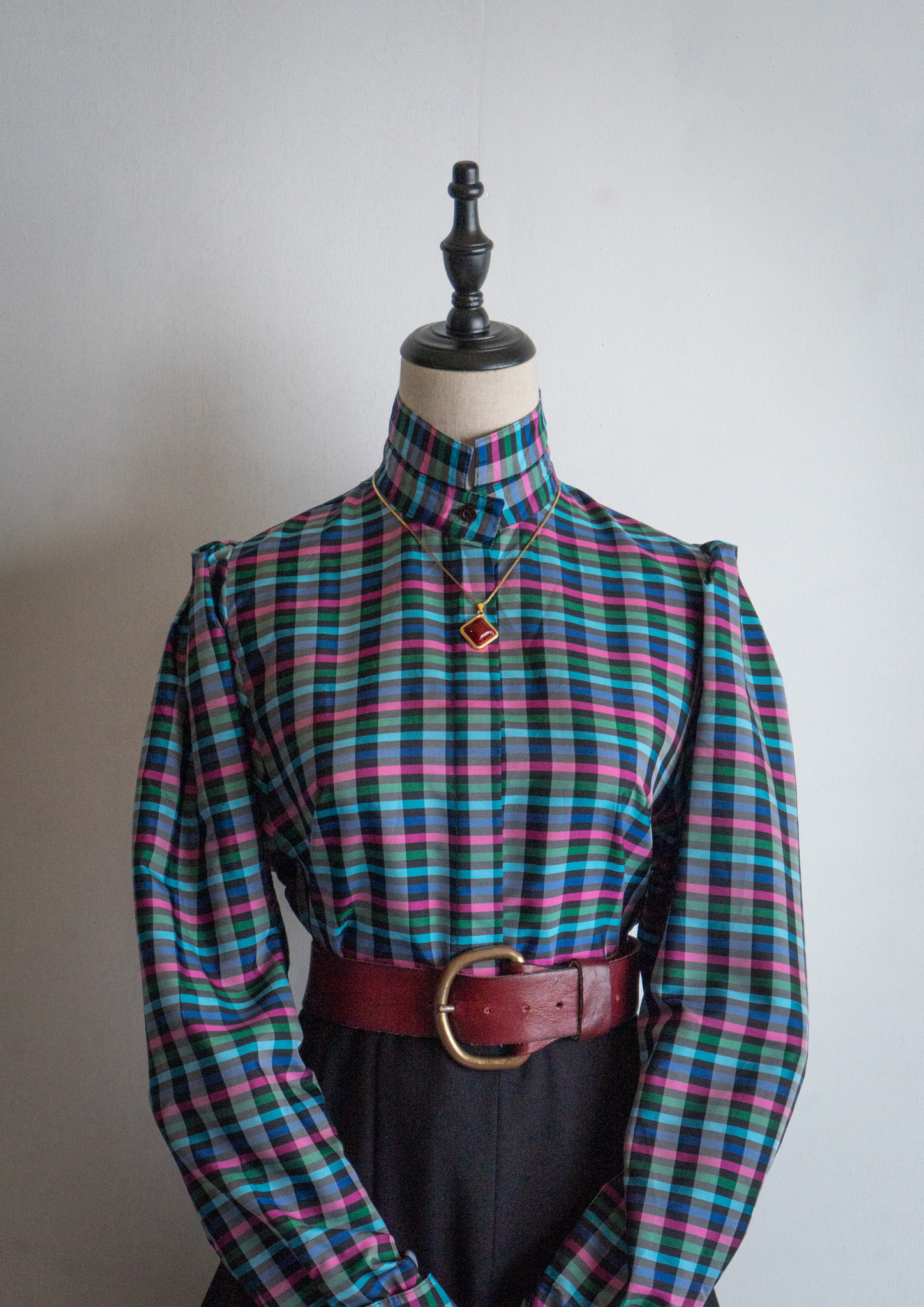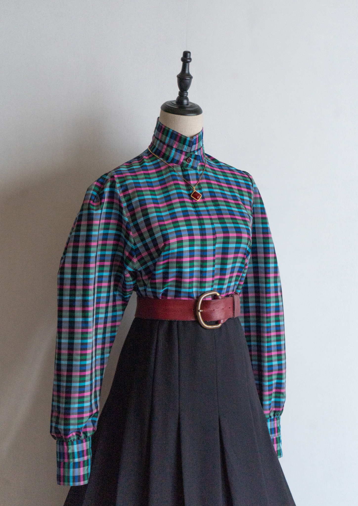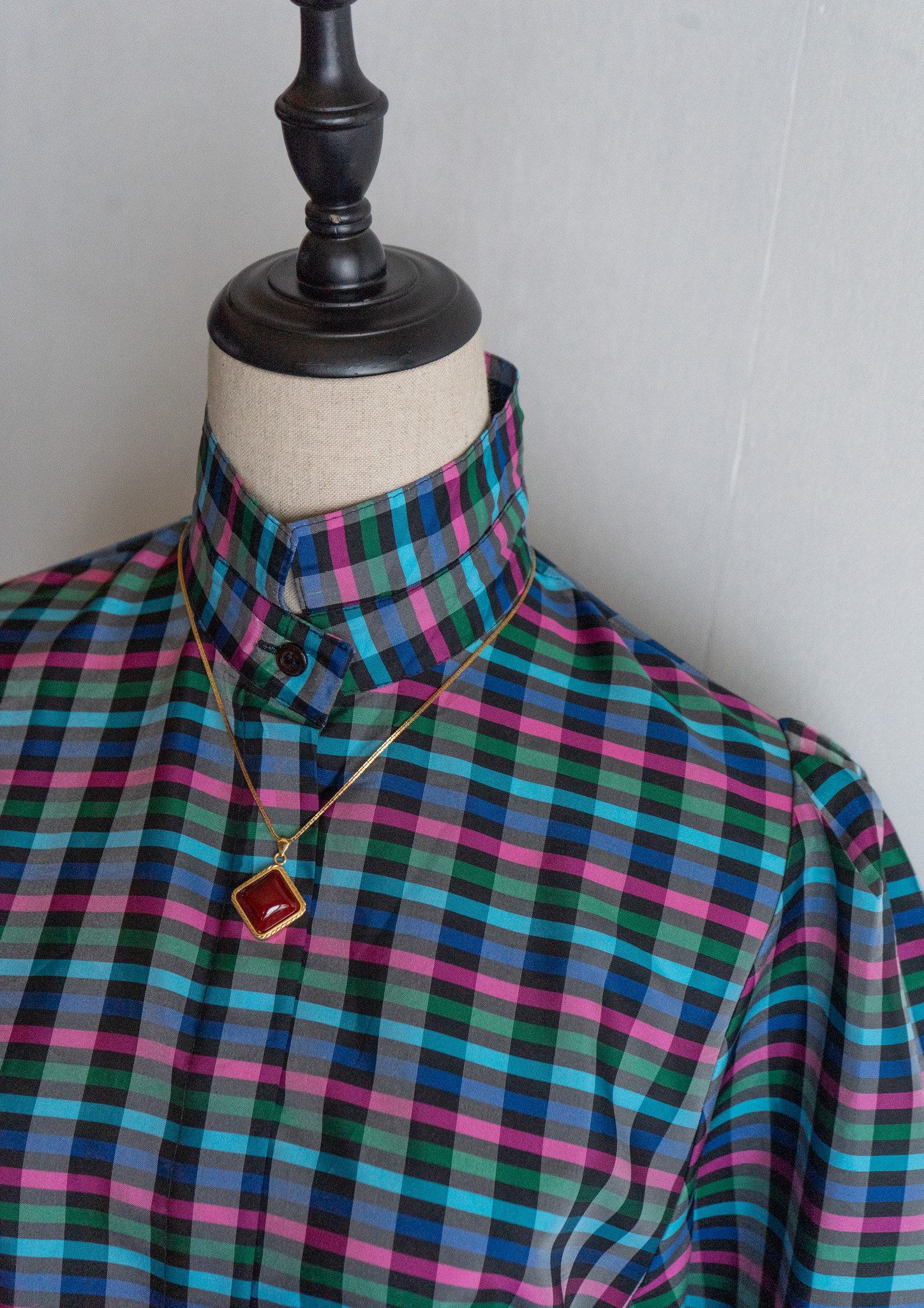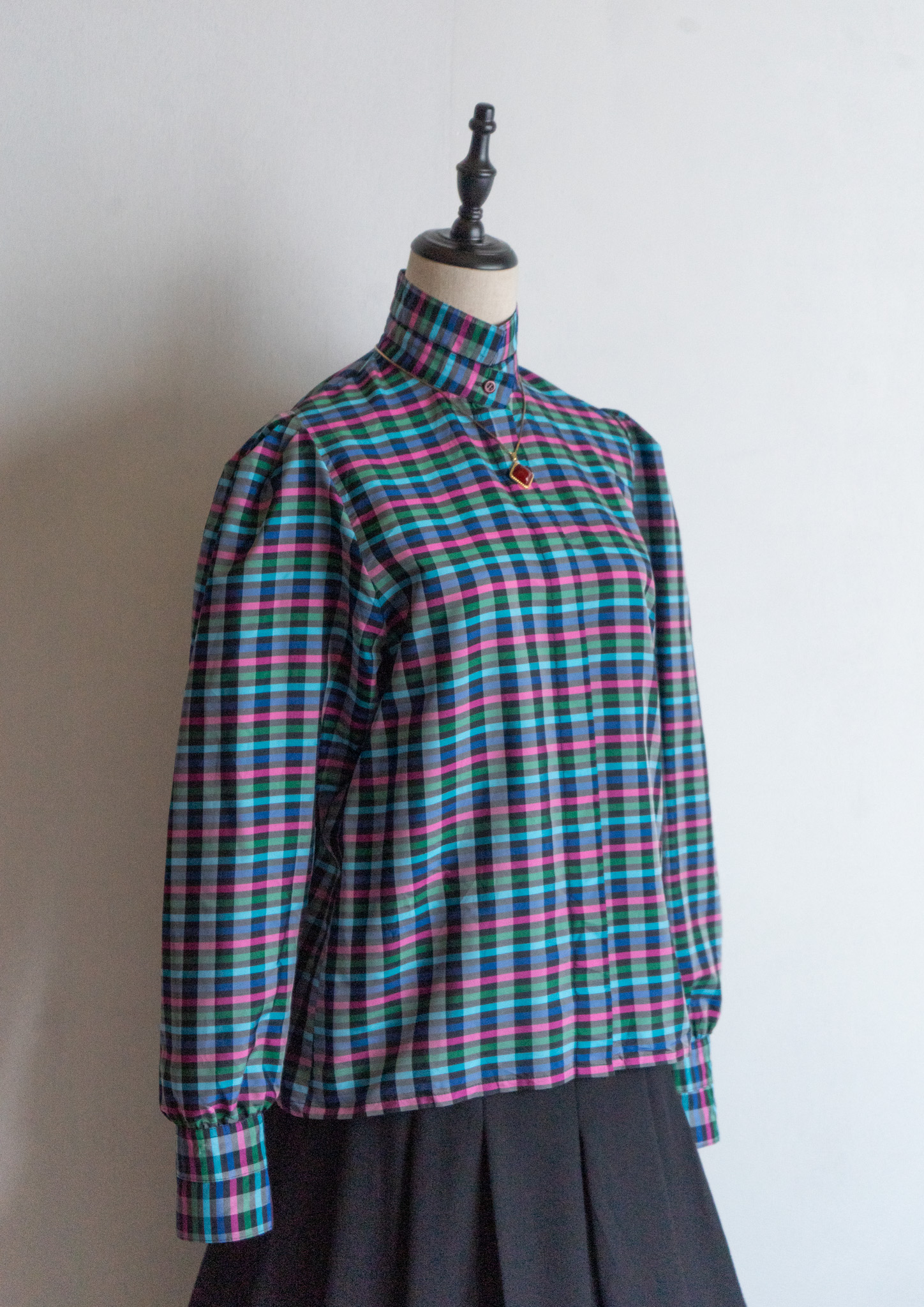 80’s Denmark Stand Collar Colorful Check Pattern Blouse