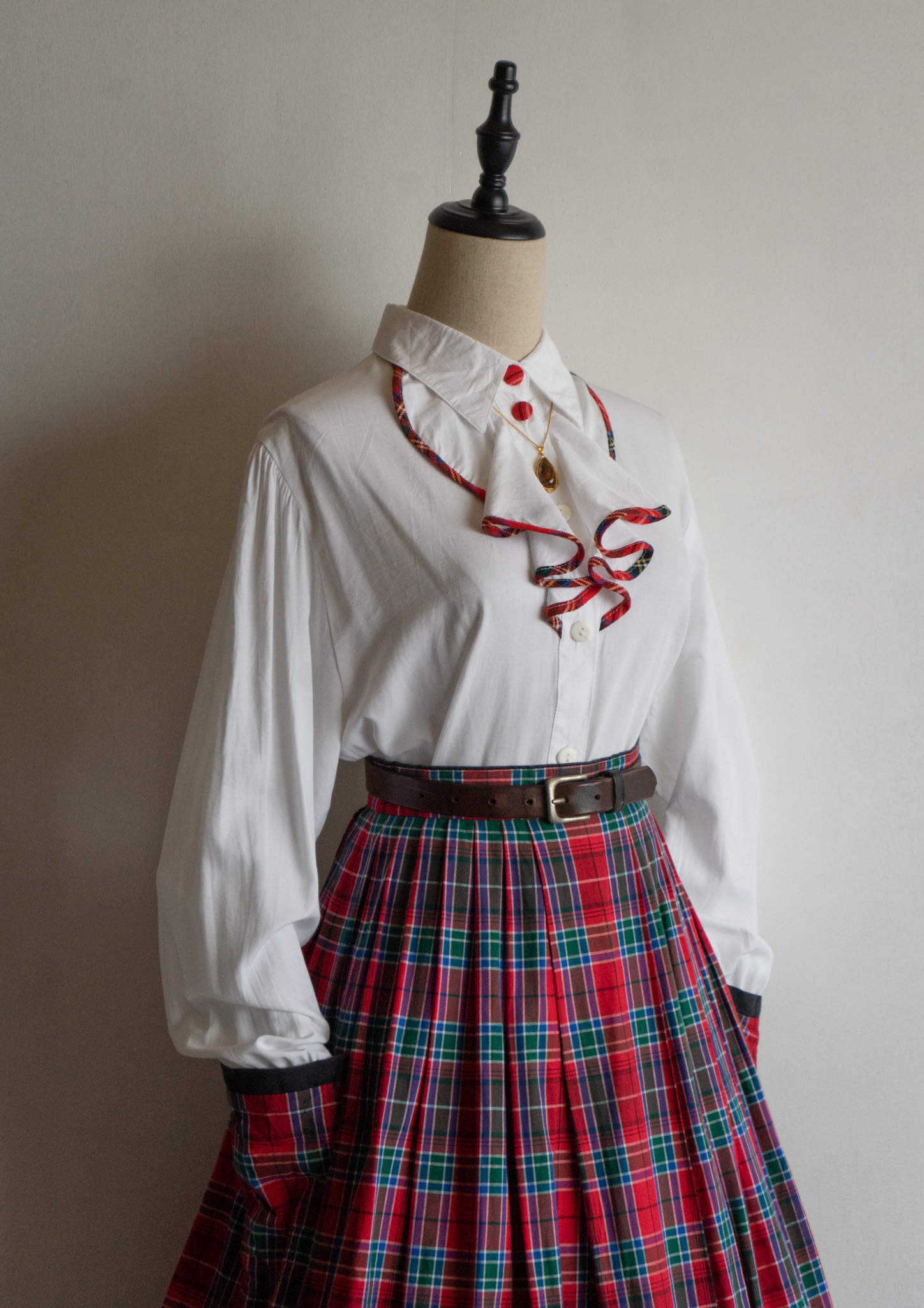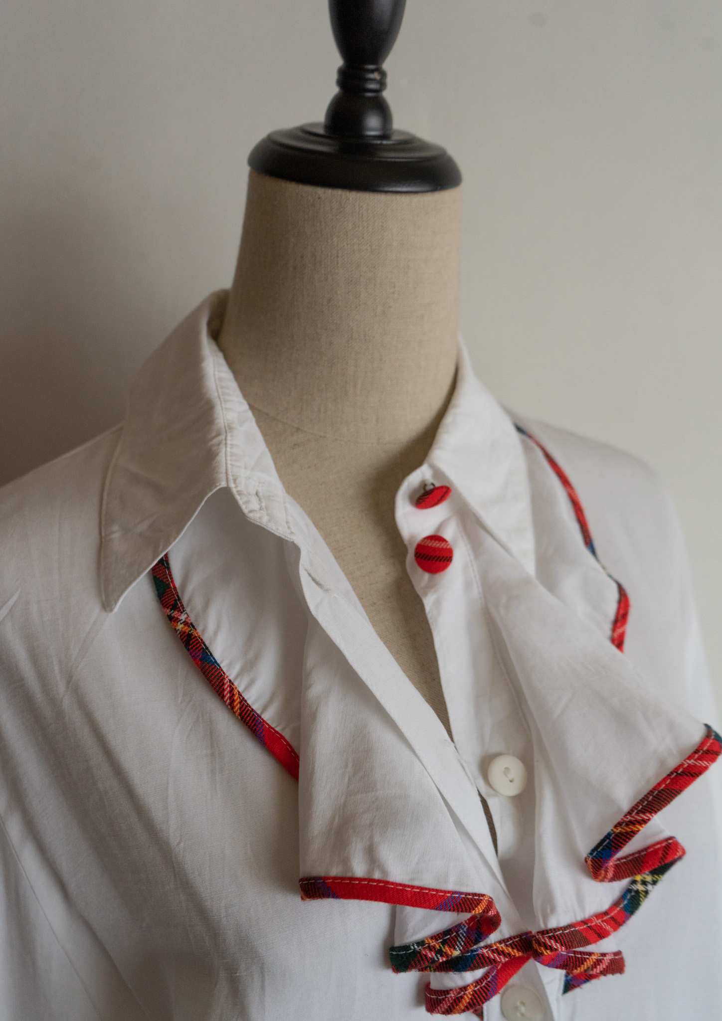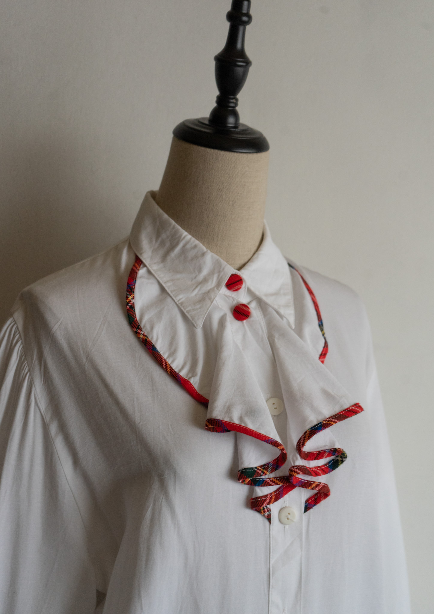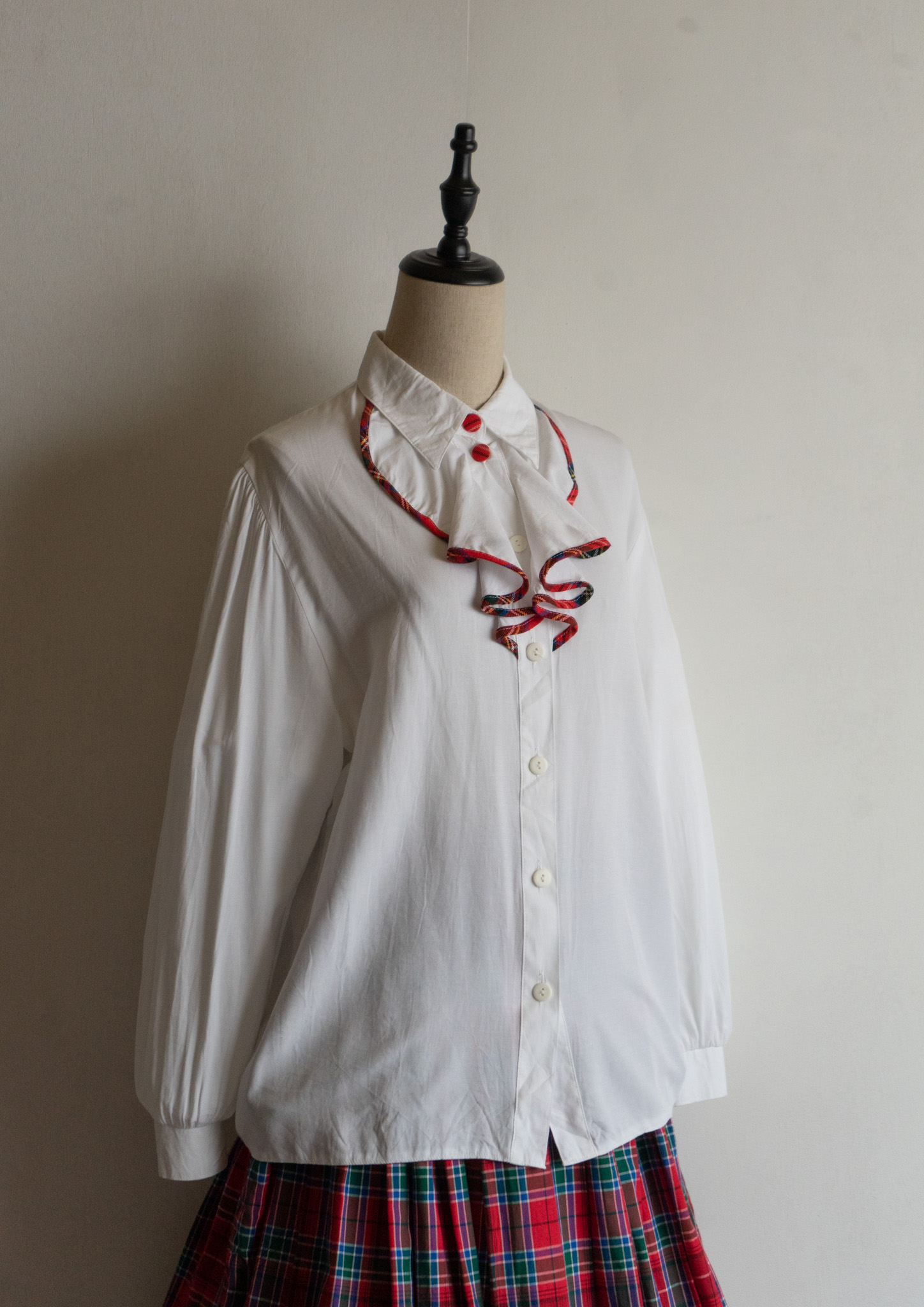 90’s C&A Red Check Piping Jabot Like Collar White Blouse