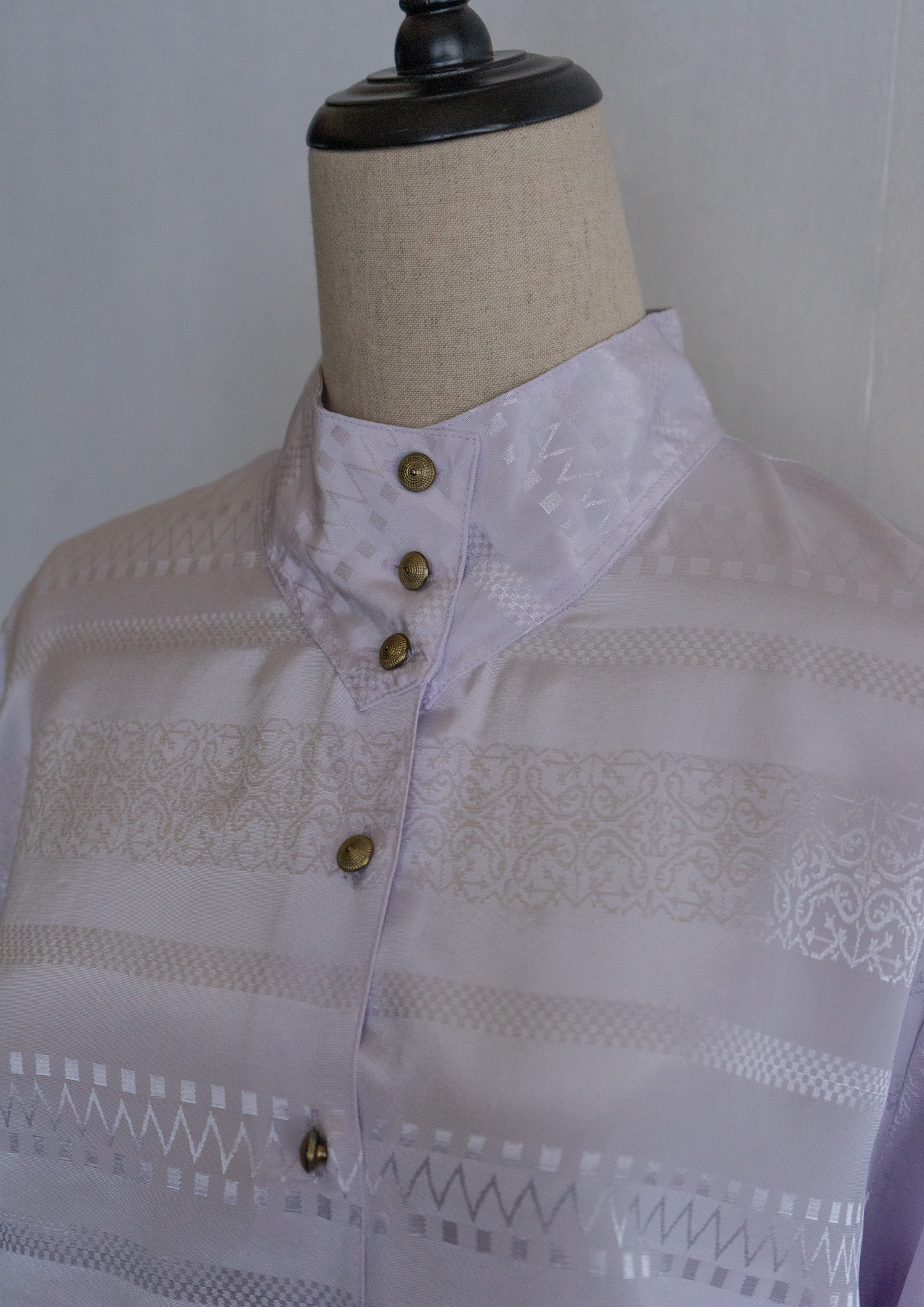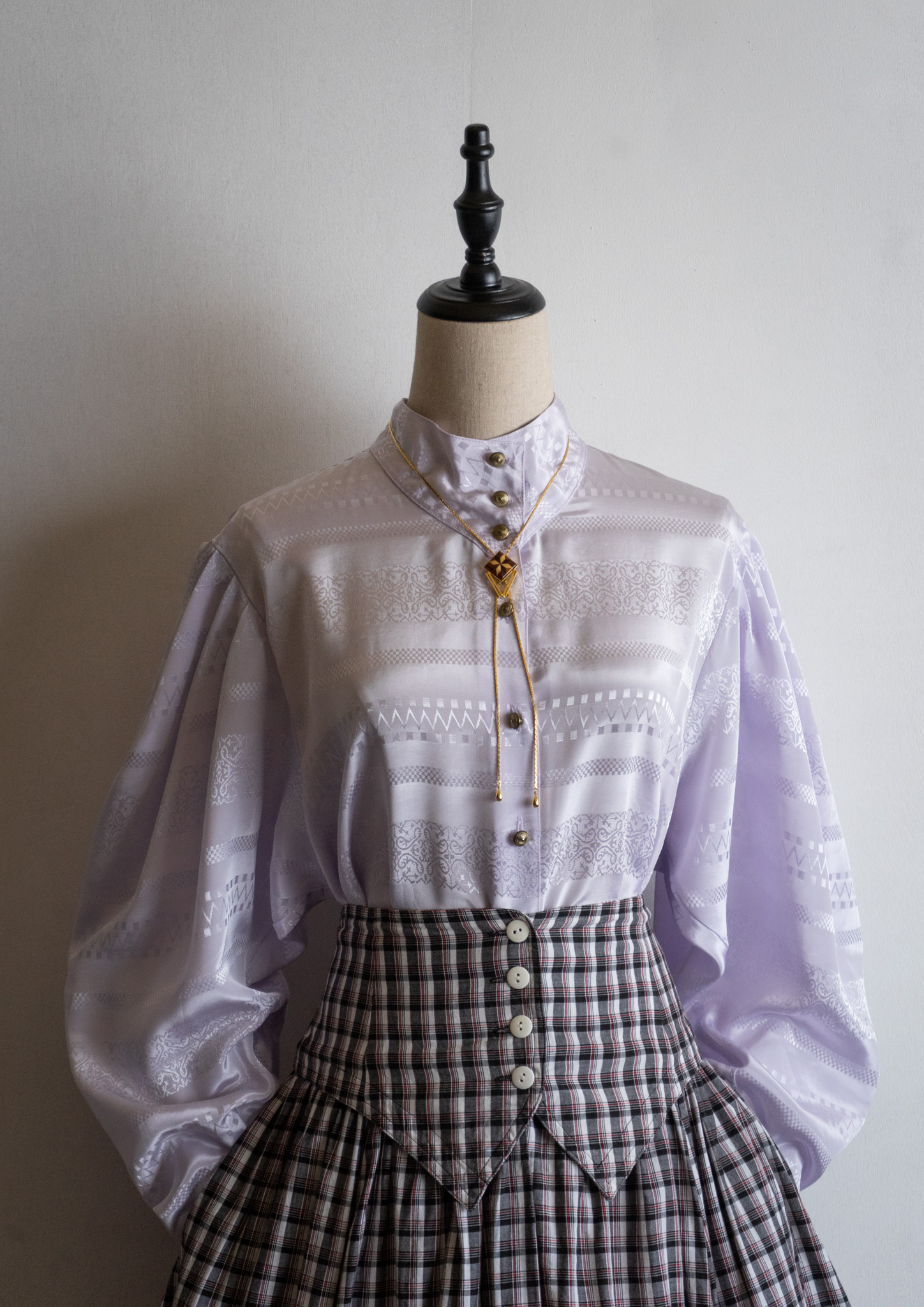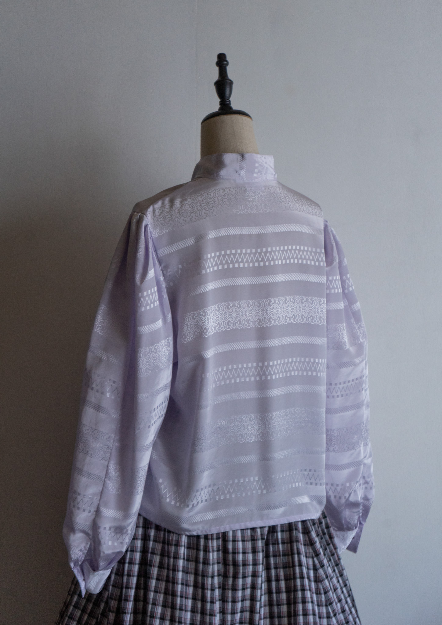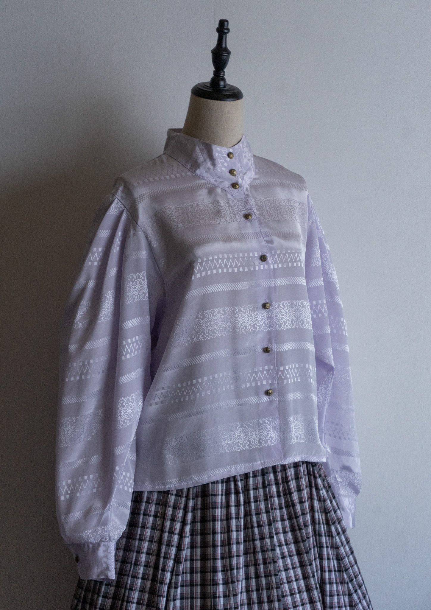 80~90's Stand Collar Various Stripe Pattern Glossy Light Purple Blouse