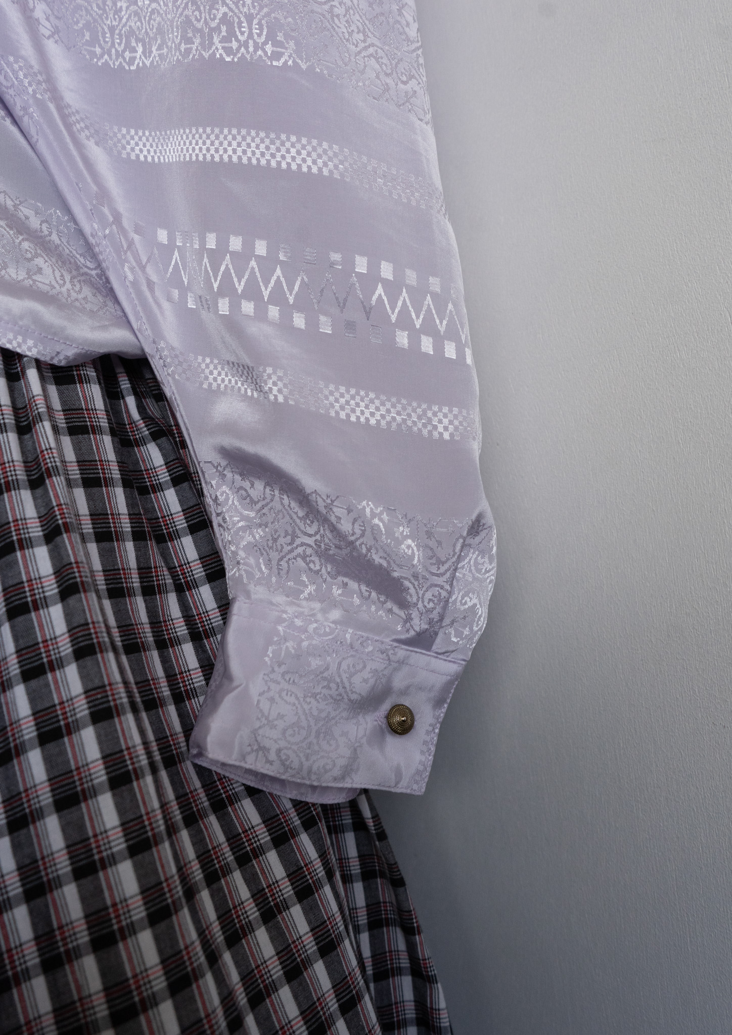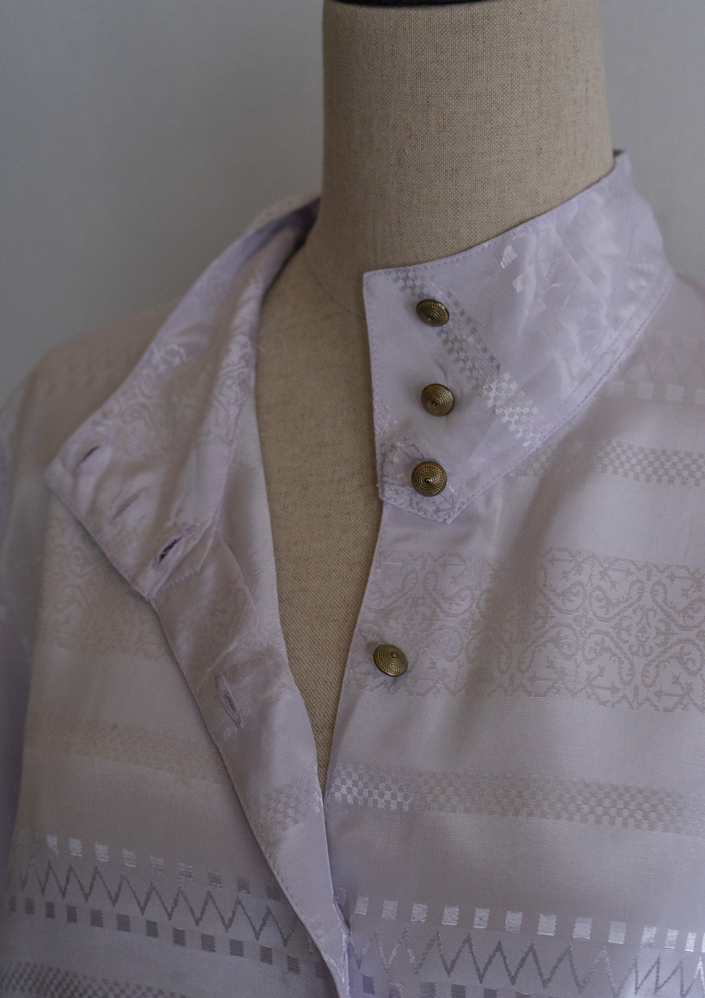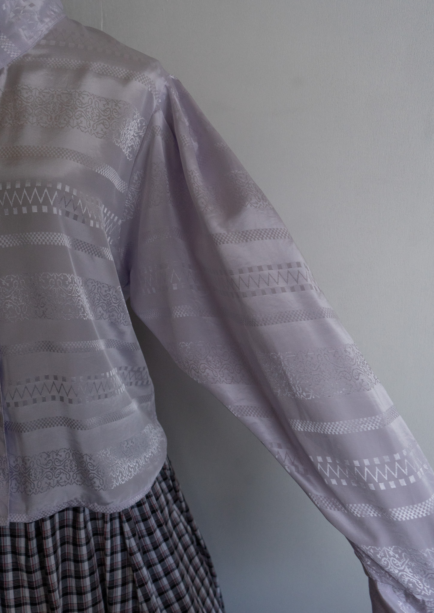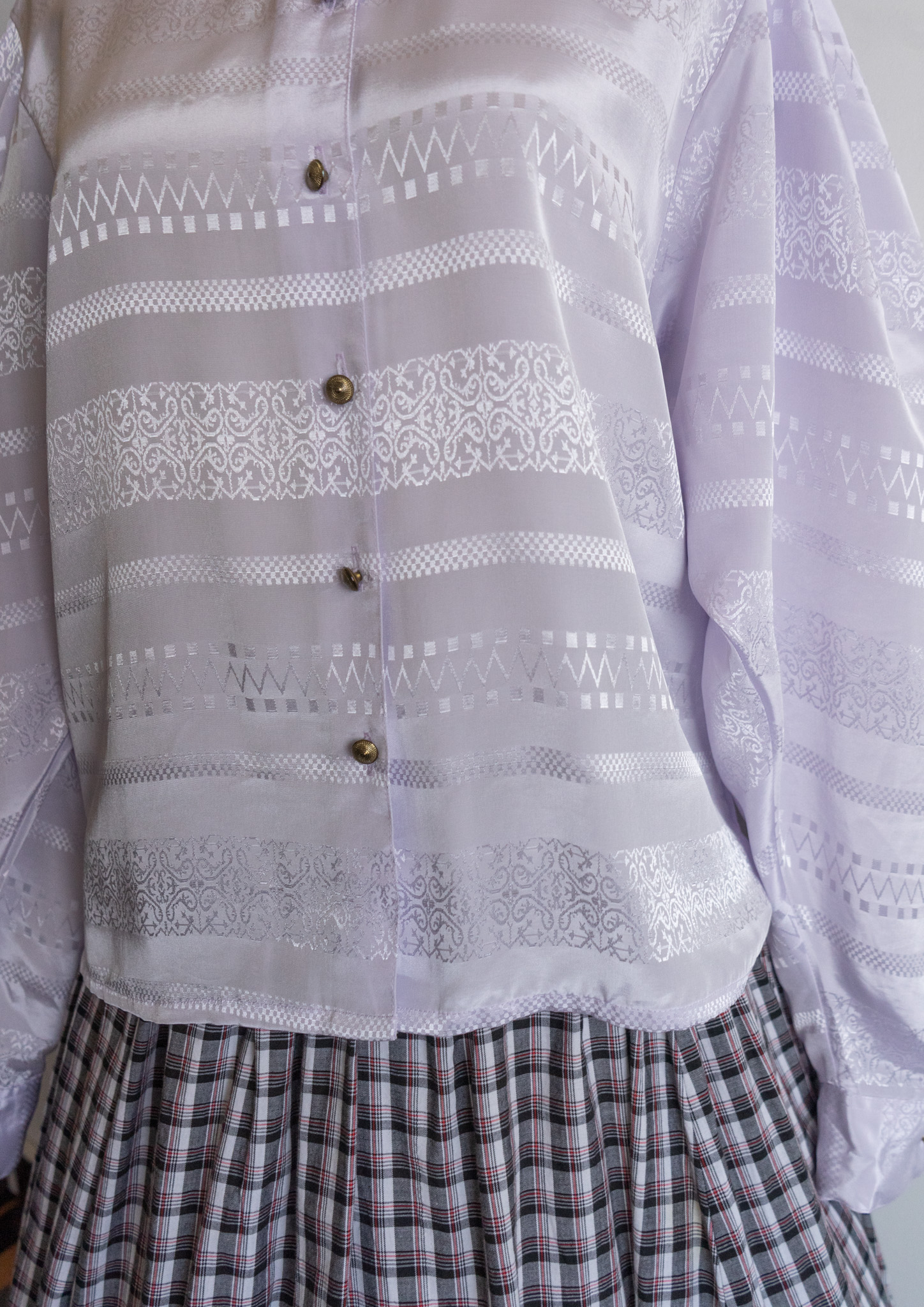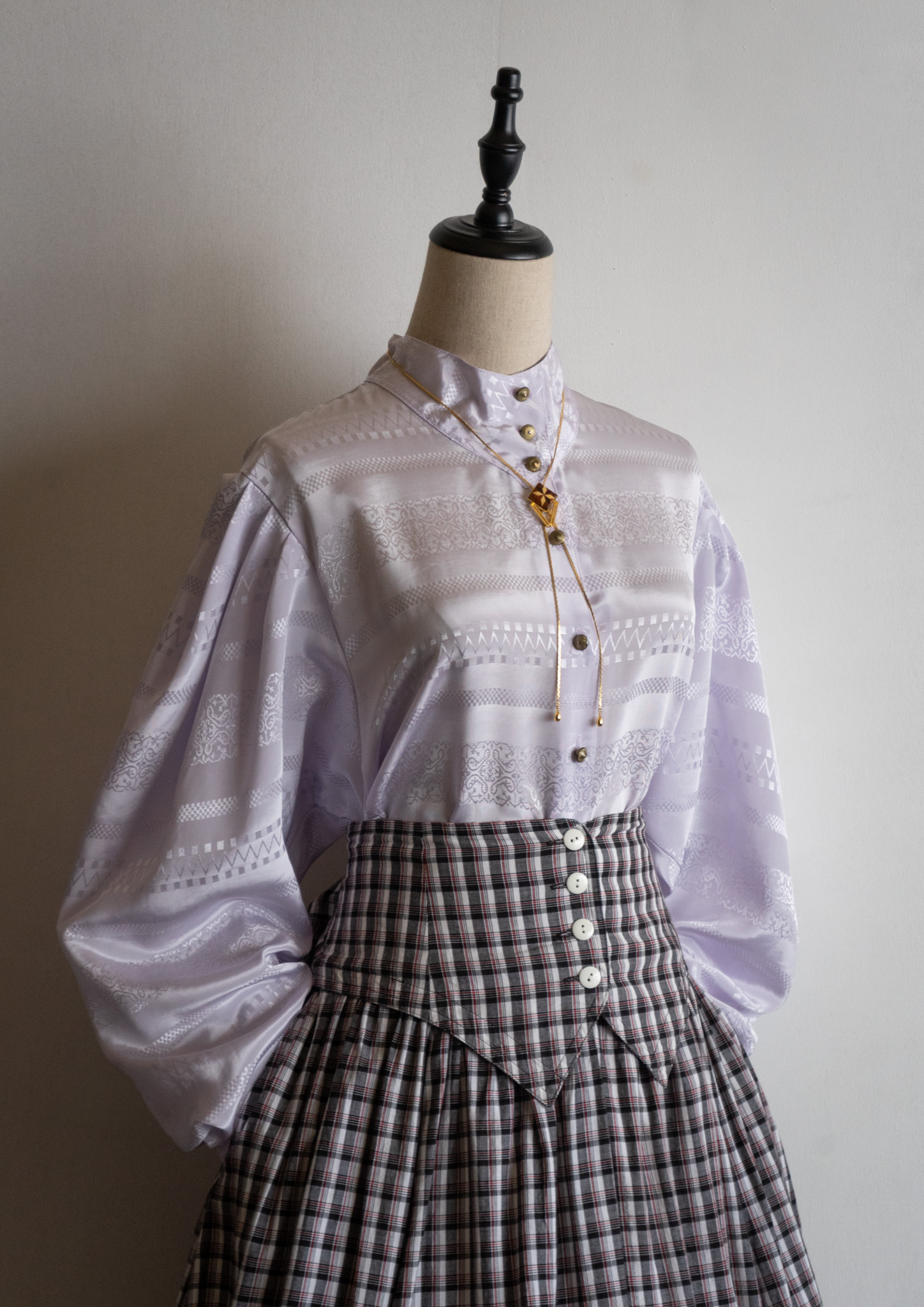 80~90's Stand Collar Various Stripe Pattern Glossy Light Purple Blouse