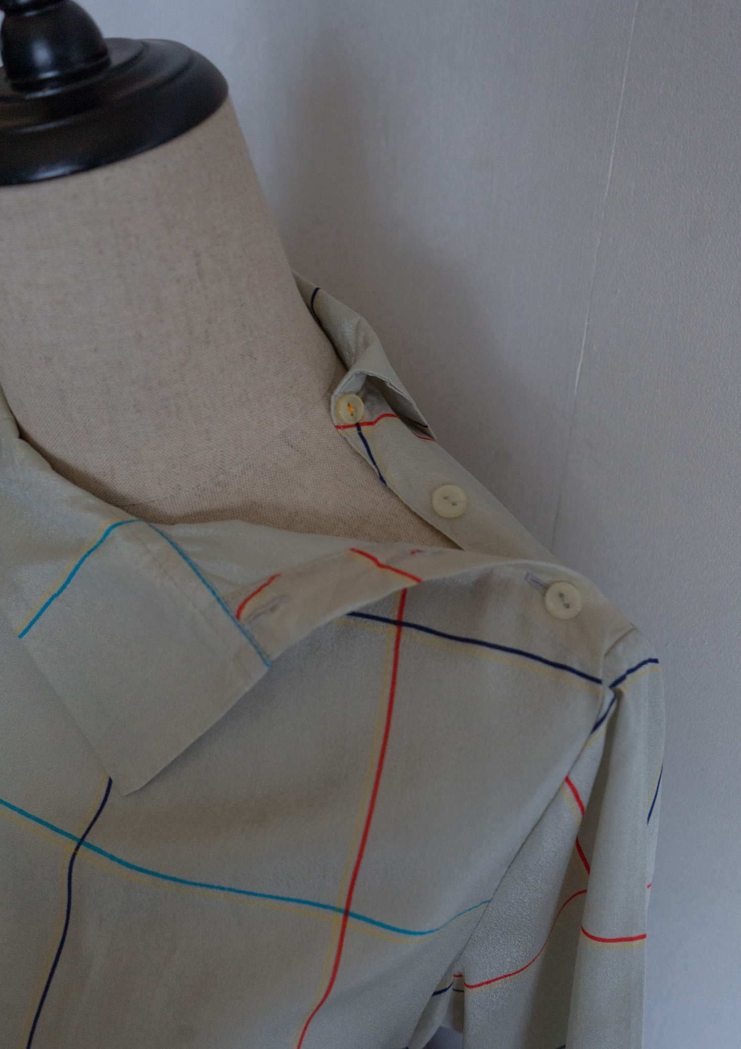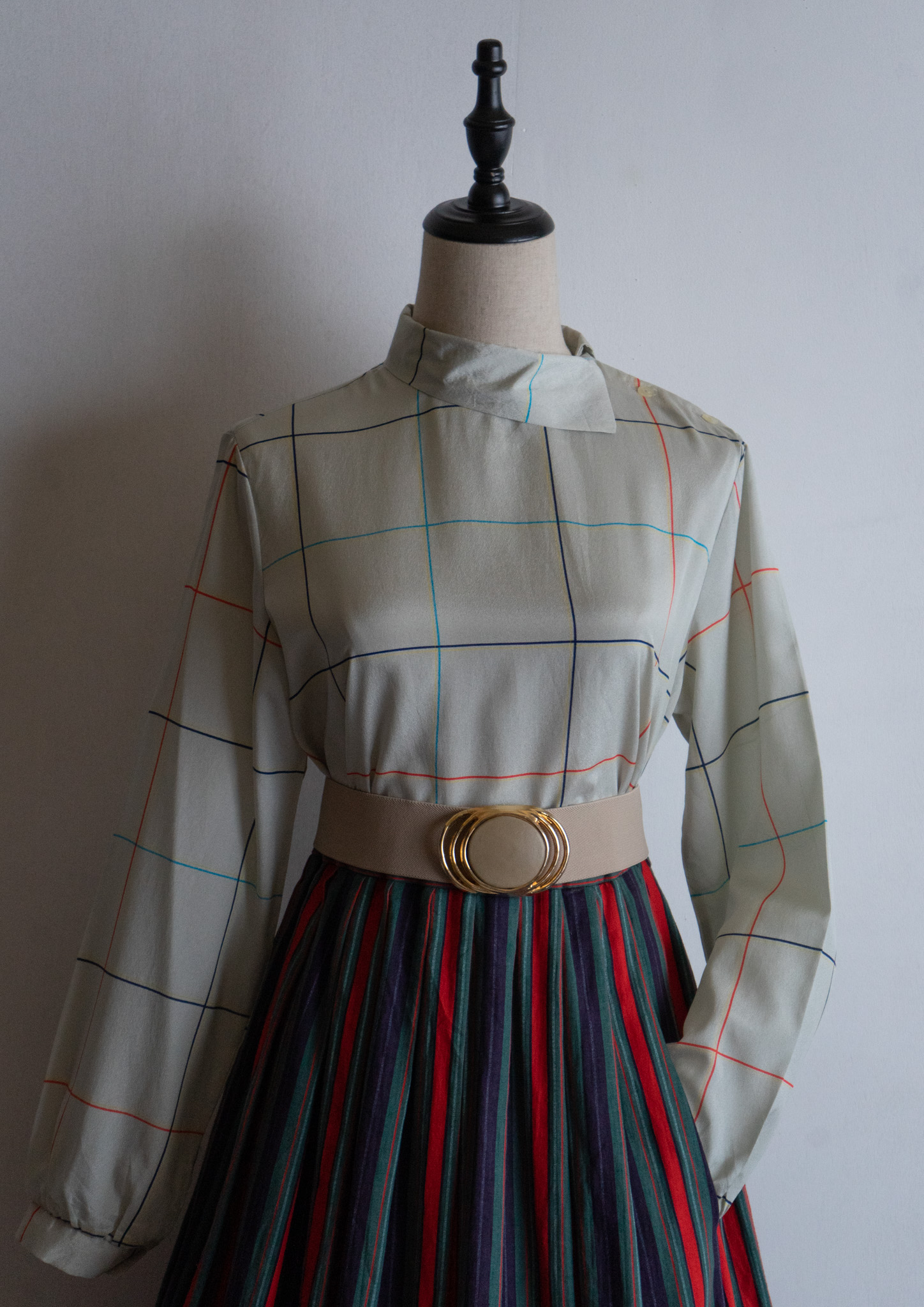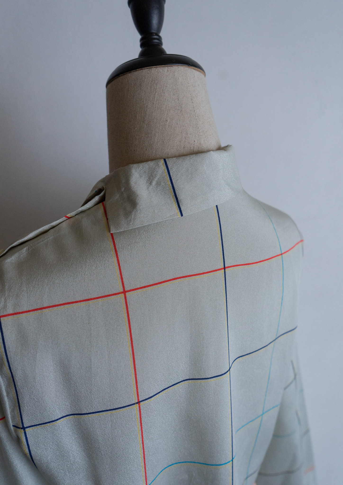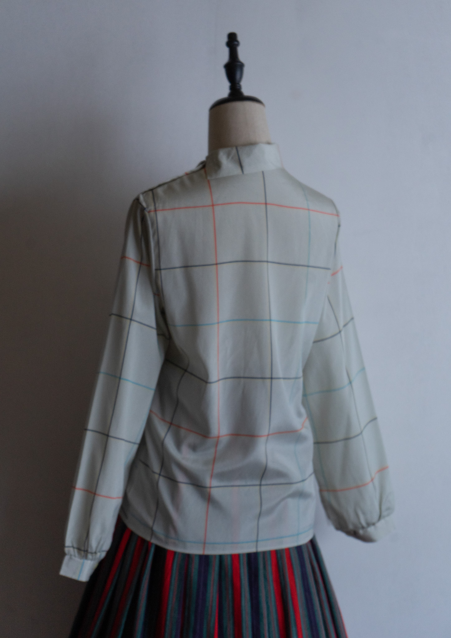 80's Unique Check Pattern Glossy Light Gray Blouse