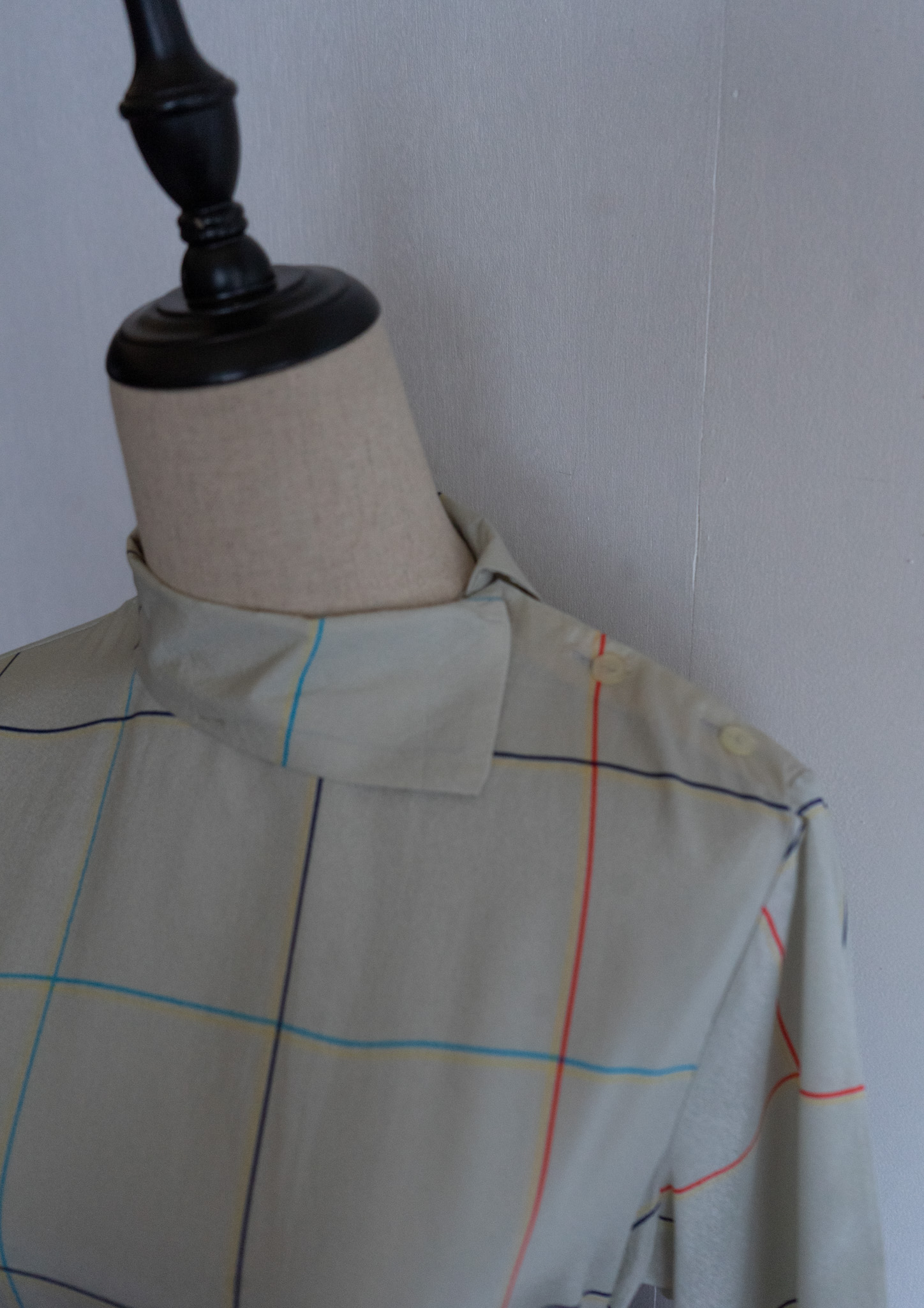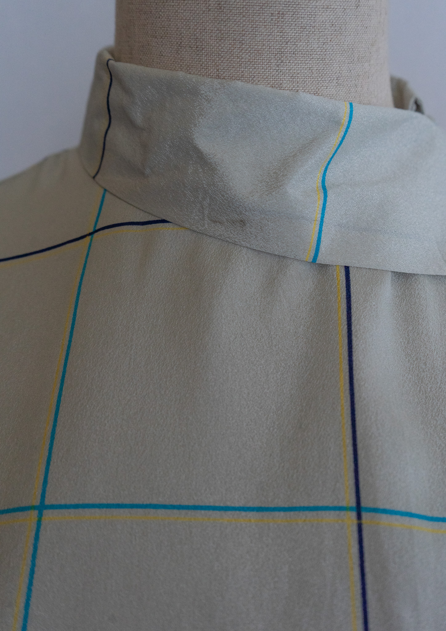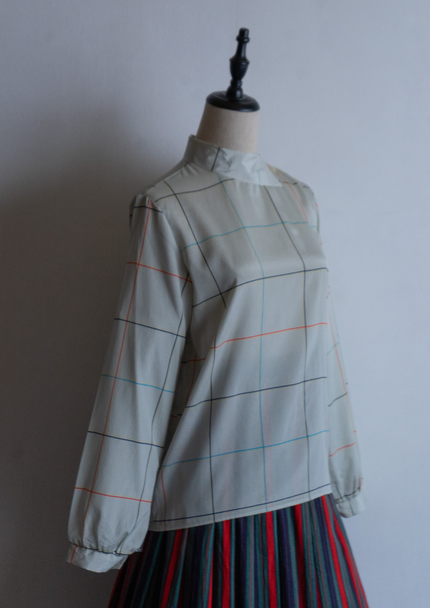 80's Unique Check Pattern Glossy Light Gray Blouse