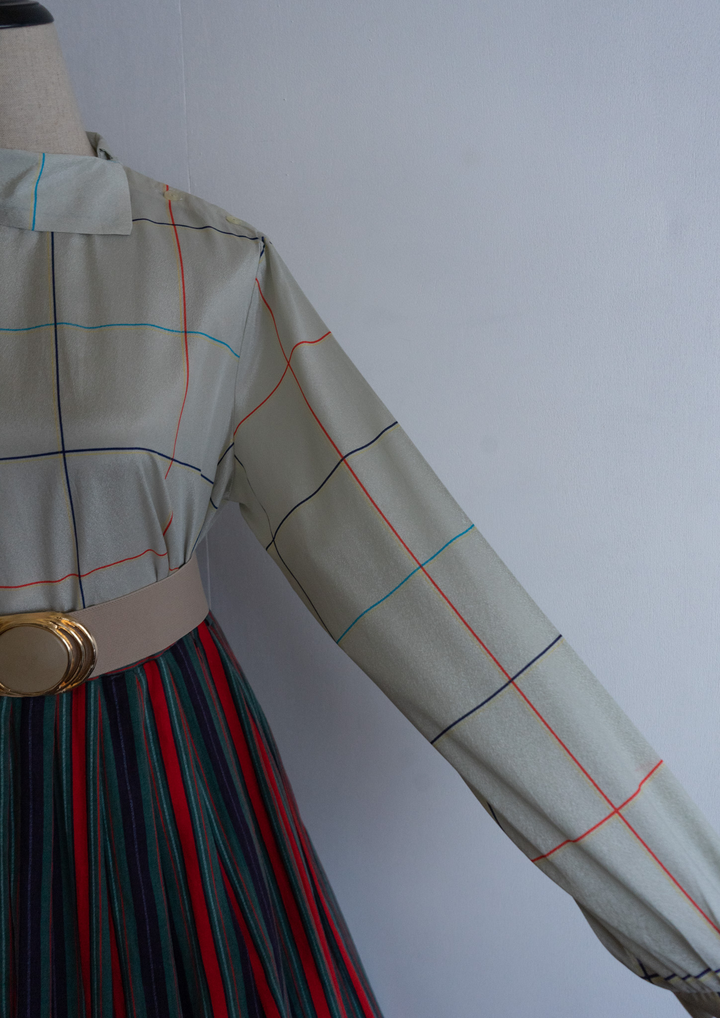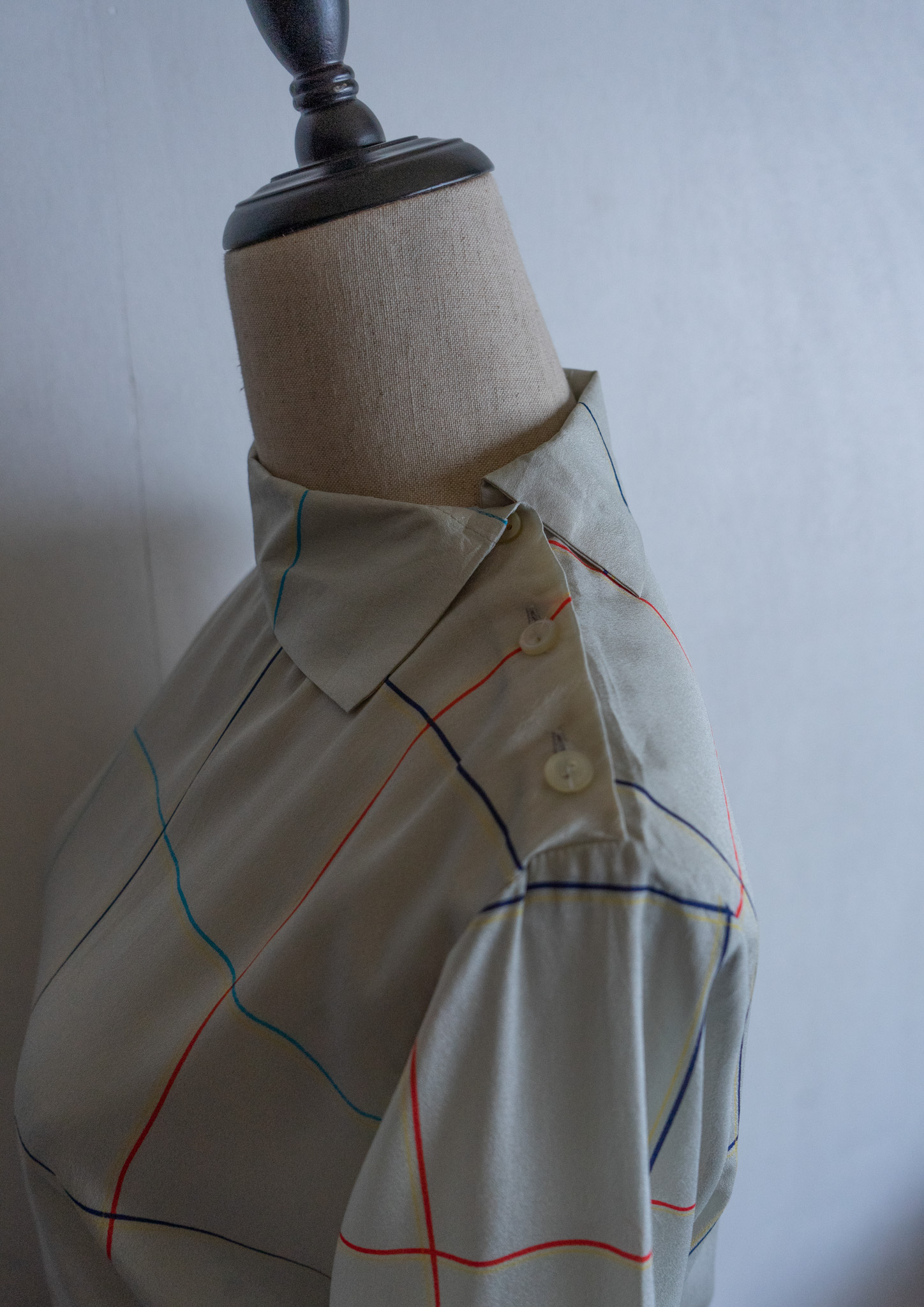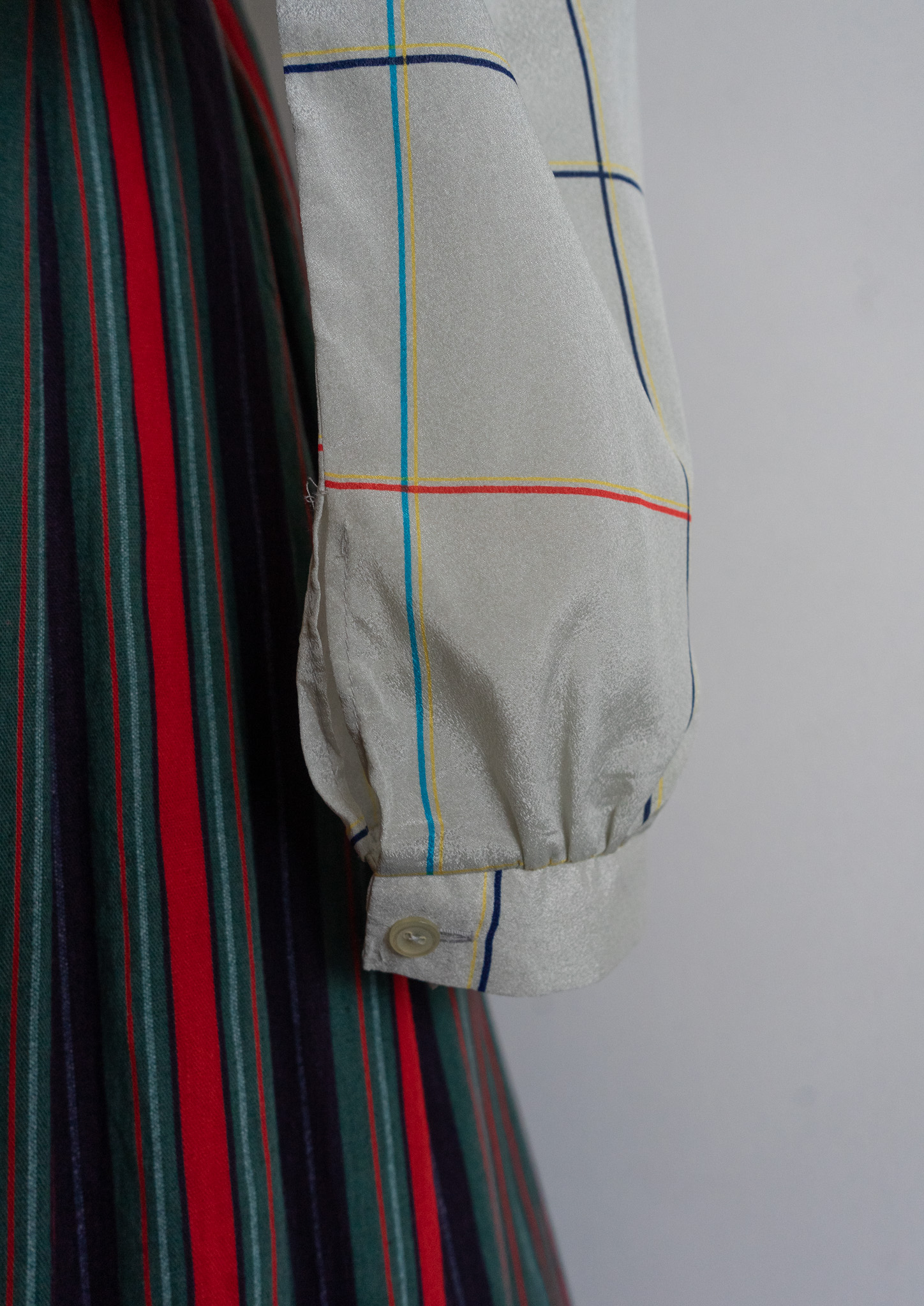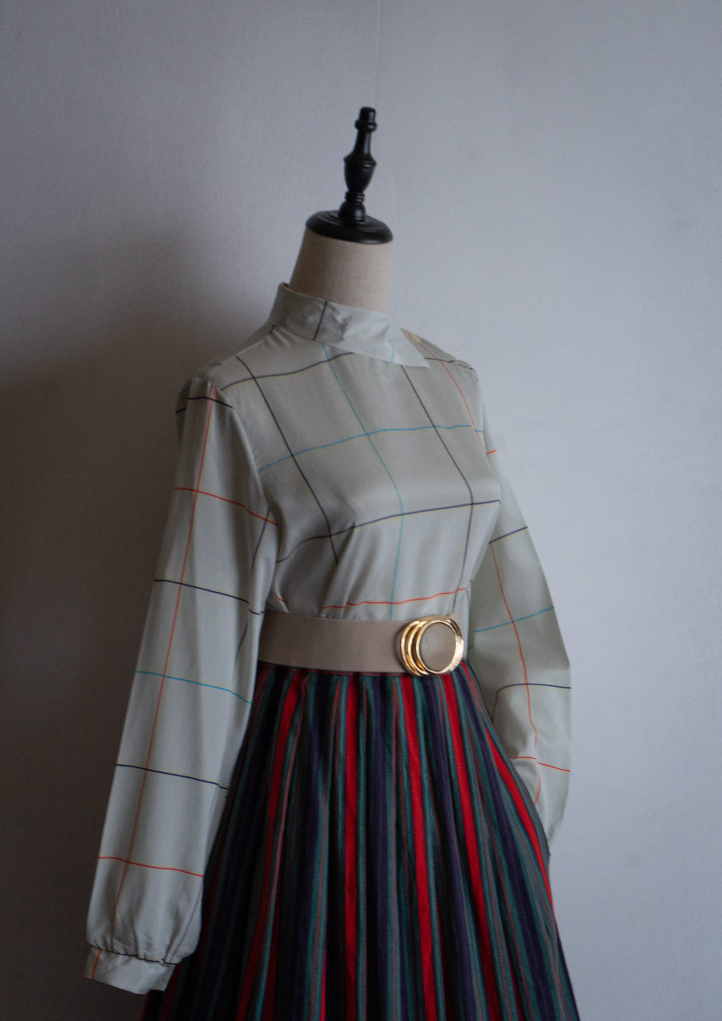 80's Unique Check Pattern Glossy Light Gray Blouse