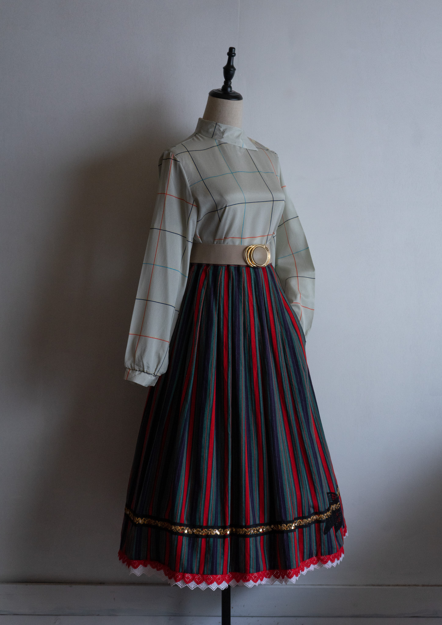 80's France Stand Frill Collar Stripe Pattern Red Blouse