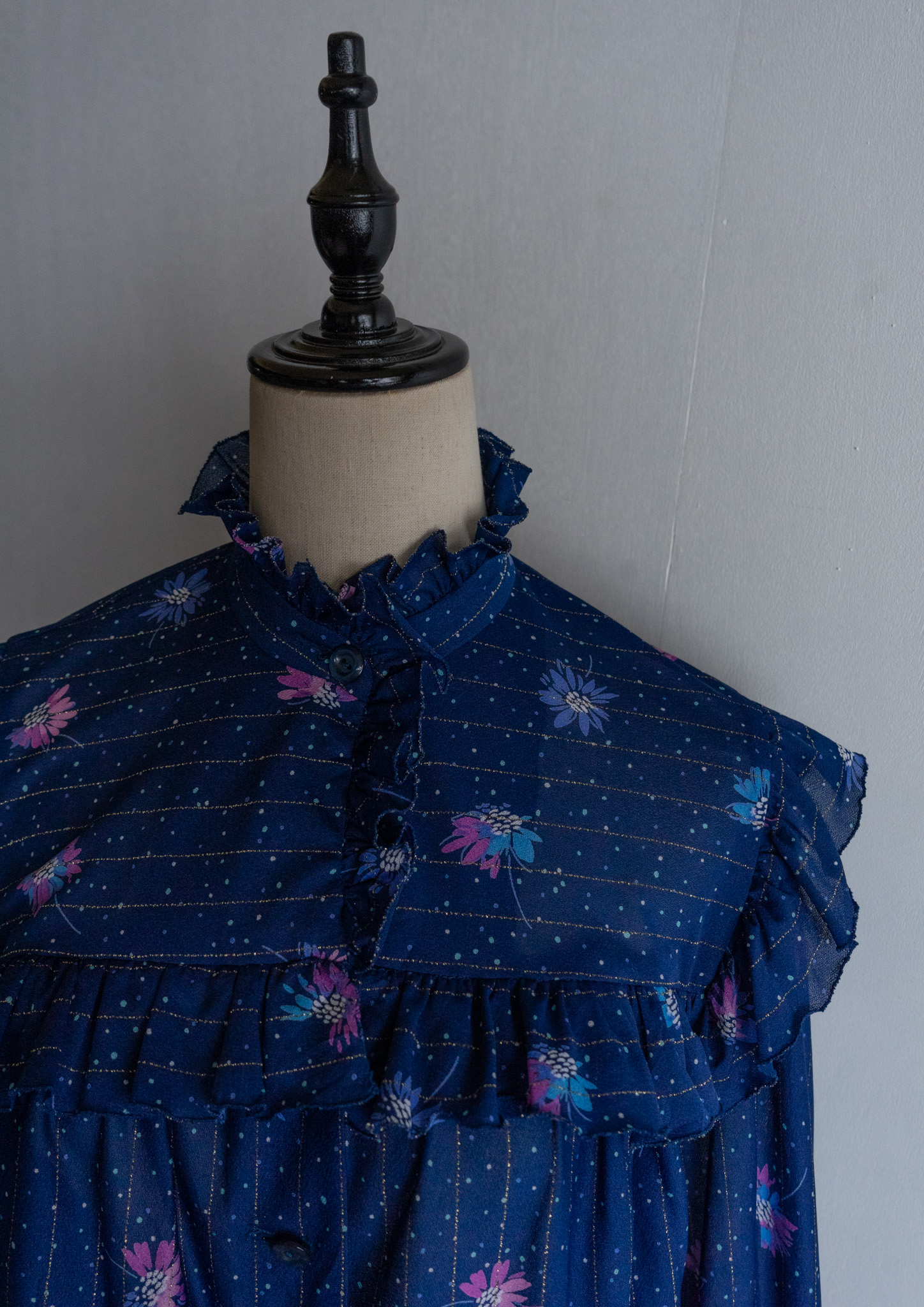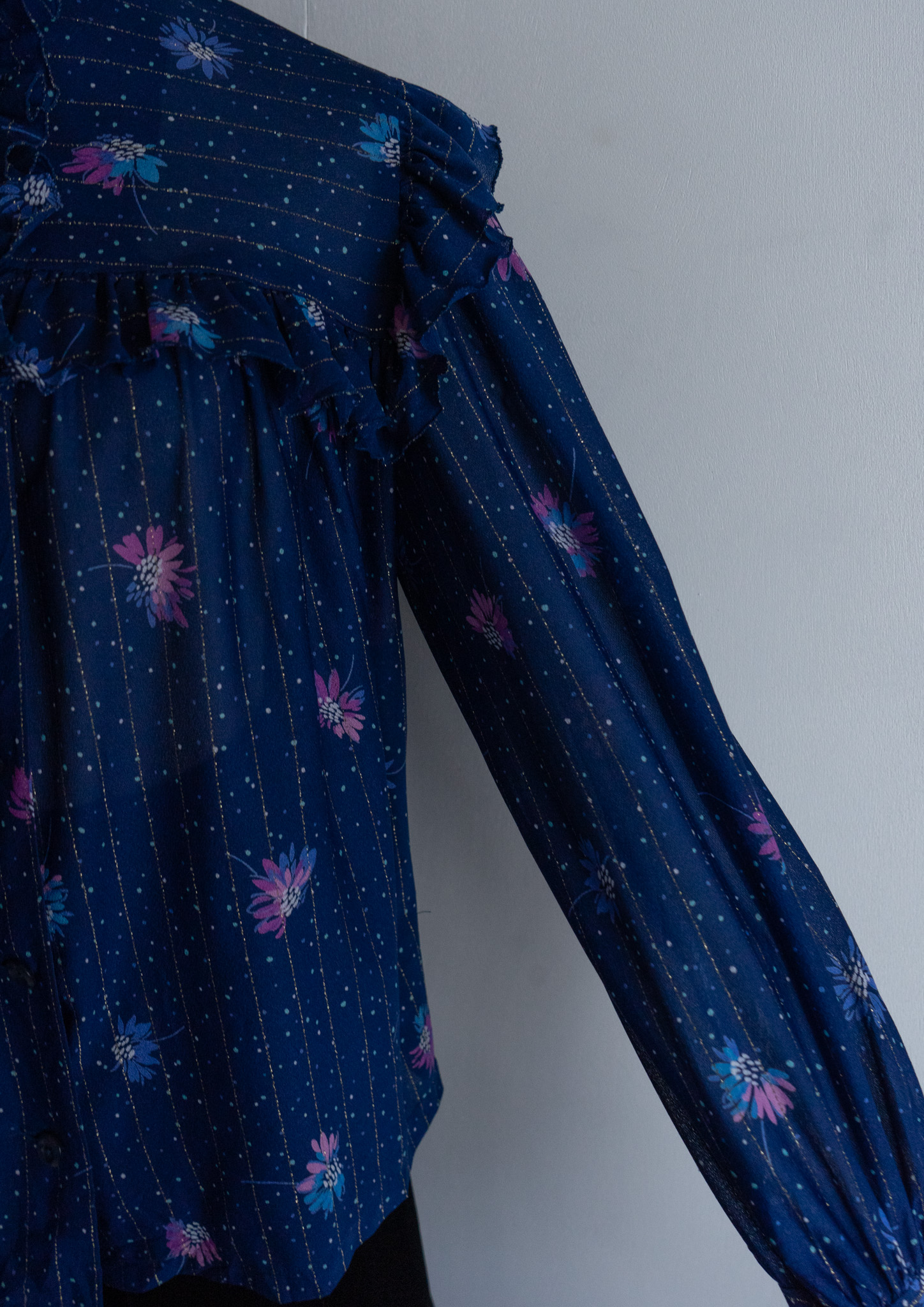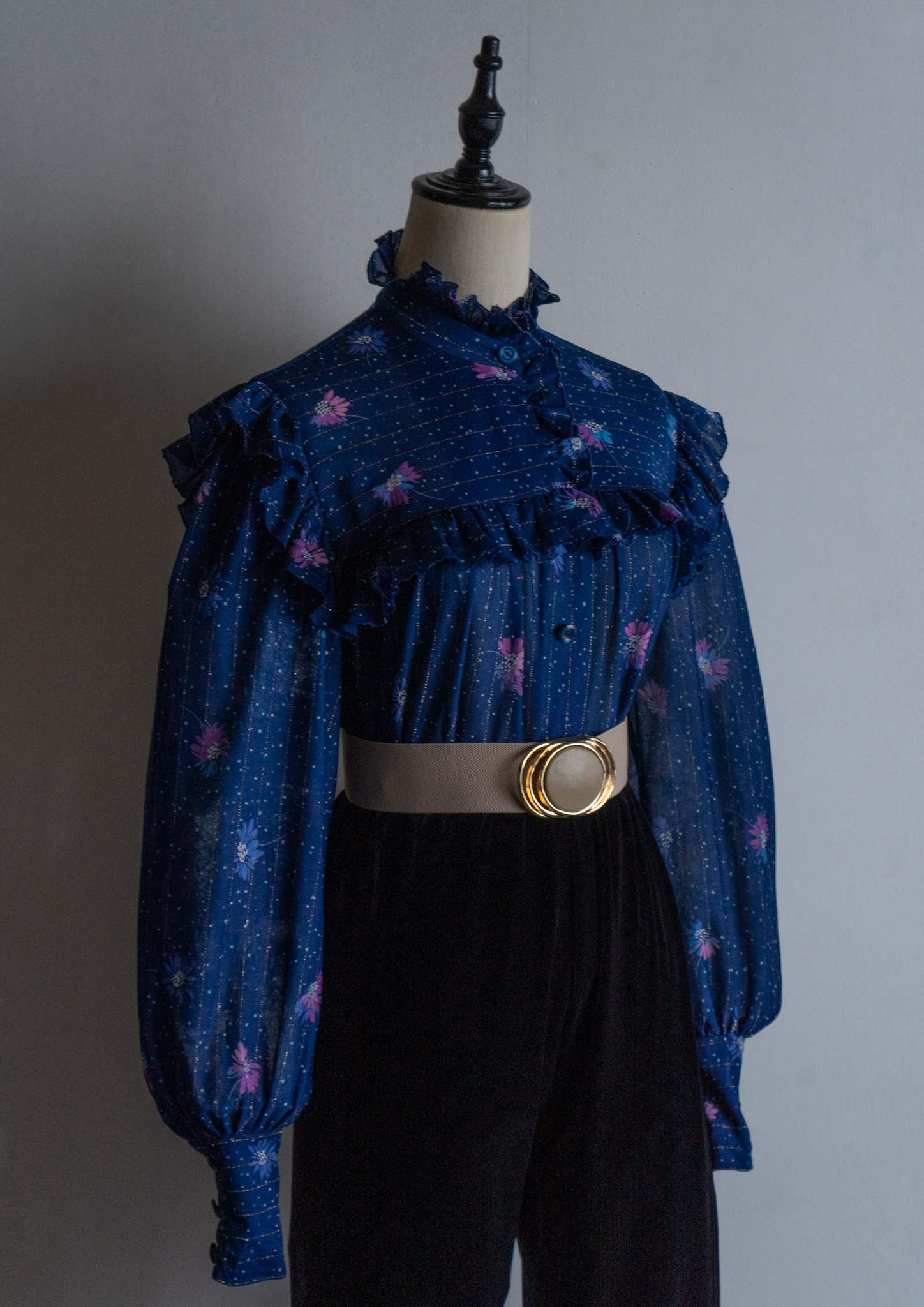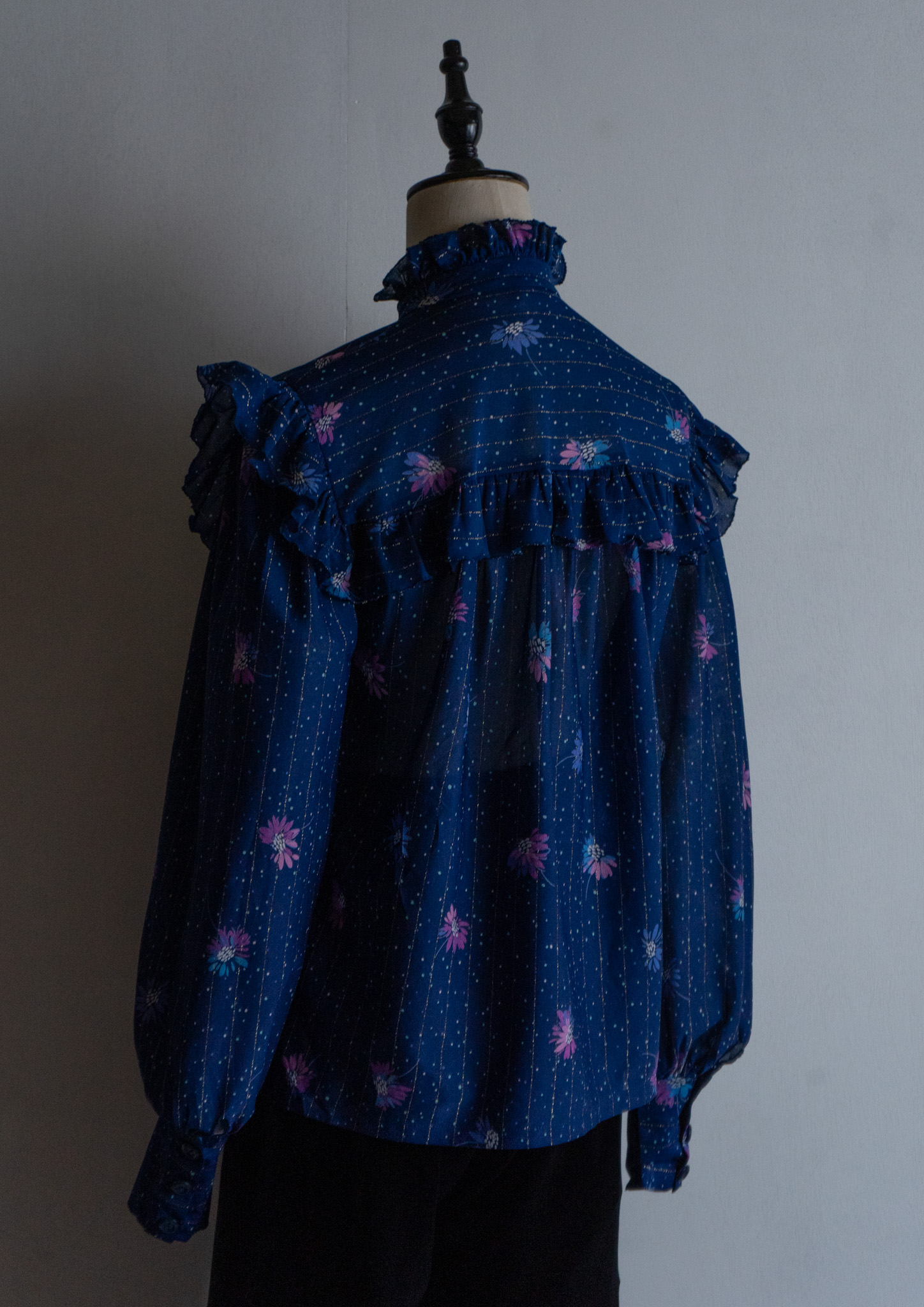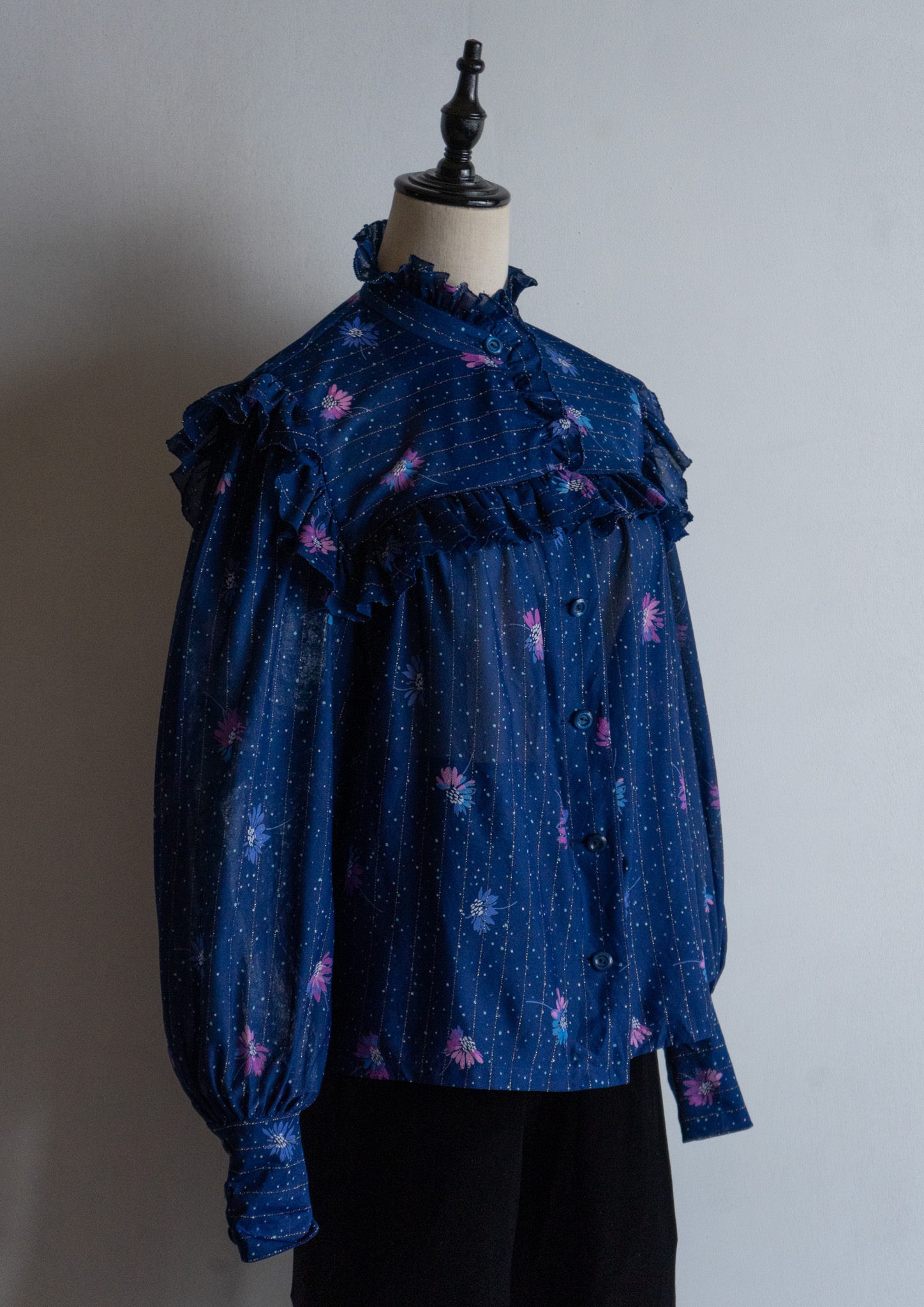 80's Flower & Glitter Stripe Navy Frill Blouse