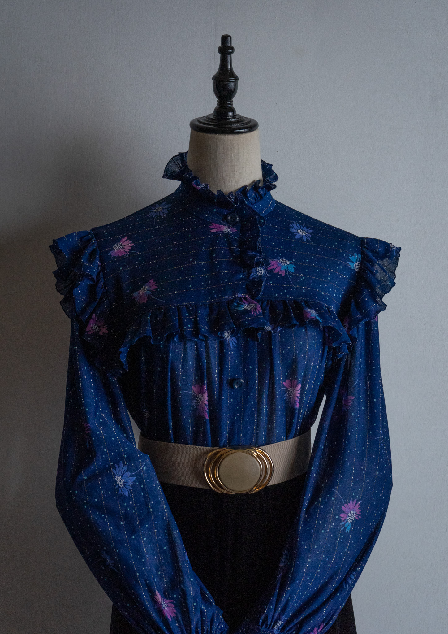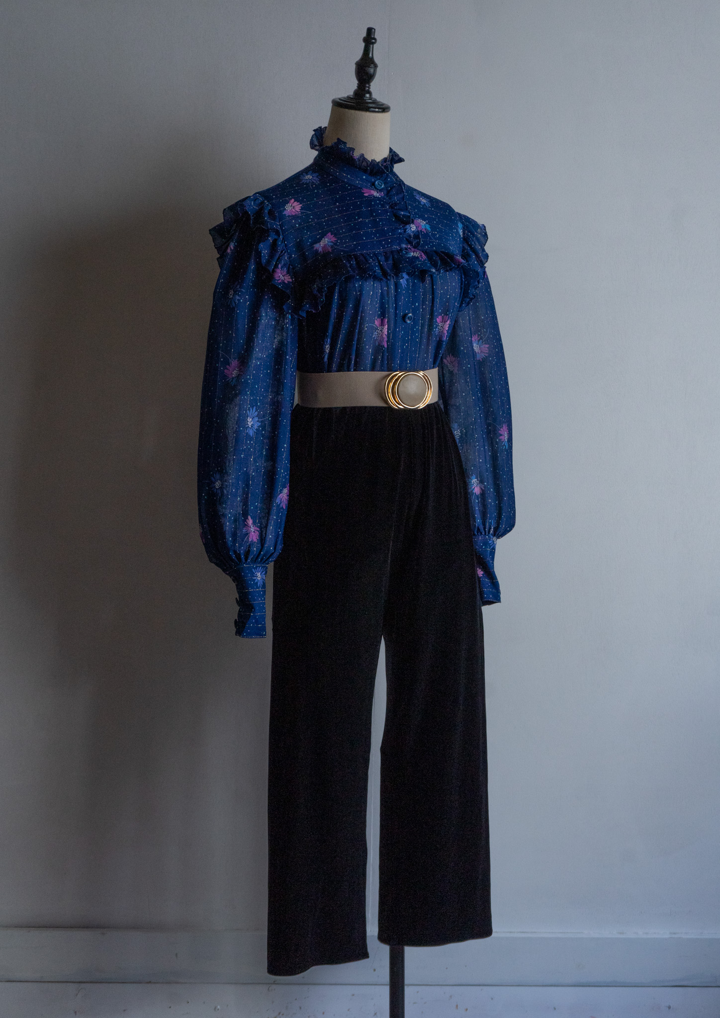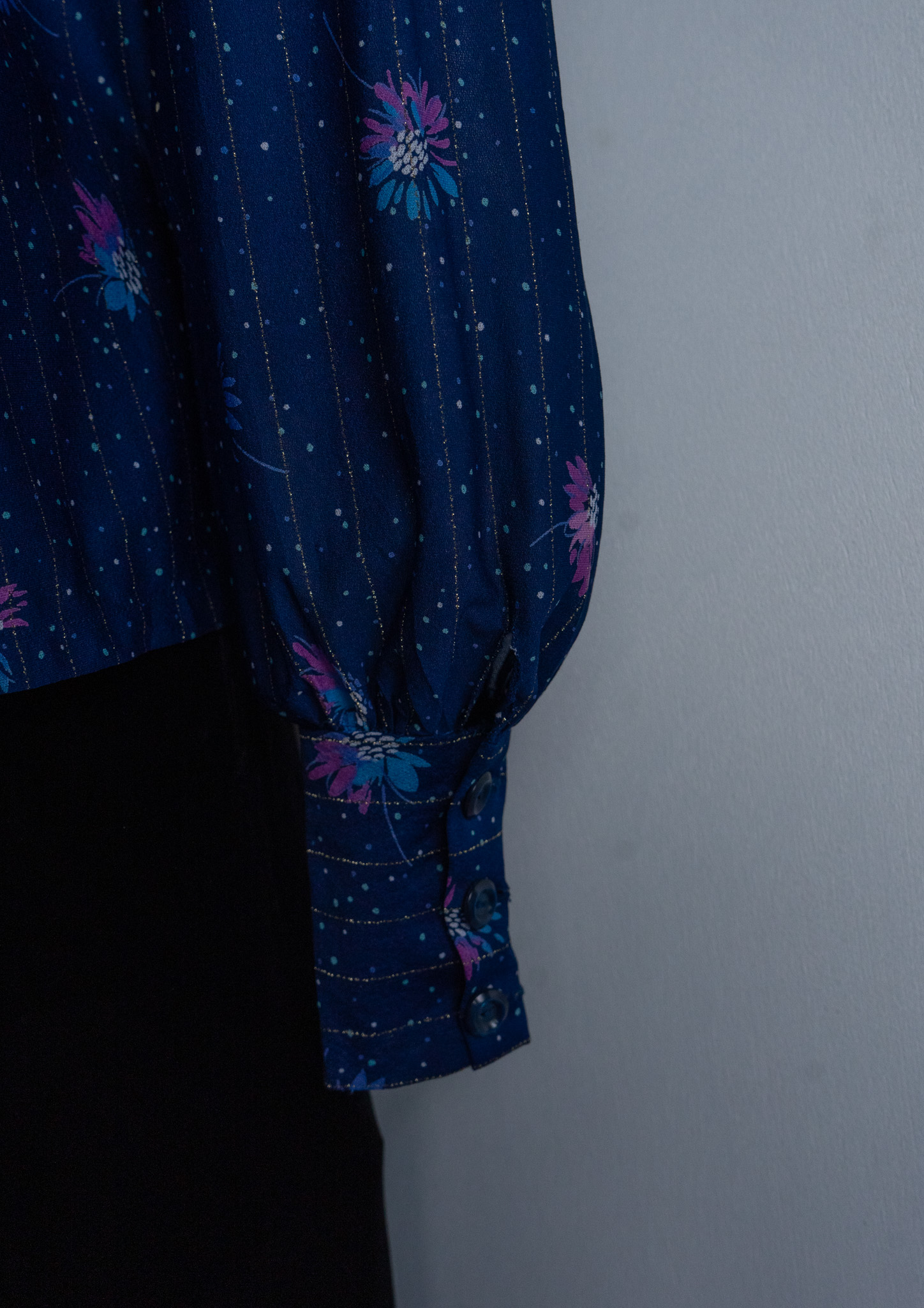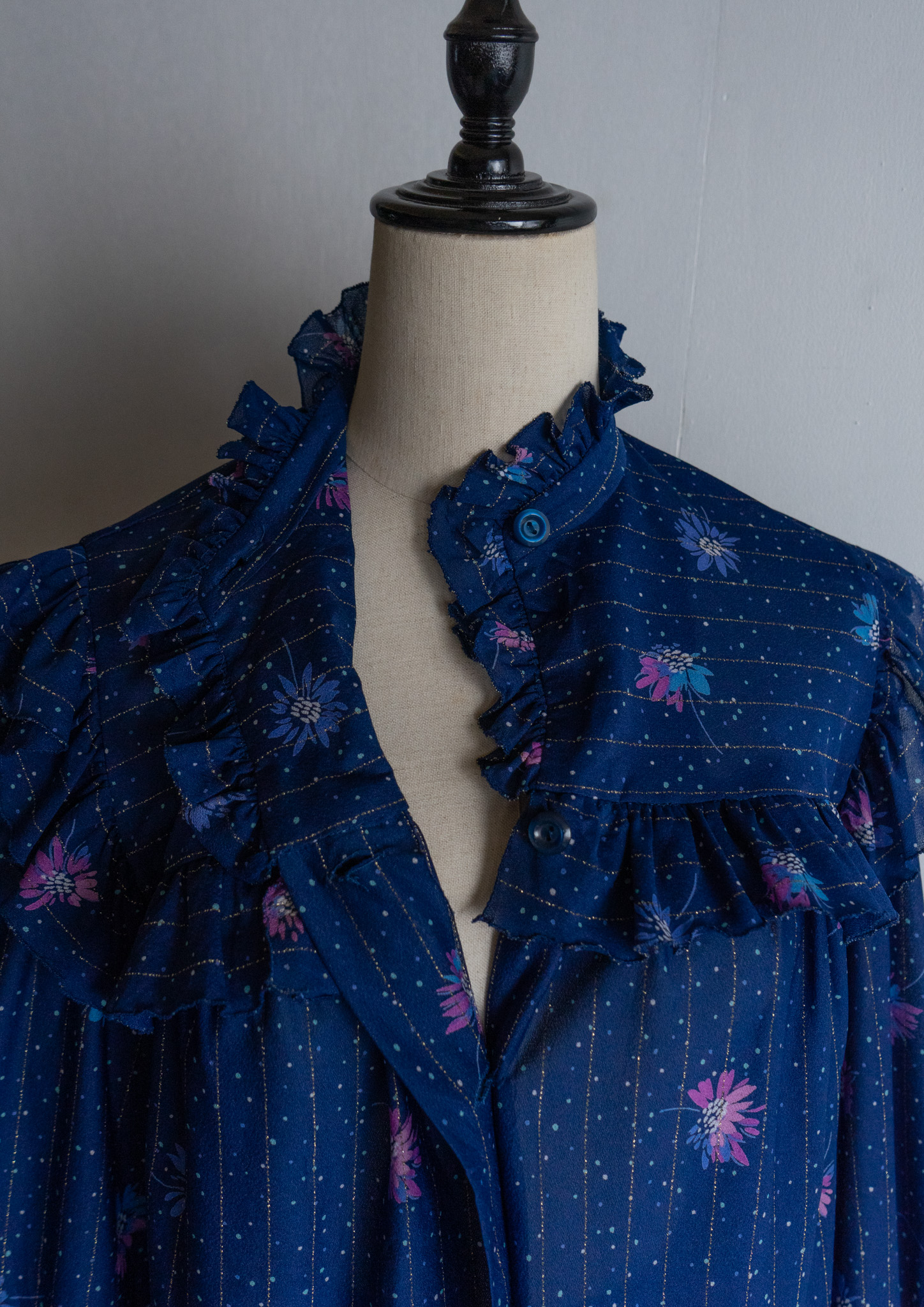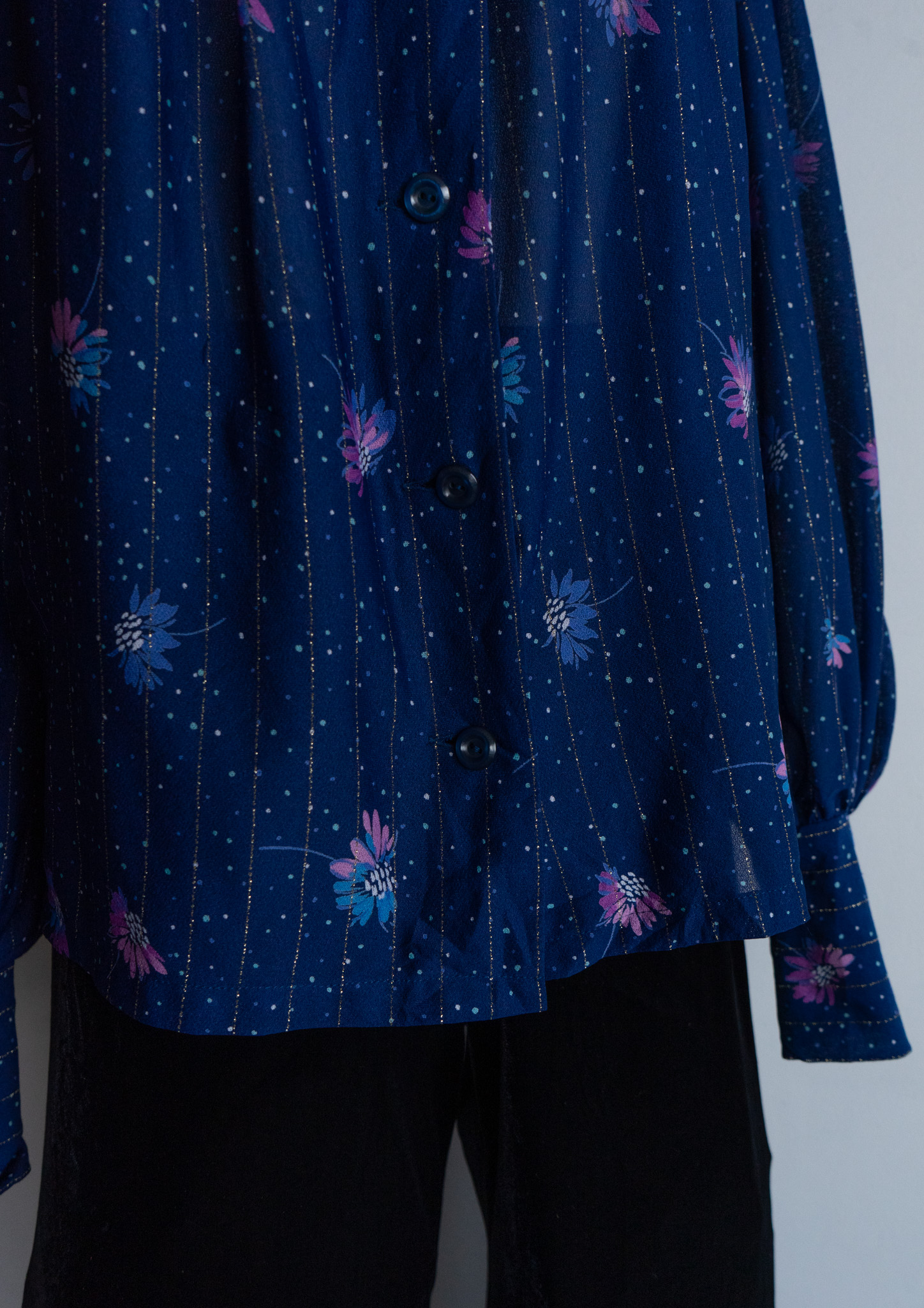 80's Flower & Glitter Stripe Navy Frill Blouse
