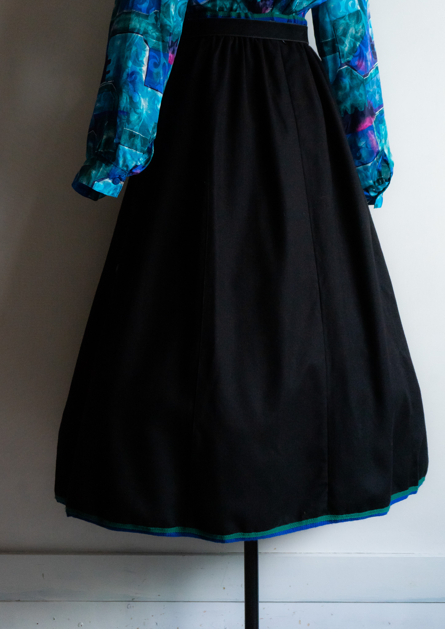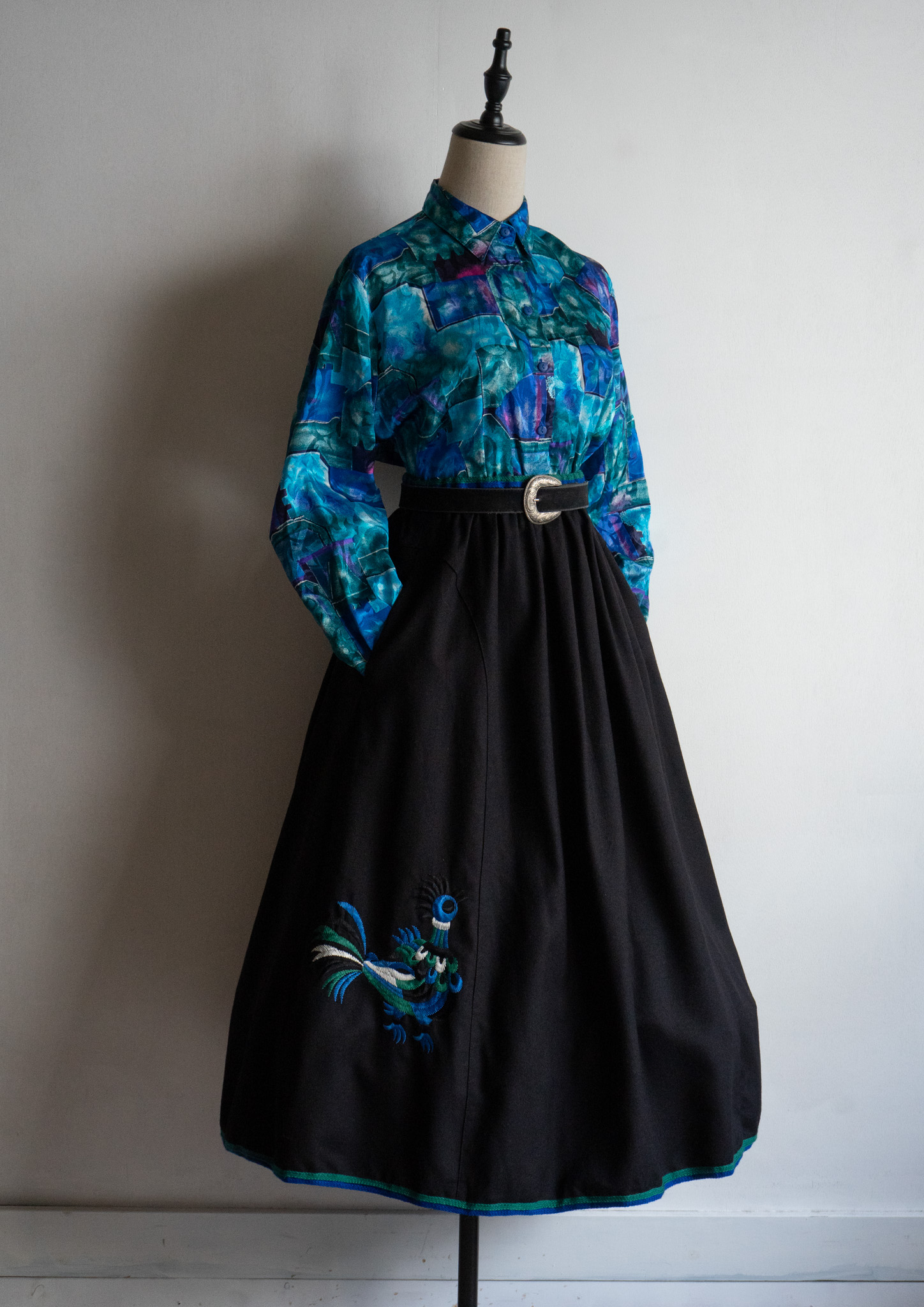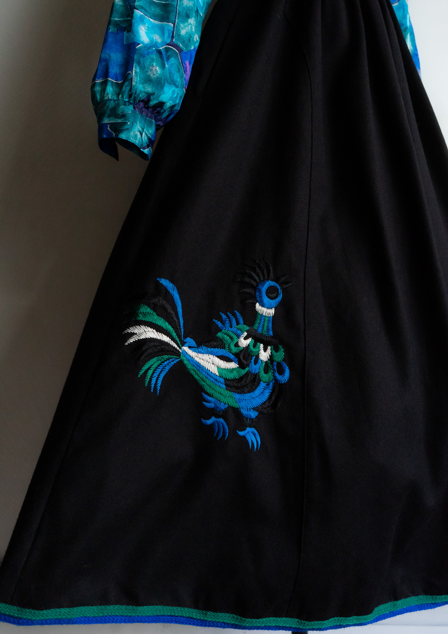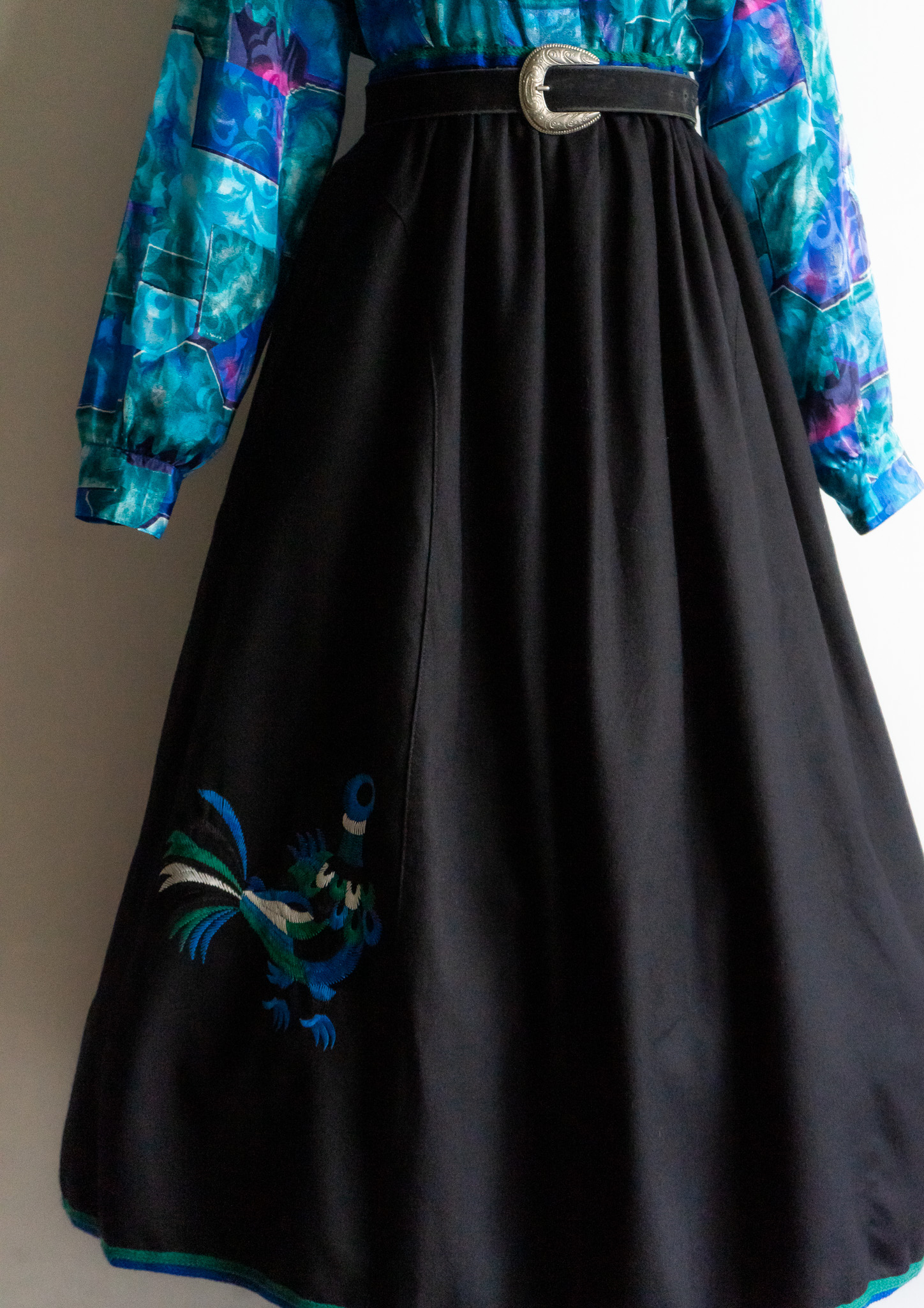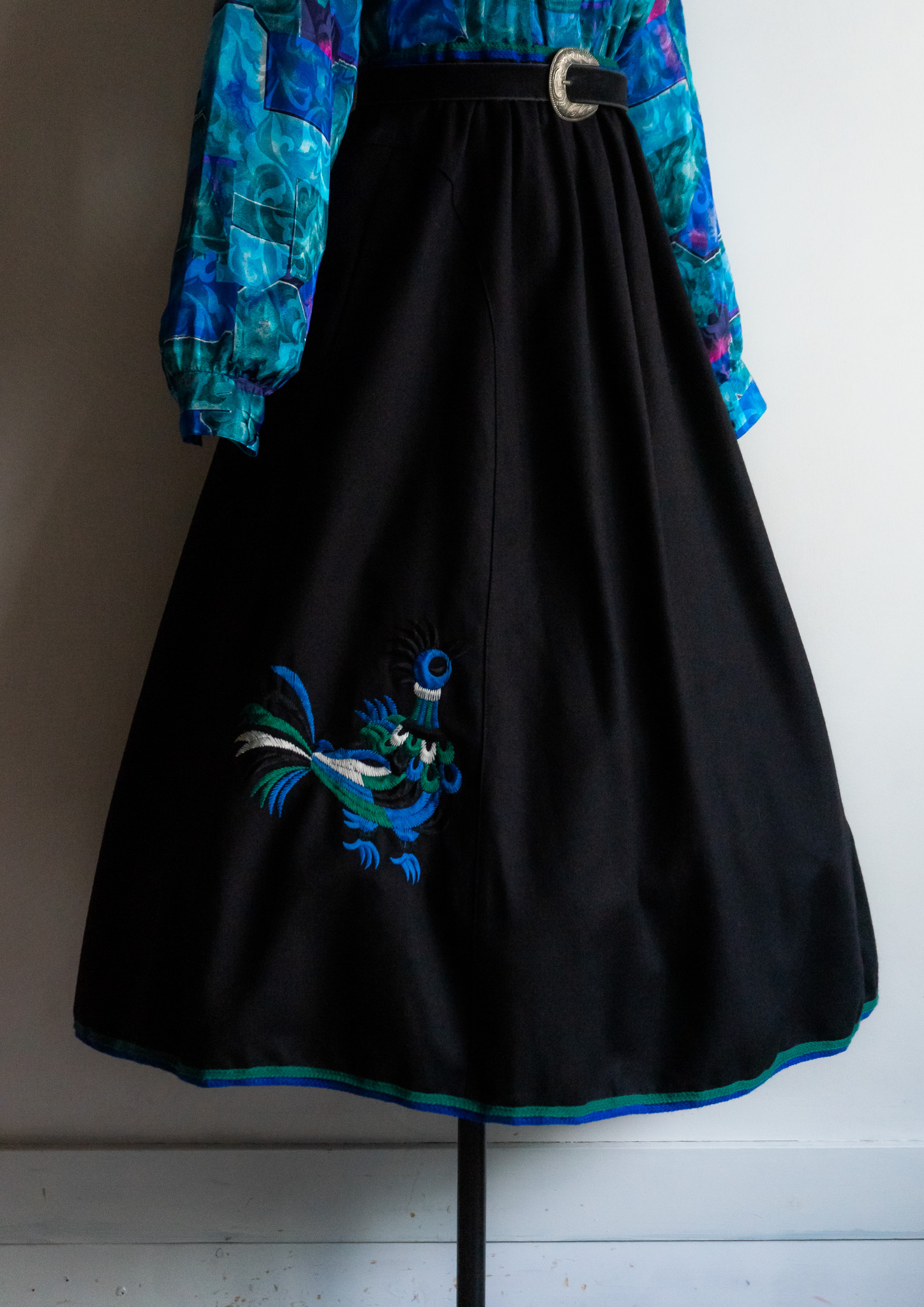 80's Euro Unique Peacock Embroidery Black Wool Tyrol Skirt