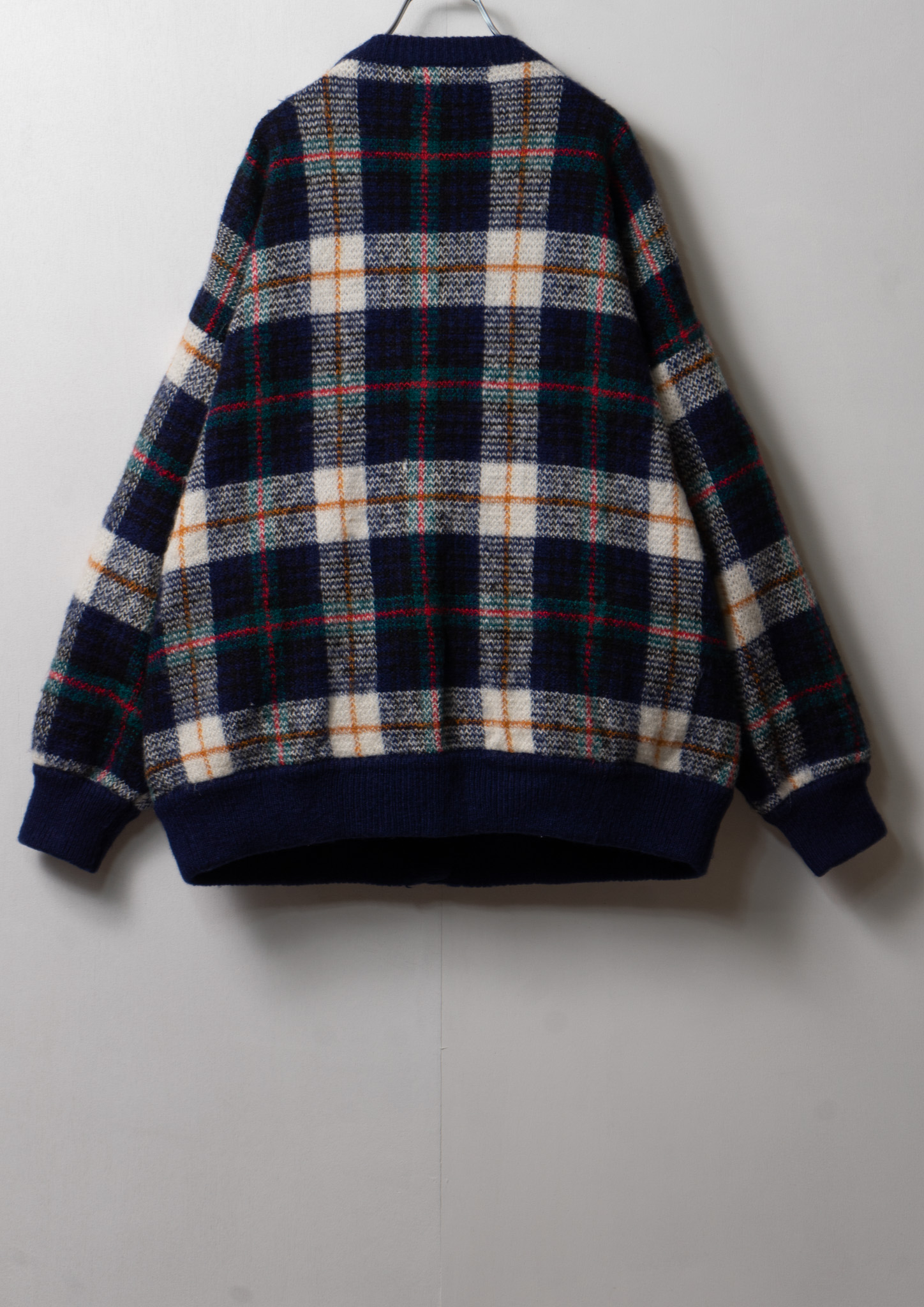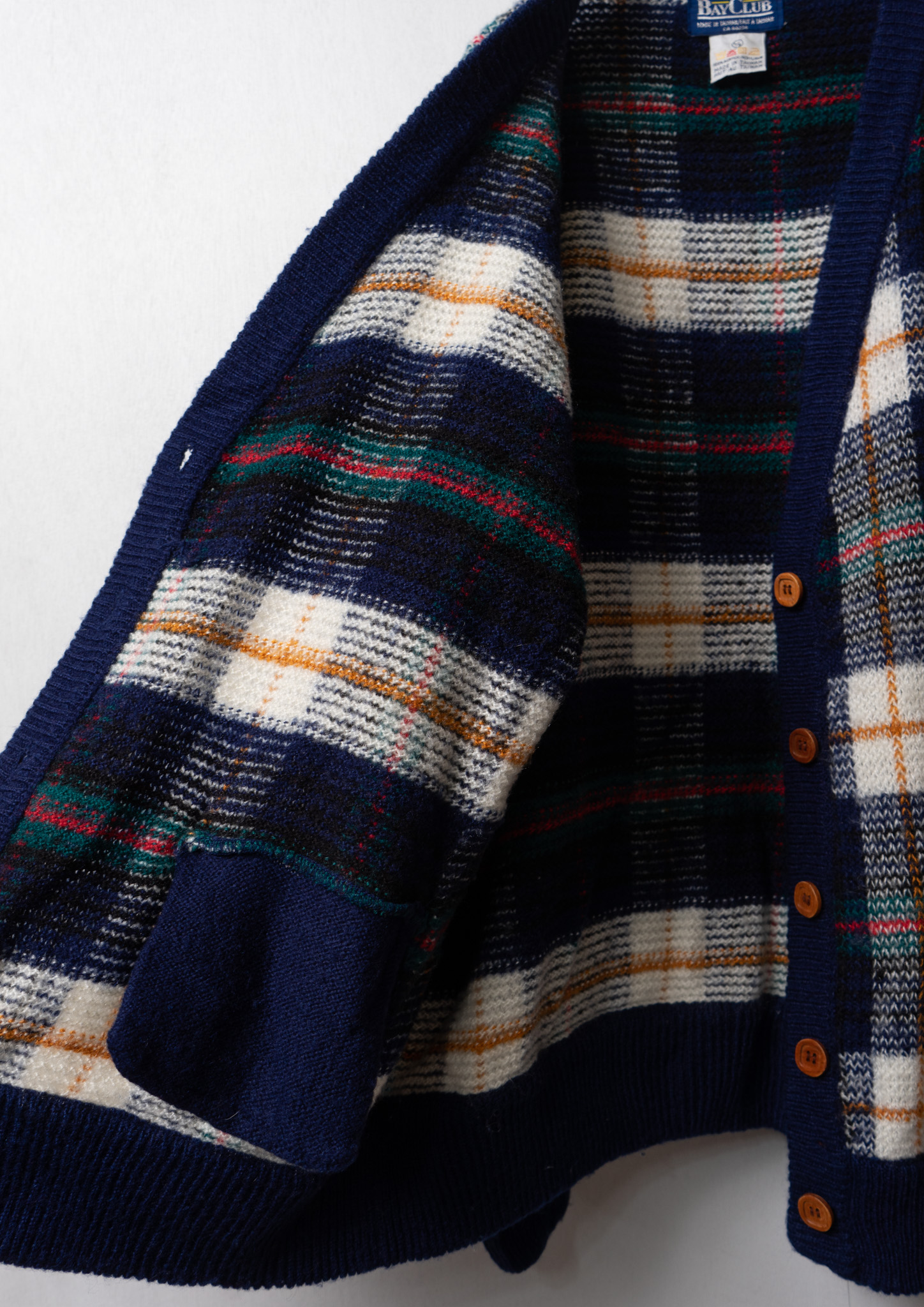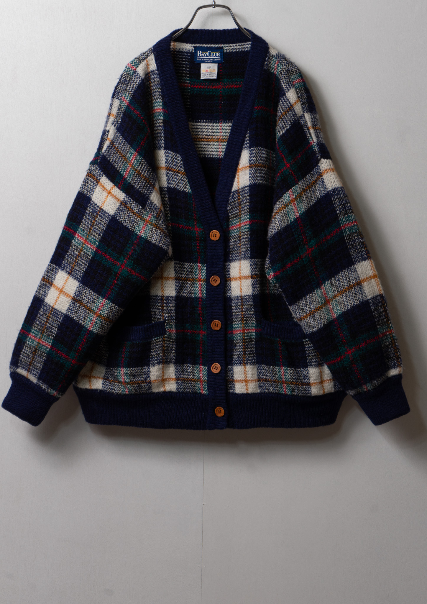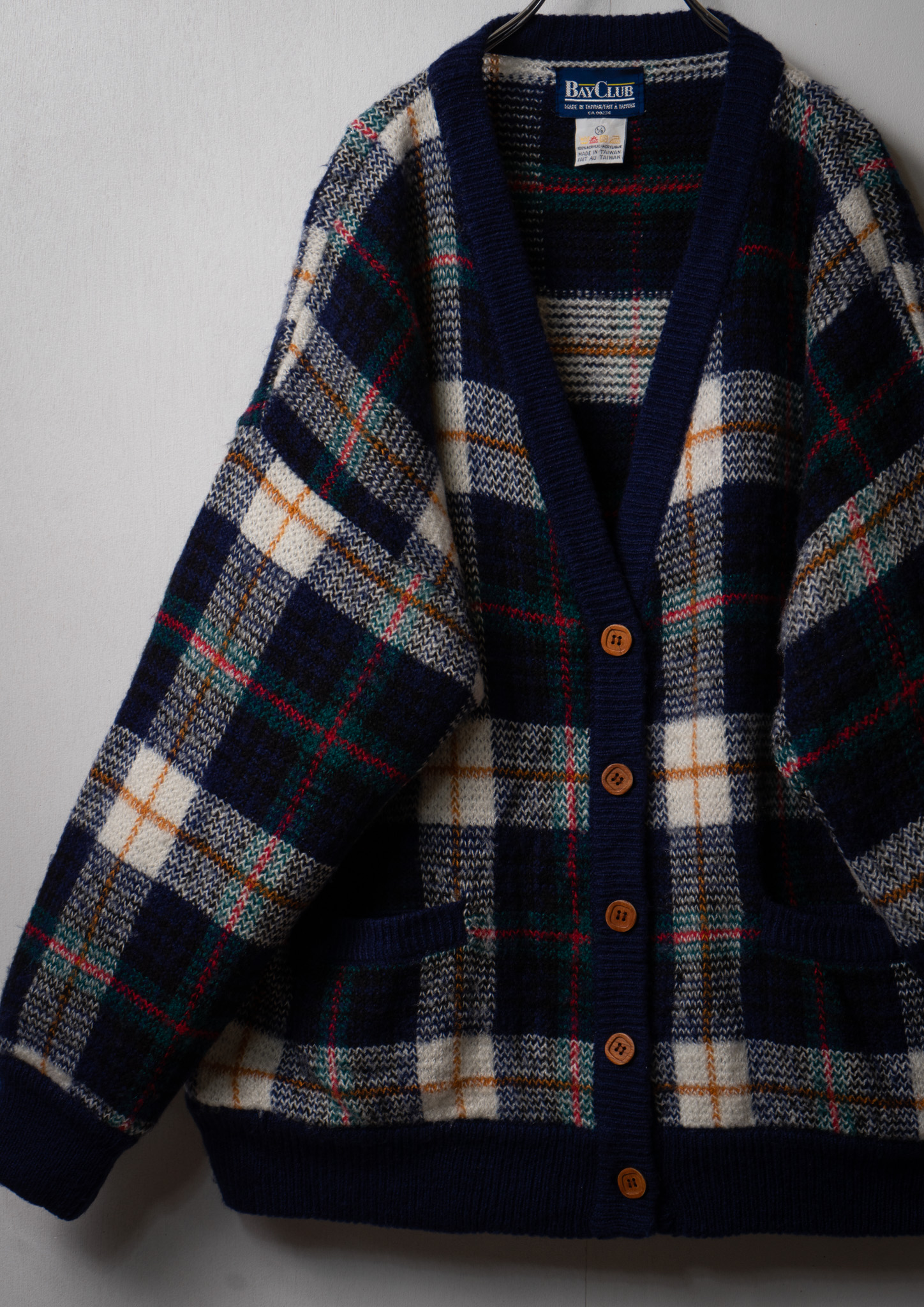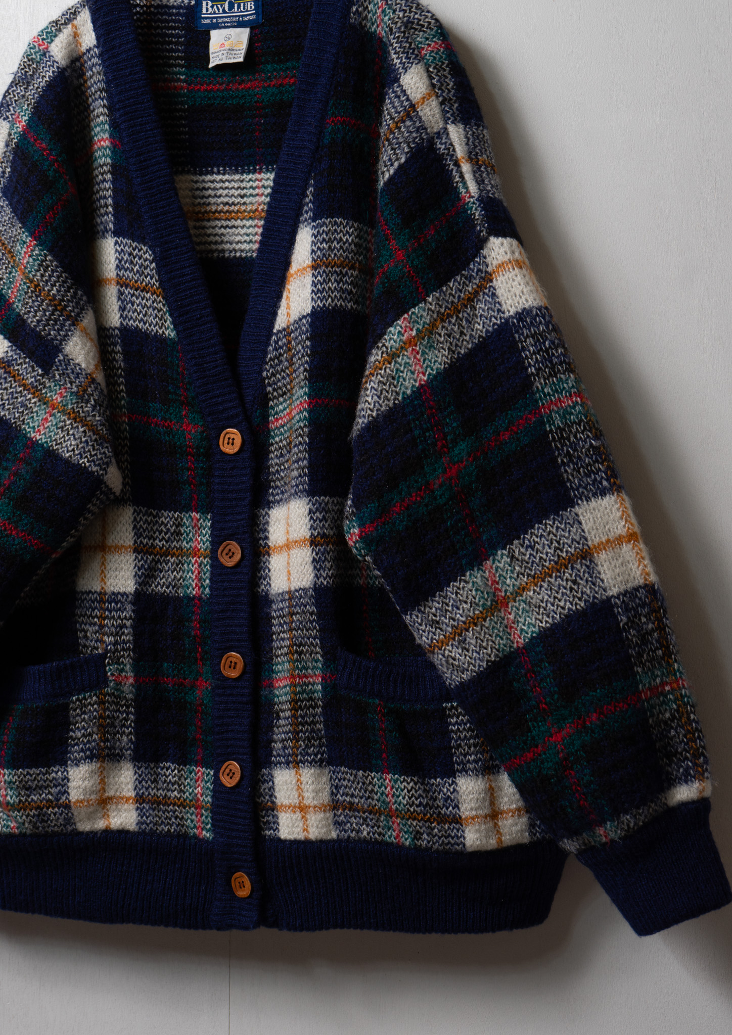 80's Double Pocket Design Blue Check Pattern Knit Cardigan