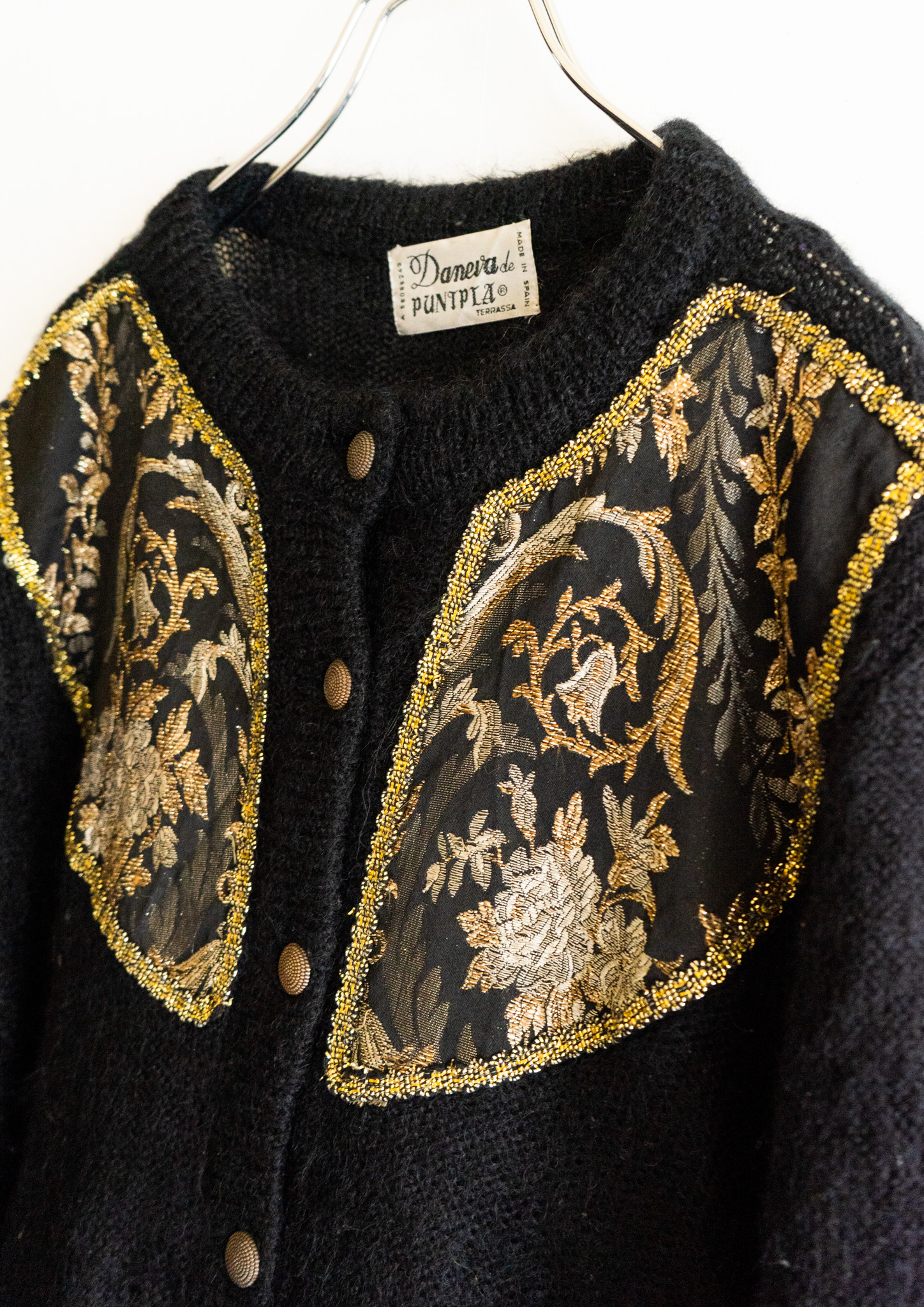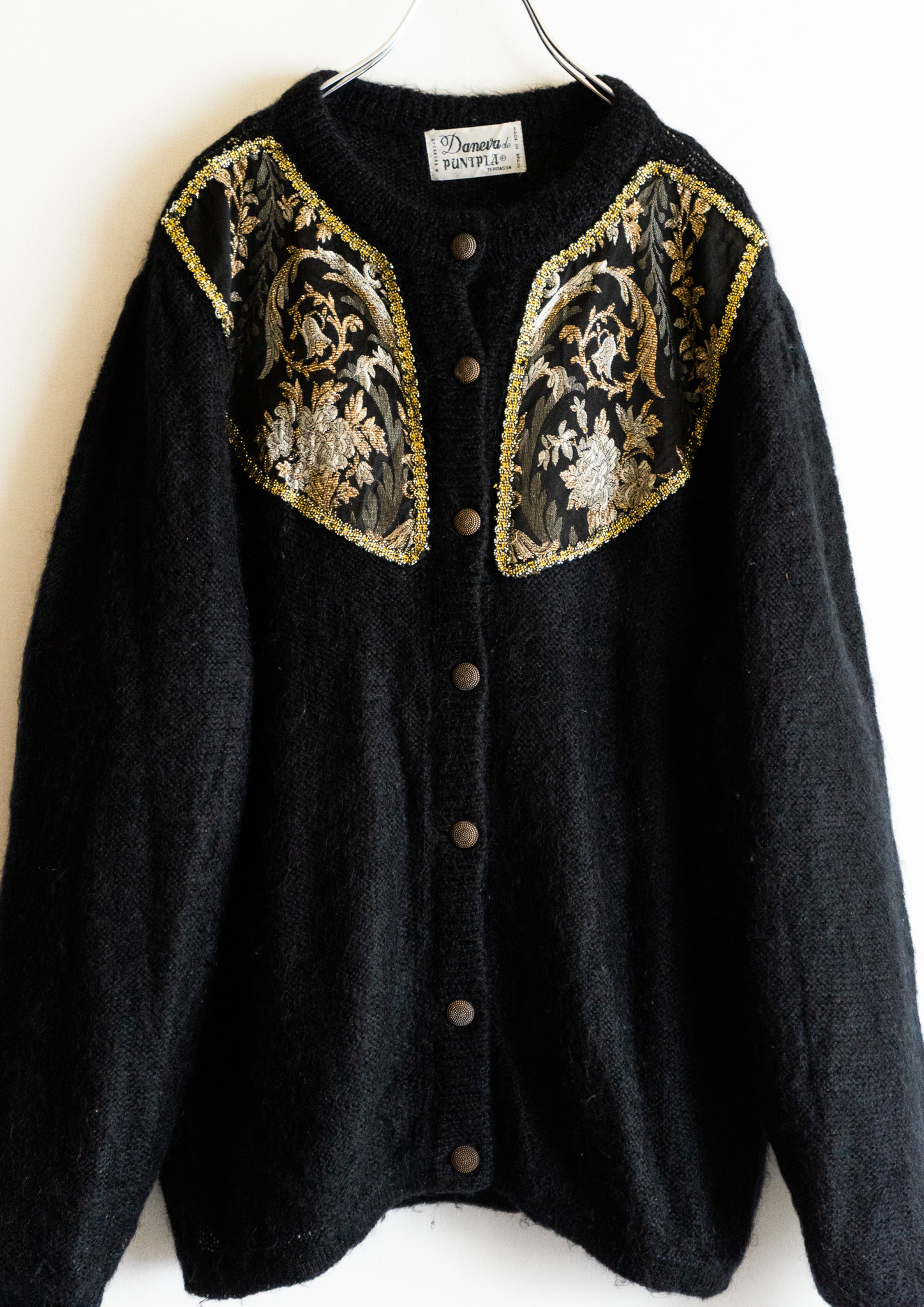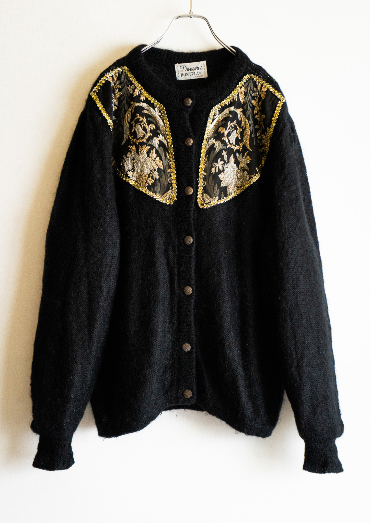 80's Spain Point Botanical Black Knit Pattern Cardigan