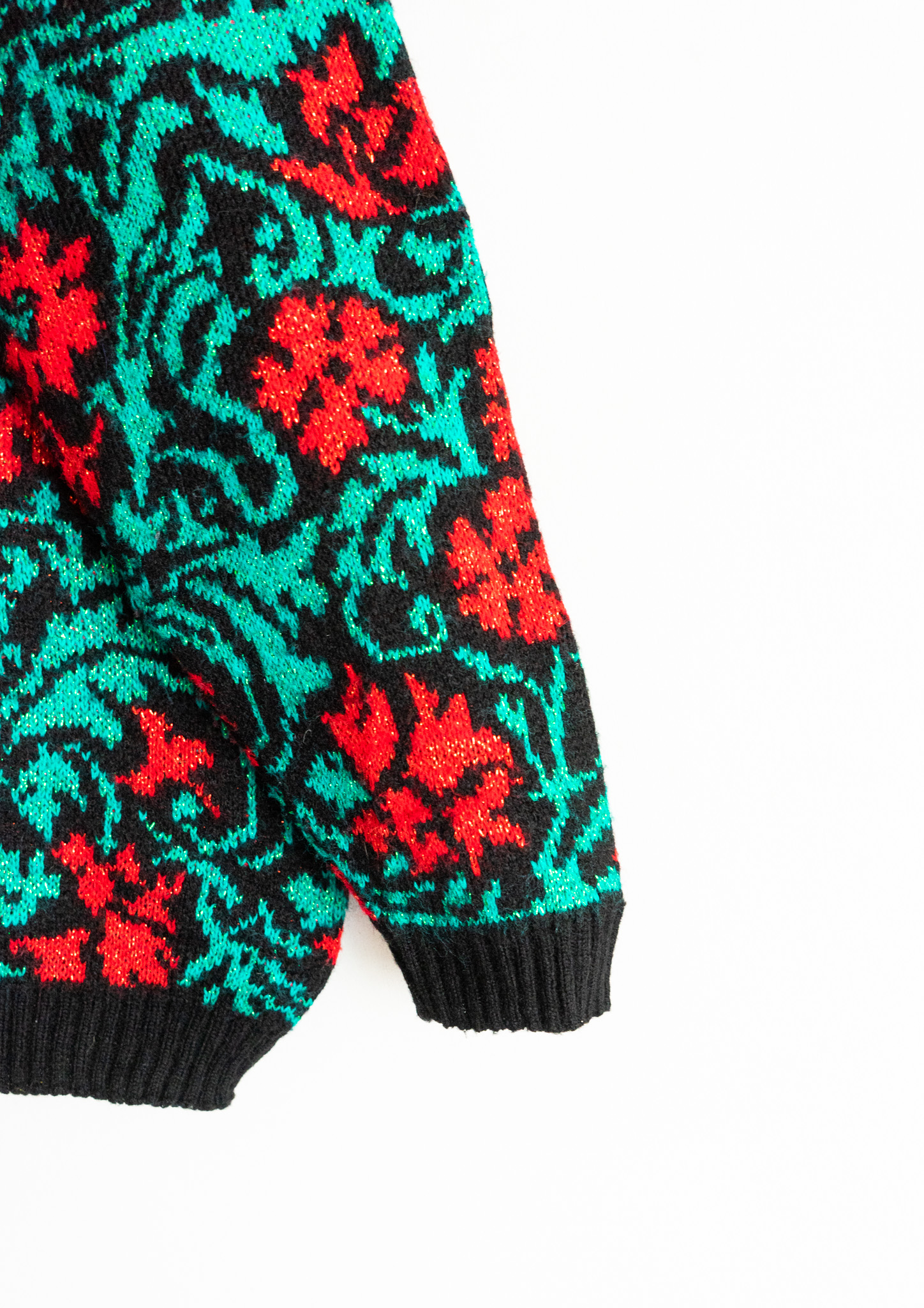 80's Red × Green Botanical Lame Mix Pattern Black Sweater