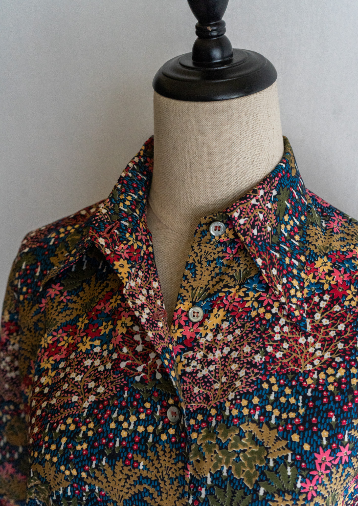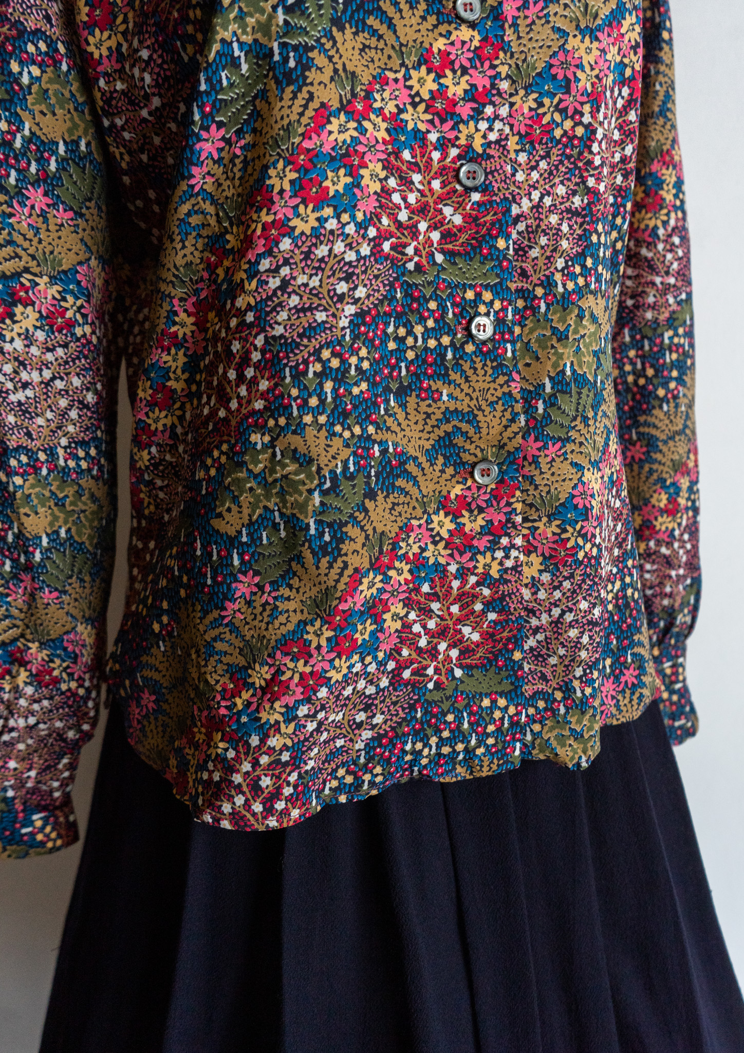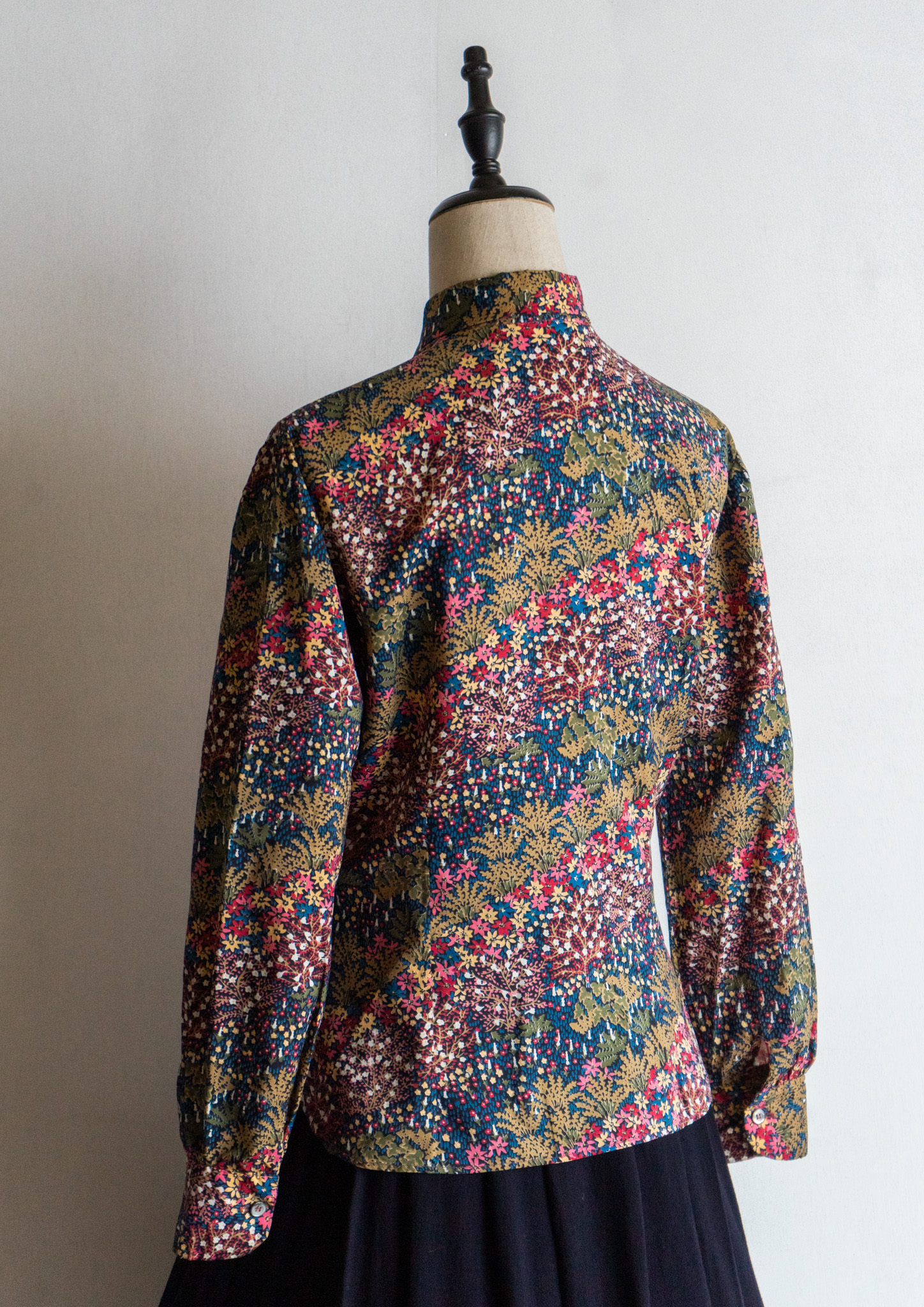 80's Rose Pattern Glossy Red Silk Bow-tie Blouse
