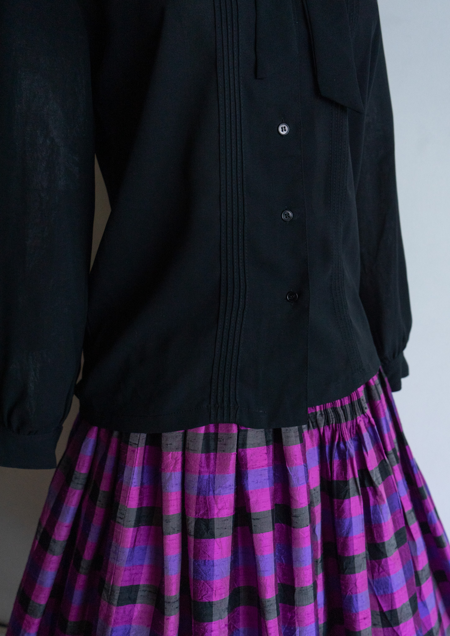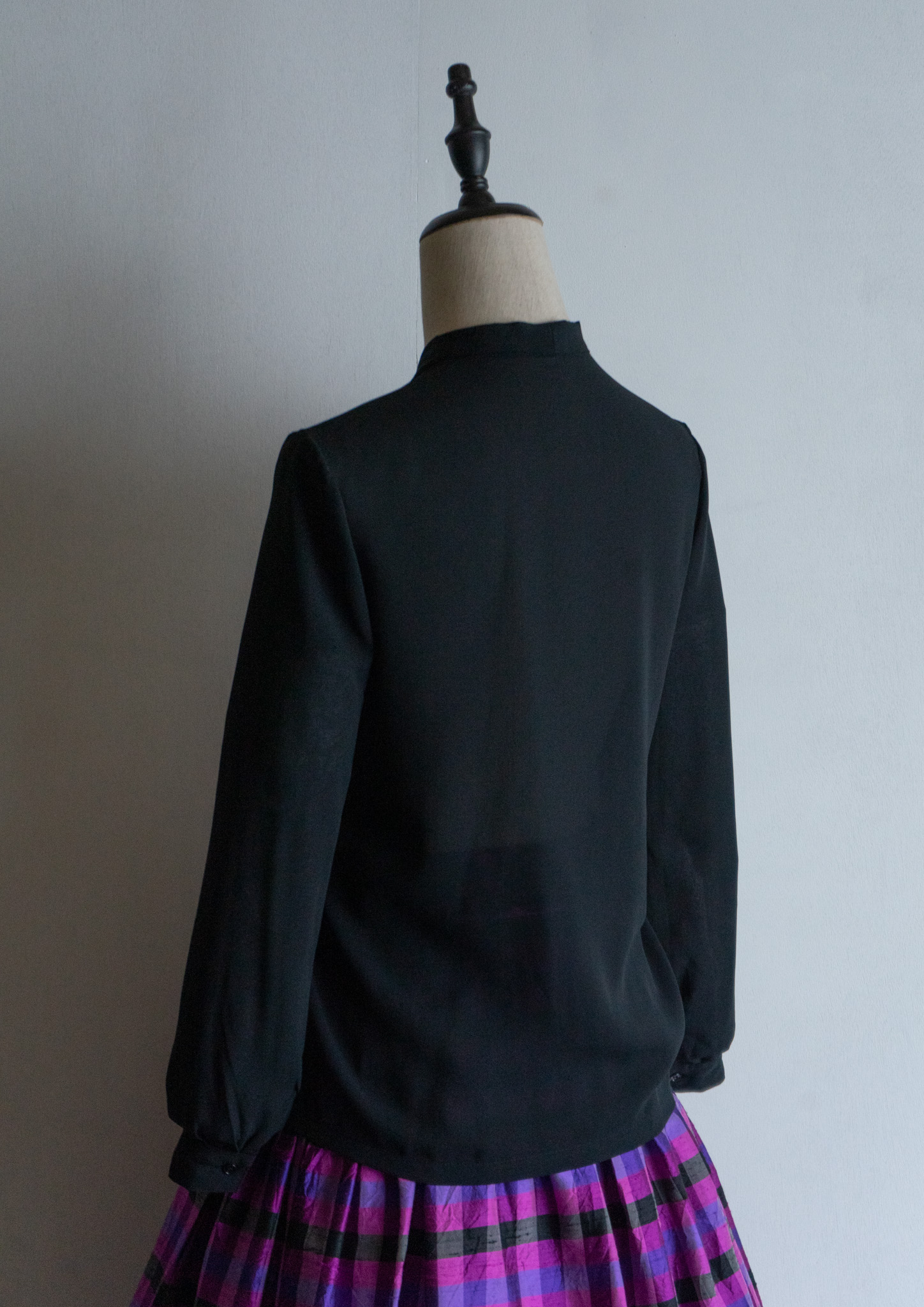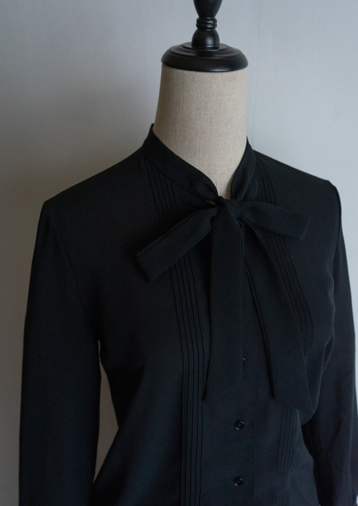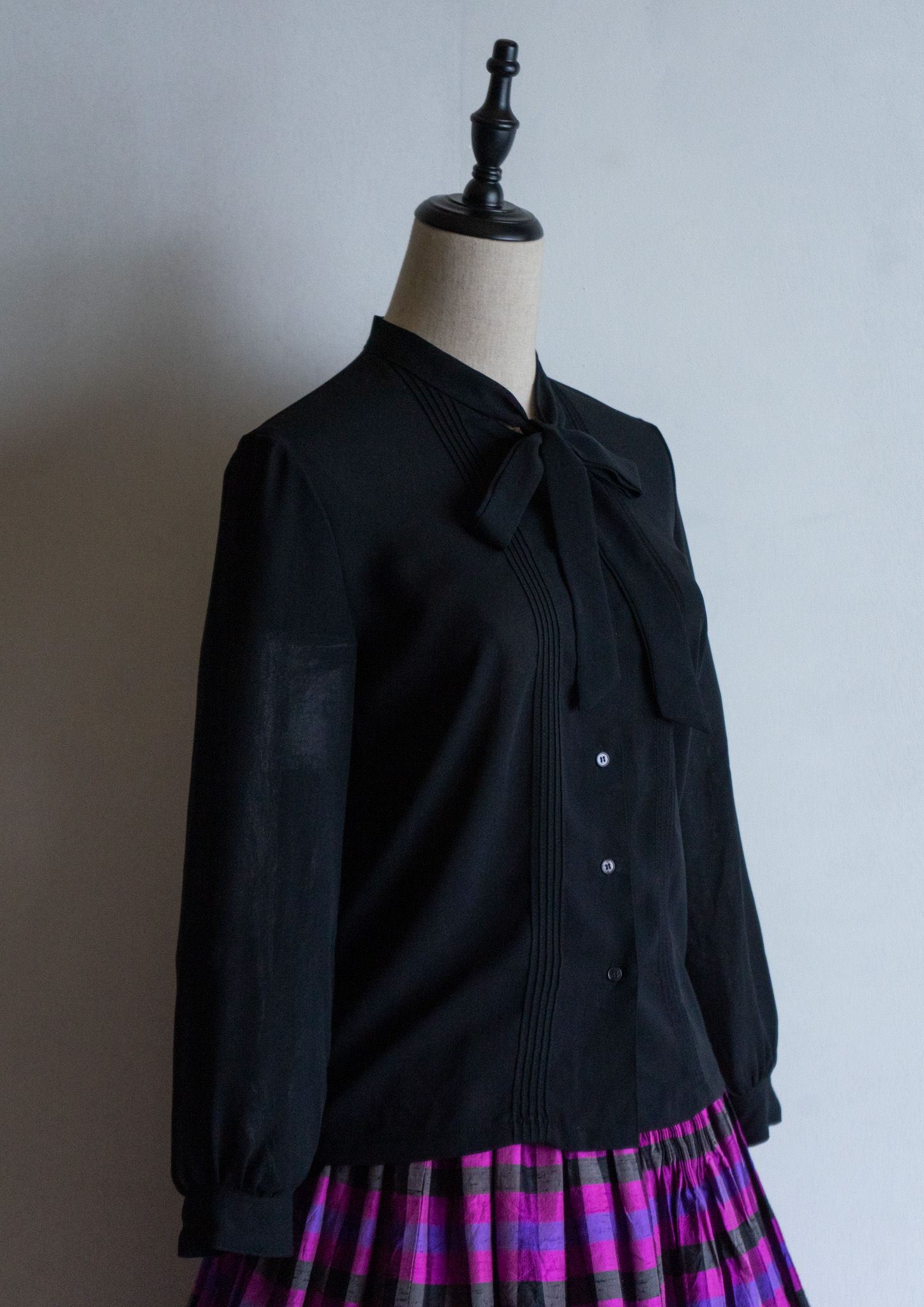 90's Pin Tuck Design Black Sheer Bow-tie Blouse