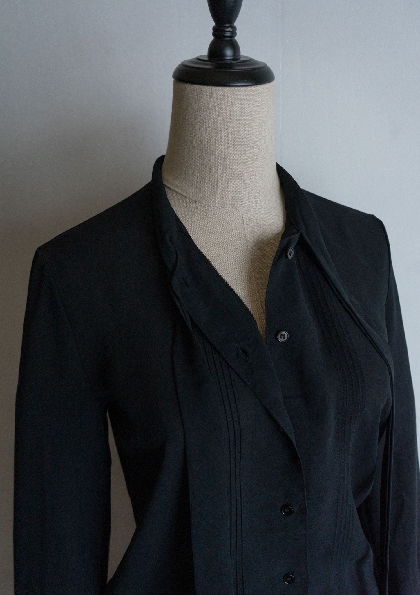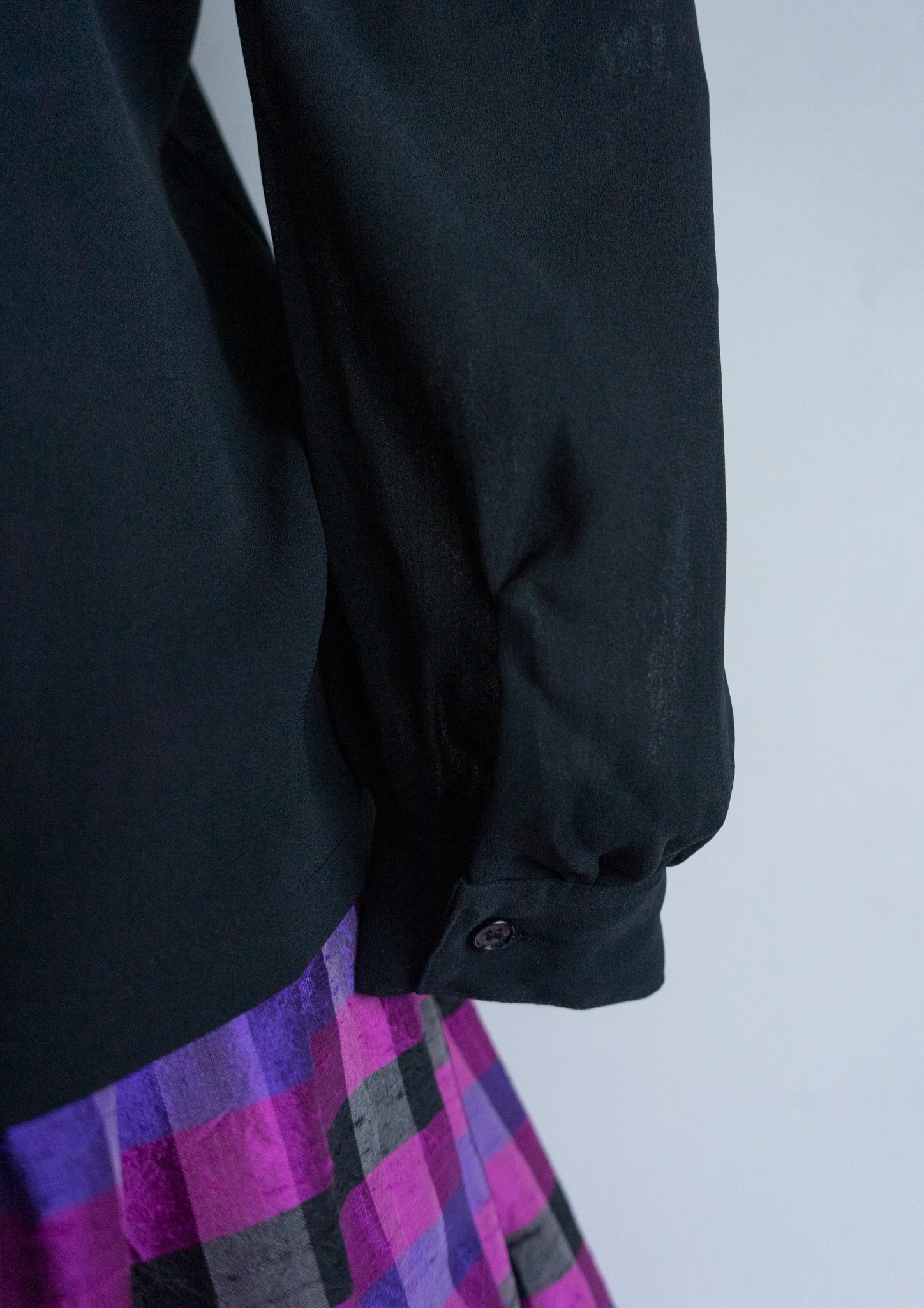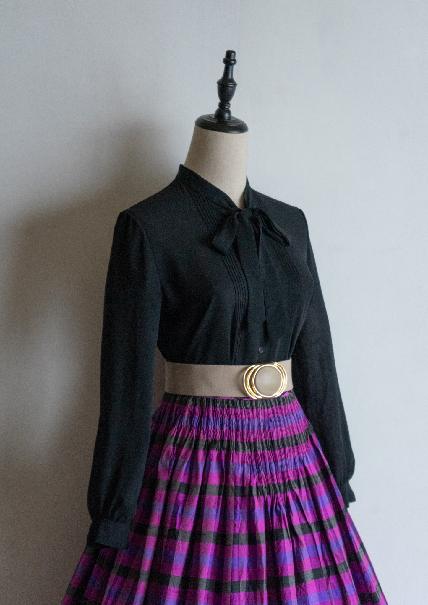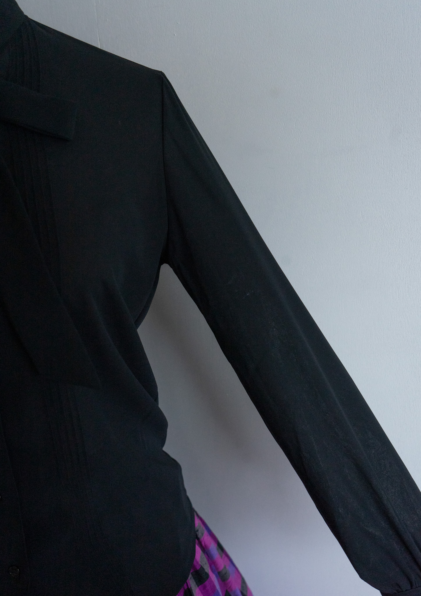 90's Pin Tuck Design Black Sheer Bow-tie Blouse