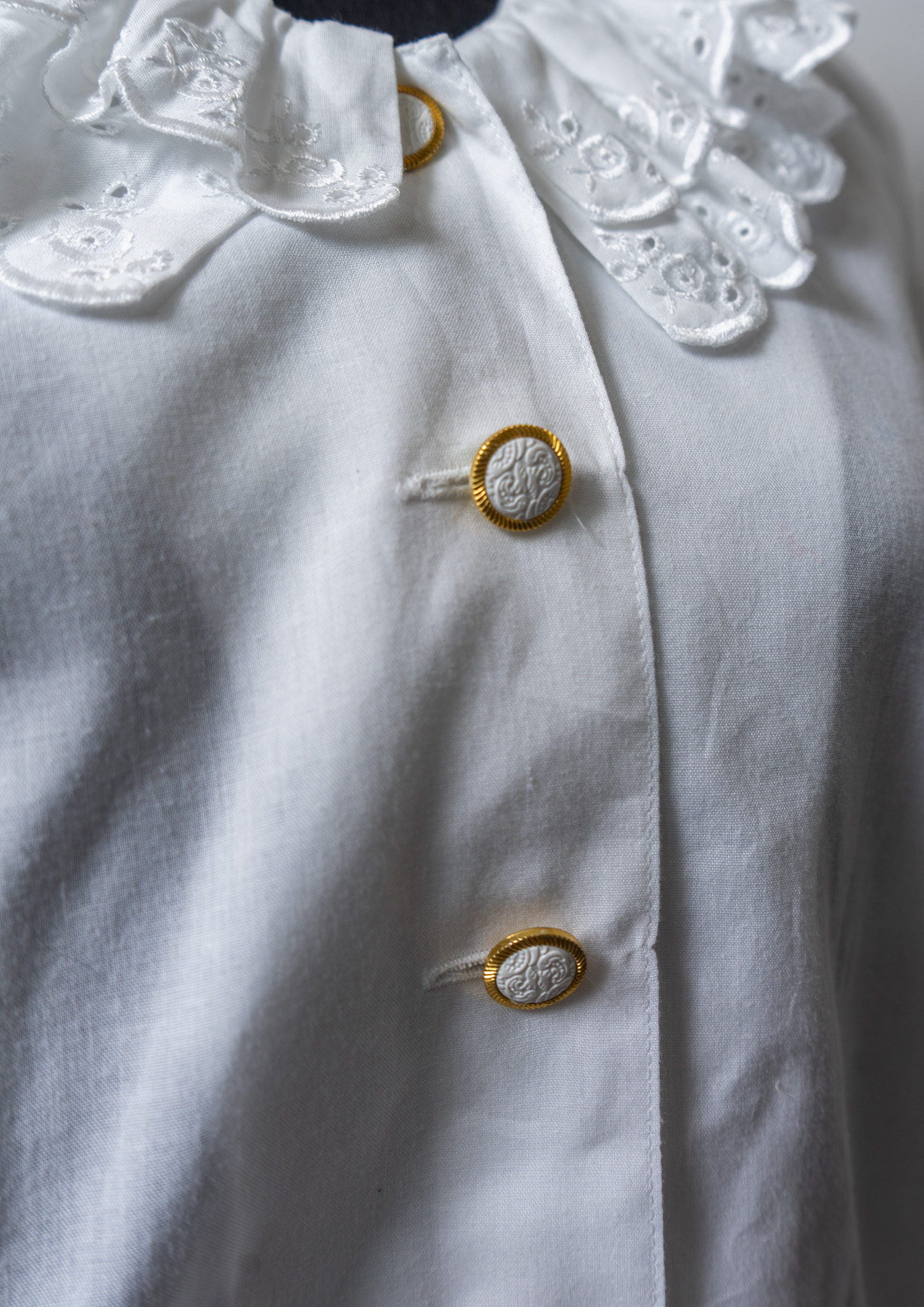 90's Euro Lace Frill Collar Decorative Button Design White Blouse