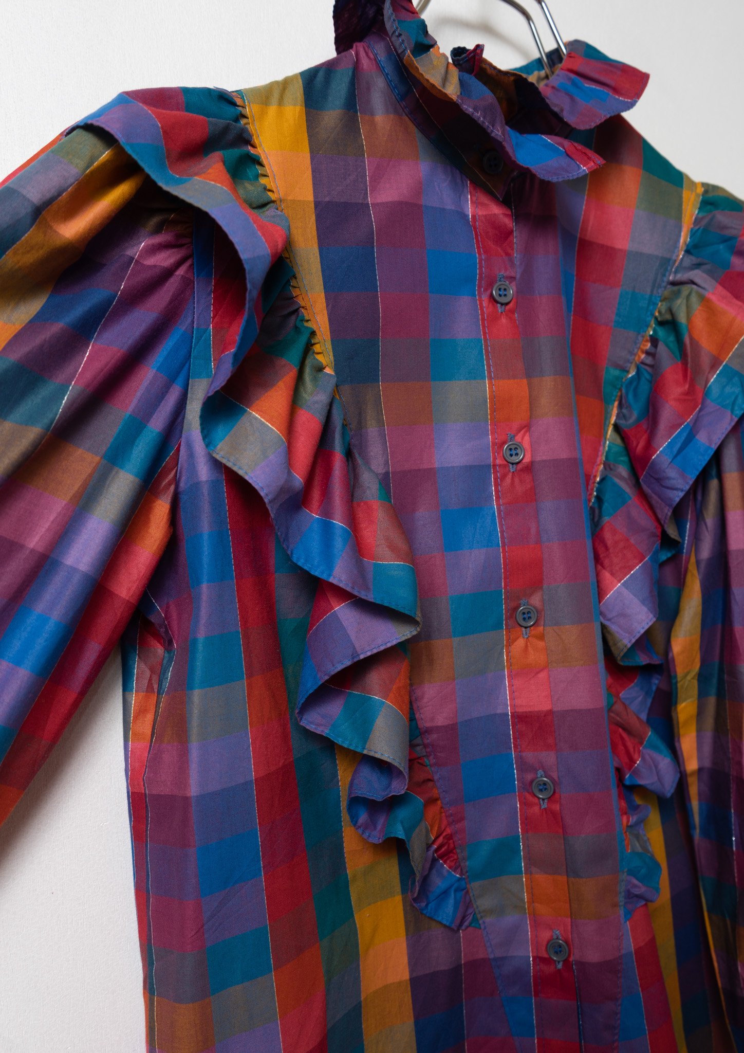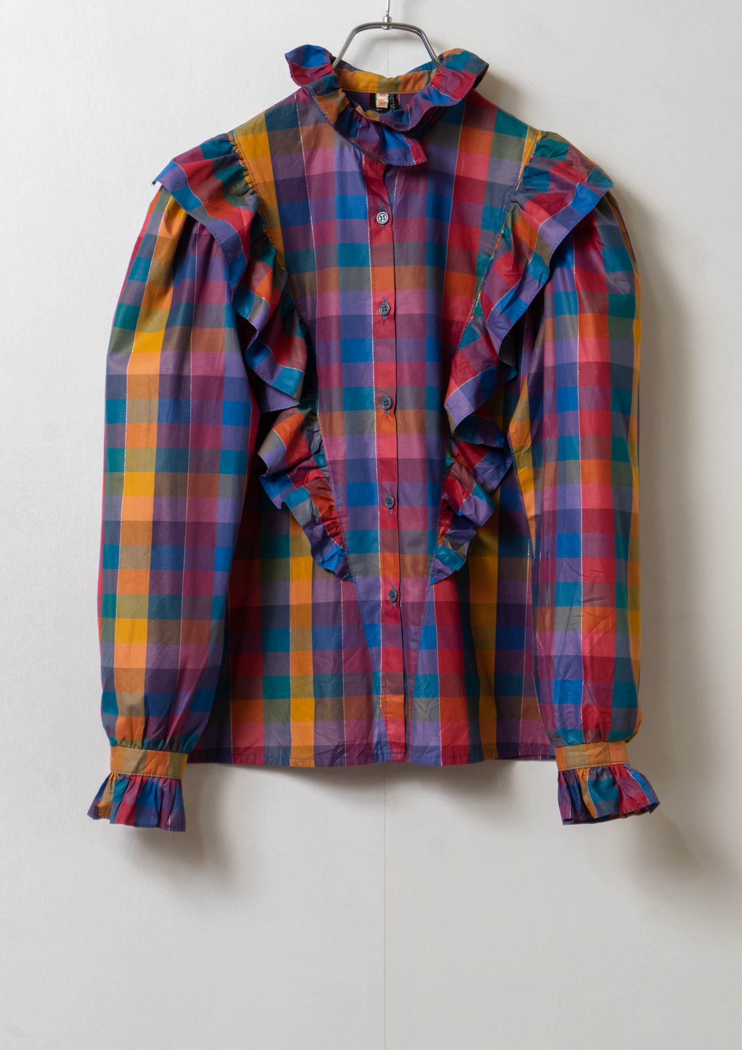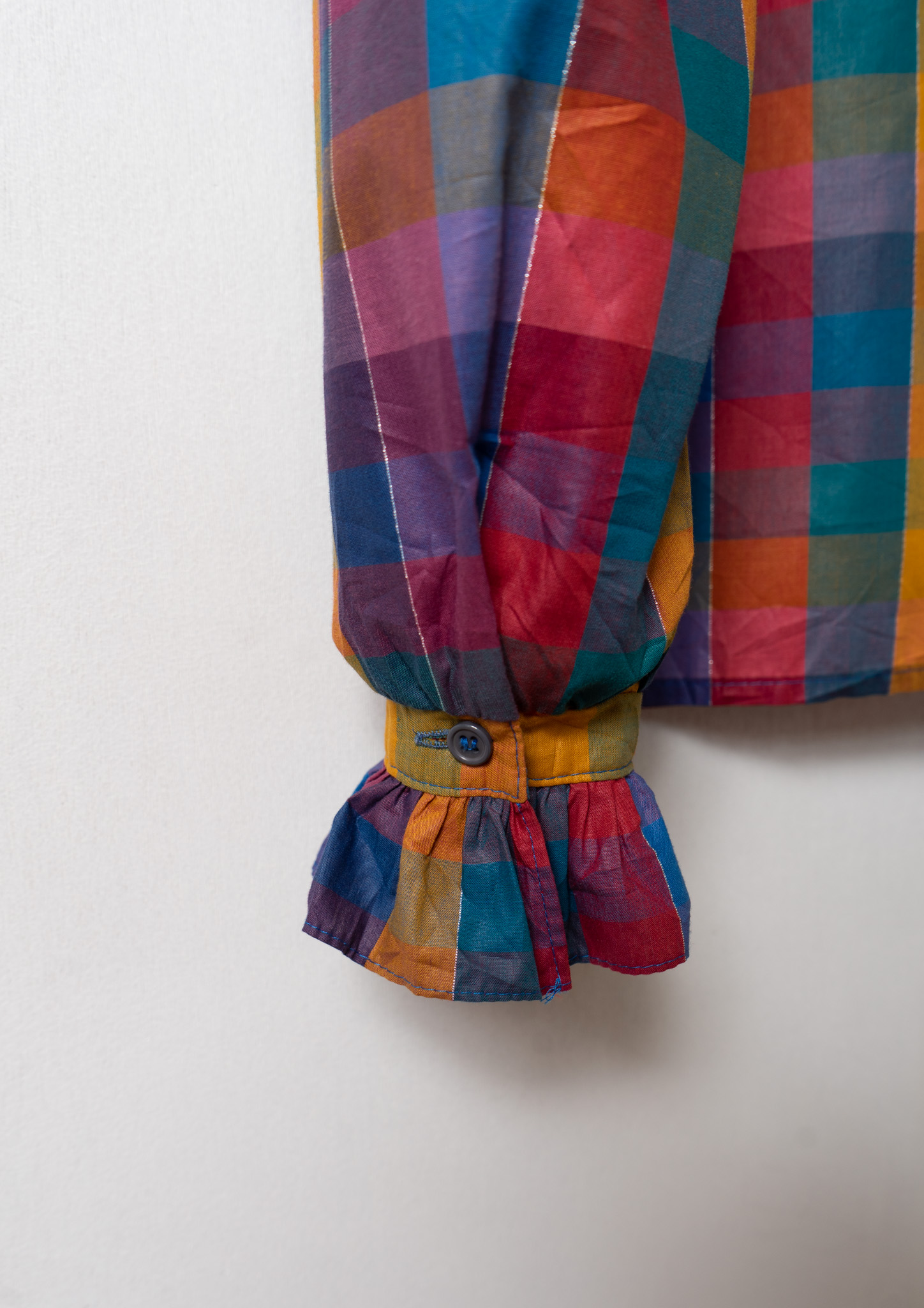 80’s Euro Frill Design Colorful Check Pattern Blouse