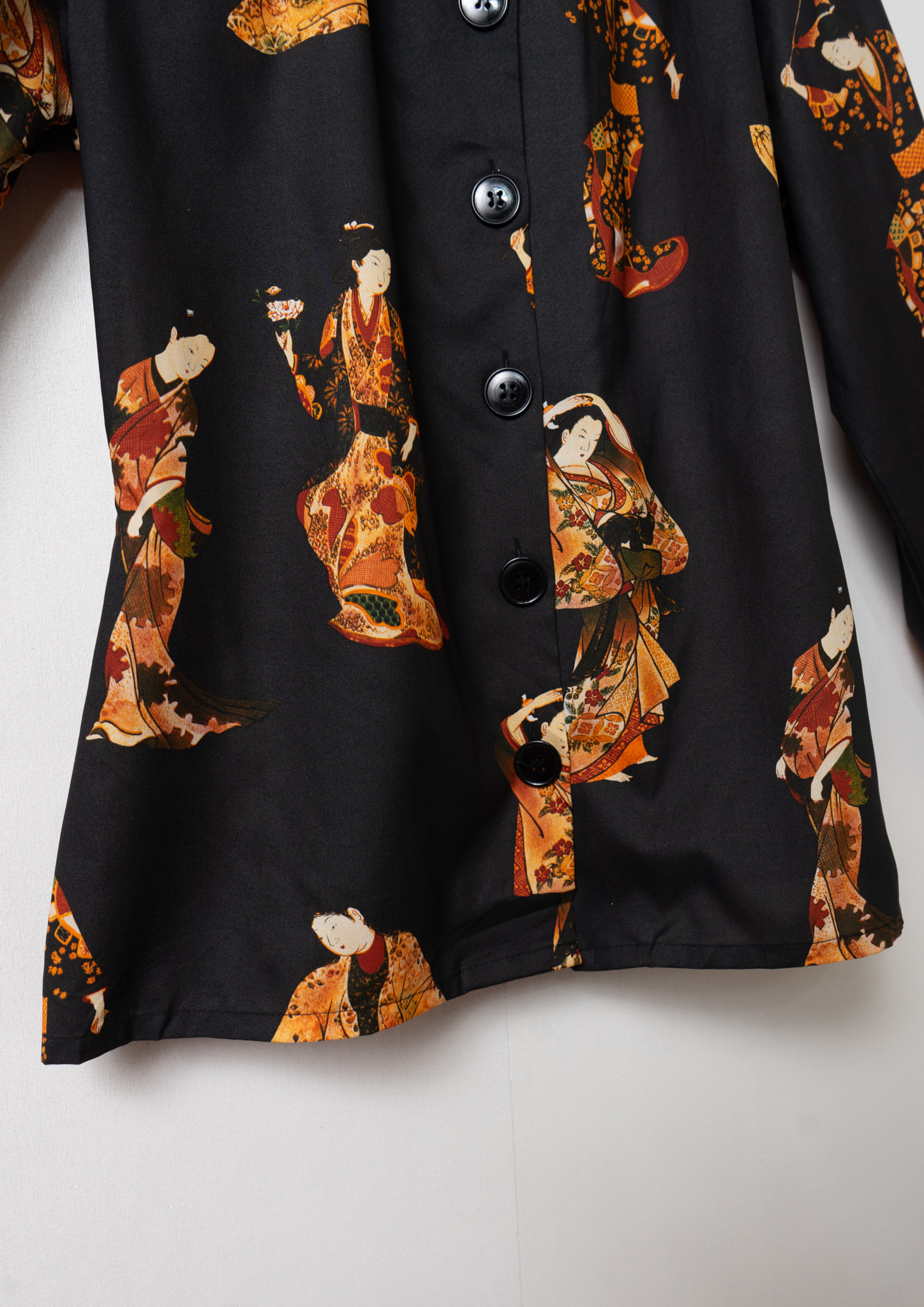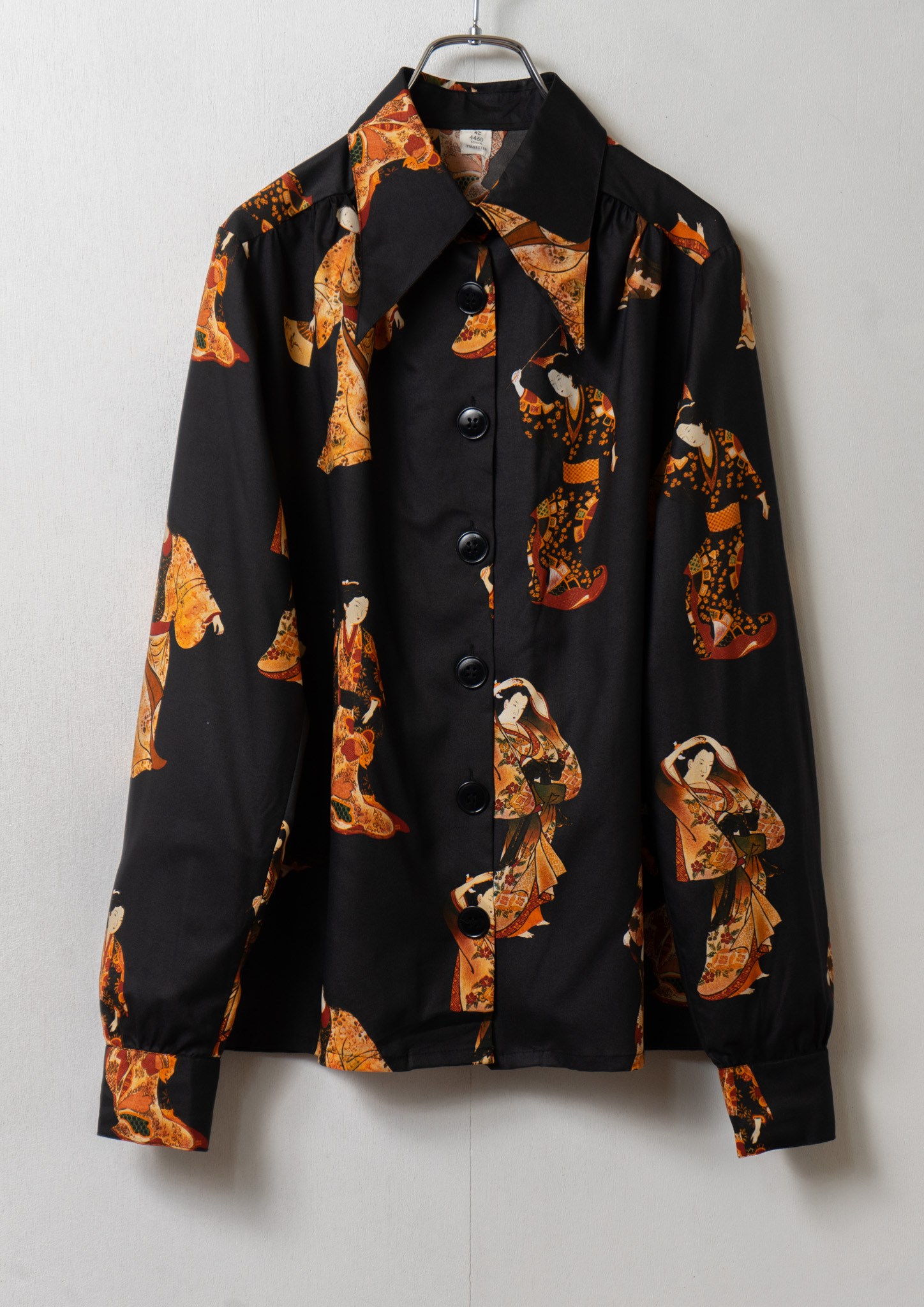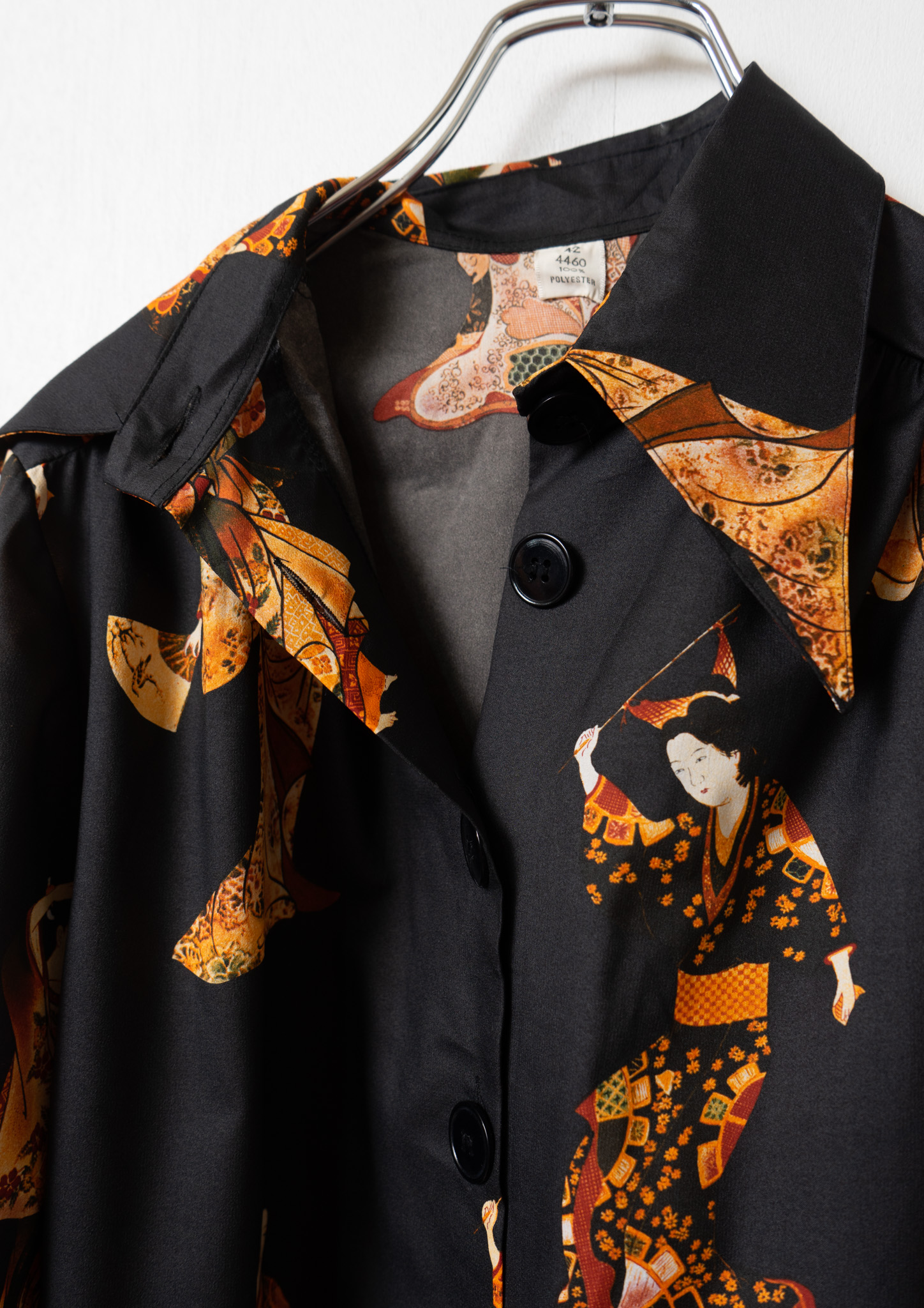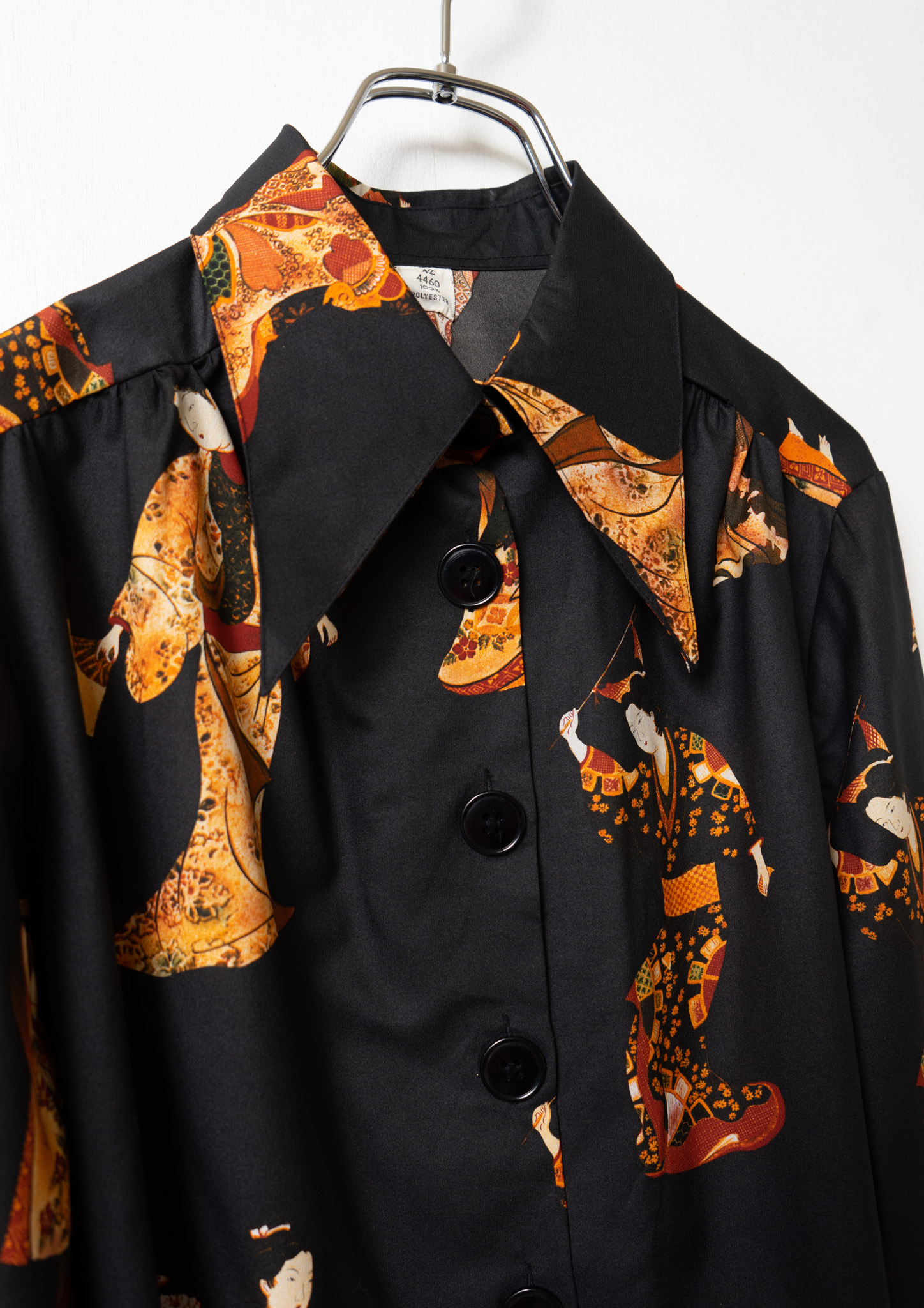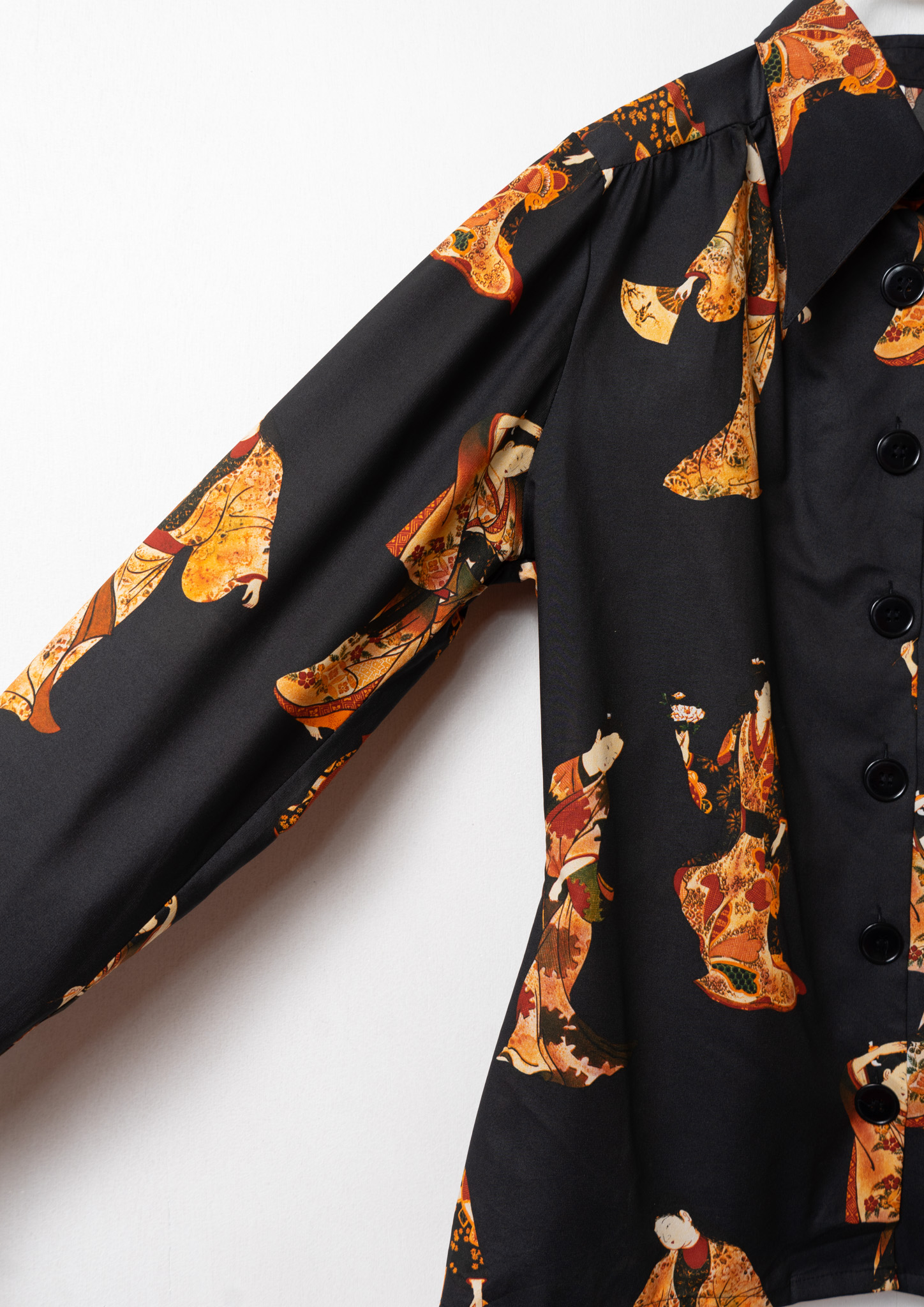 80's Greece Glossy Stripe Pattern Navy Blouse