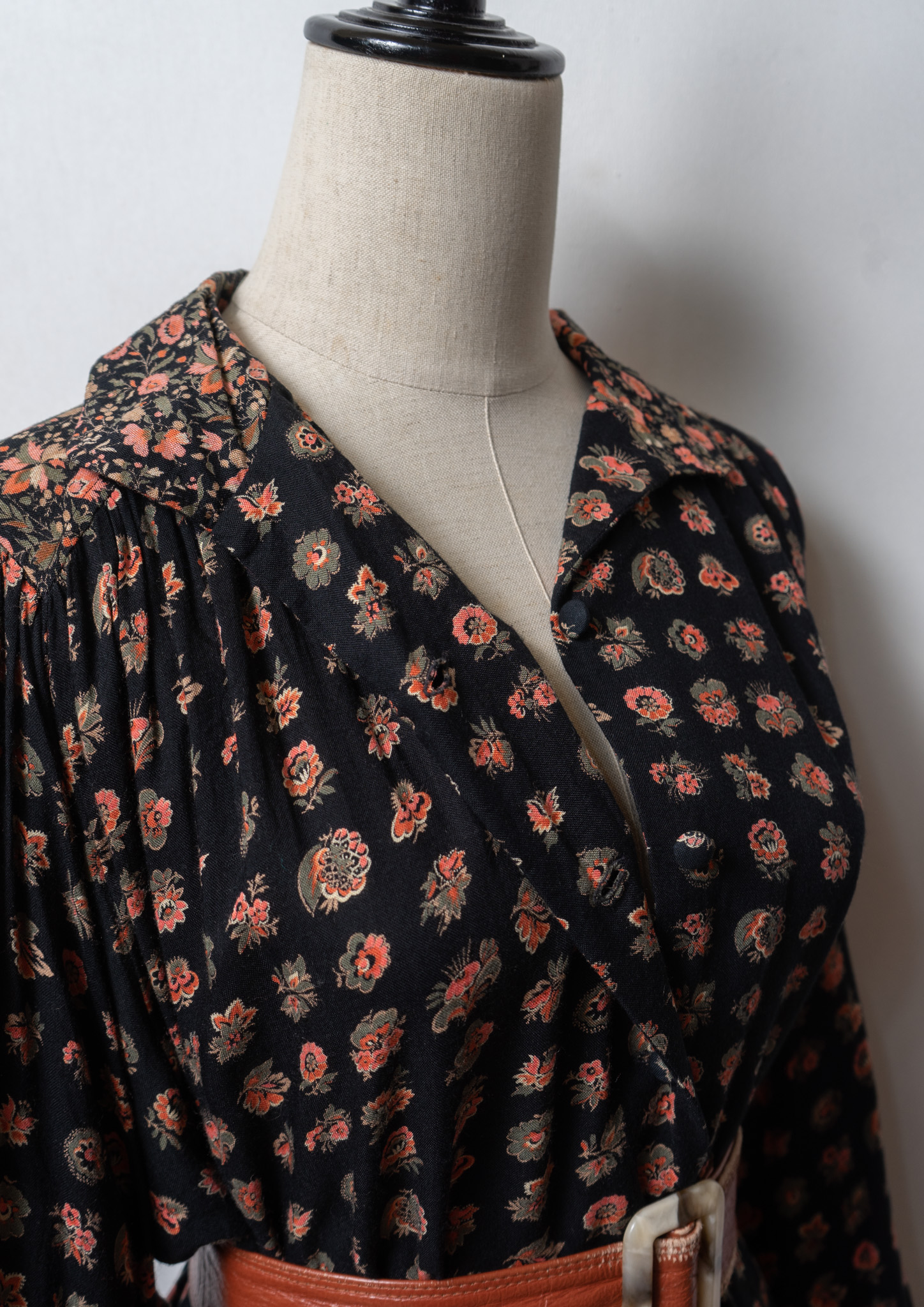 80's USA Houndstooth Pattern Velour Collar × Button Dress