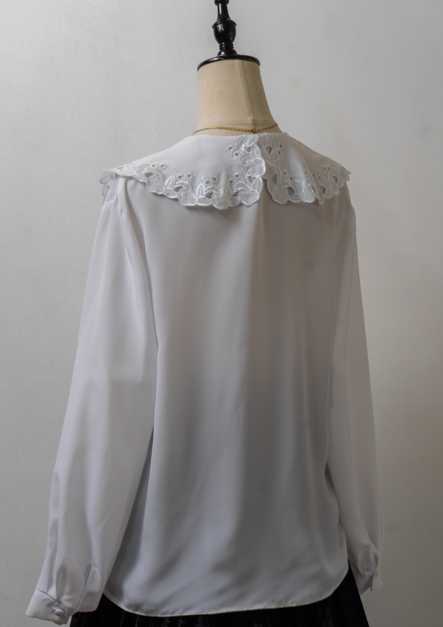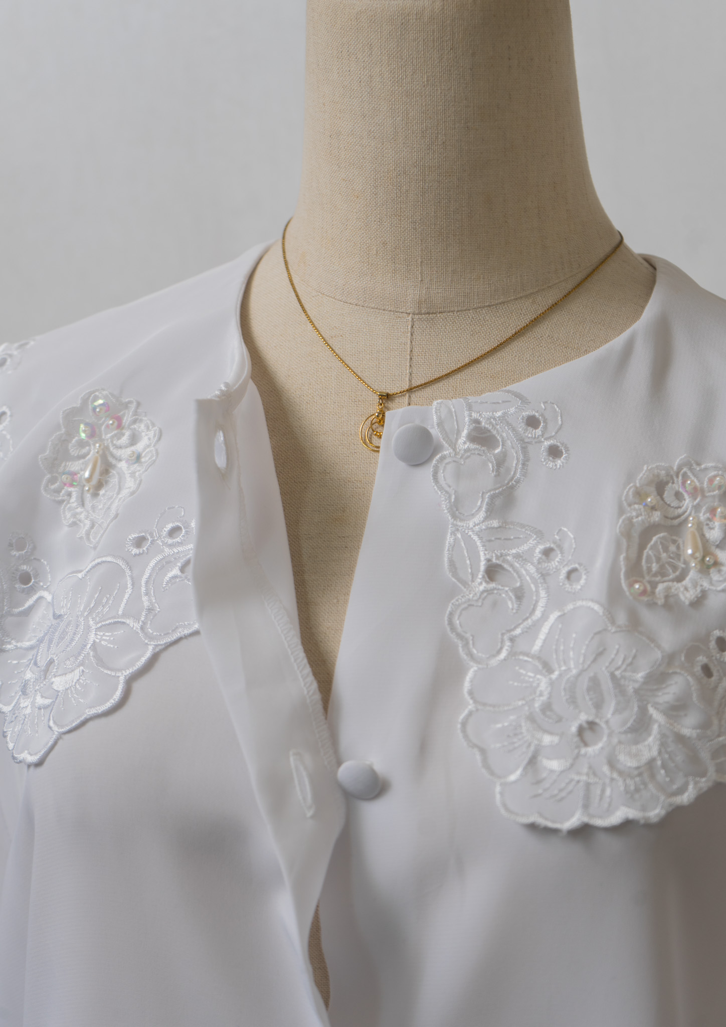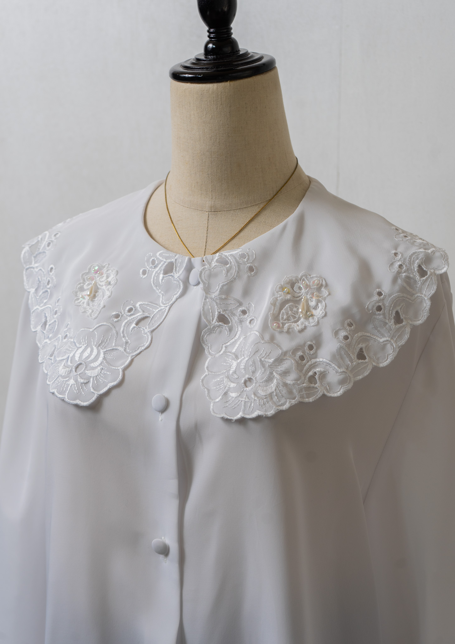 90's Flower Embroidery × Bijou Big Collar White Blouse