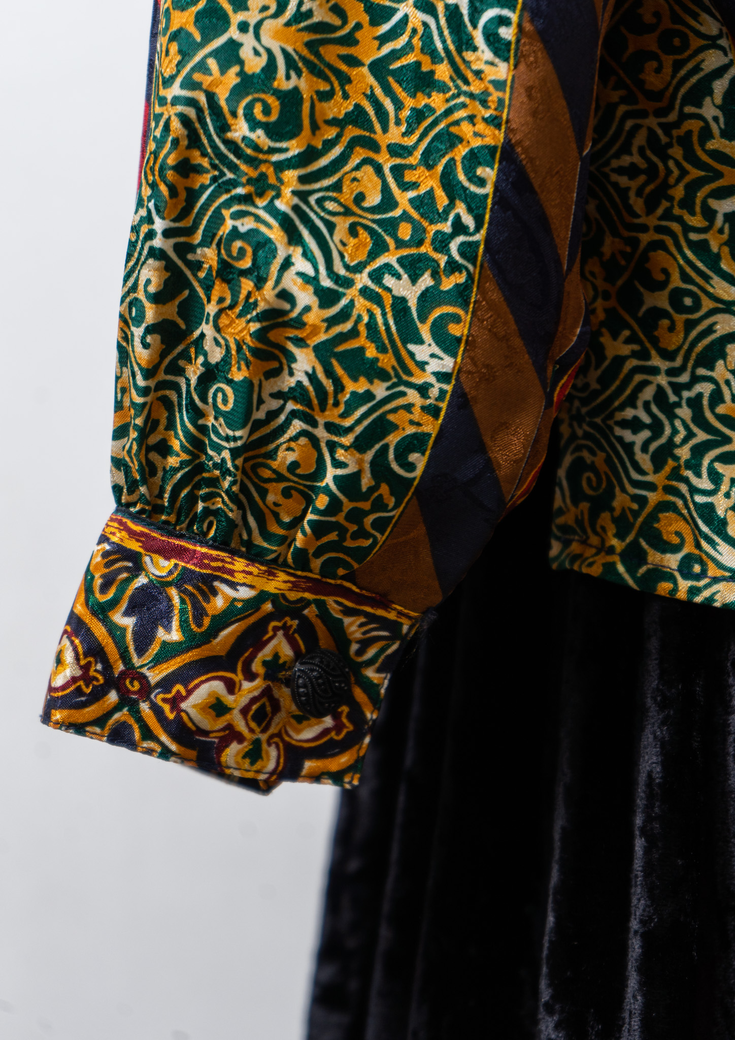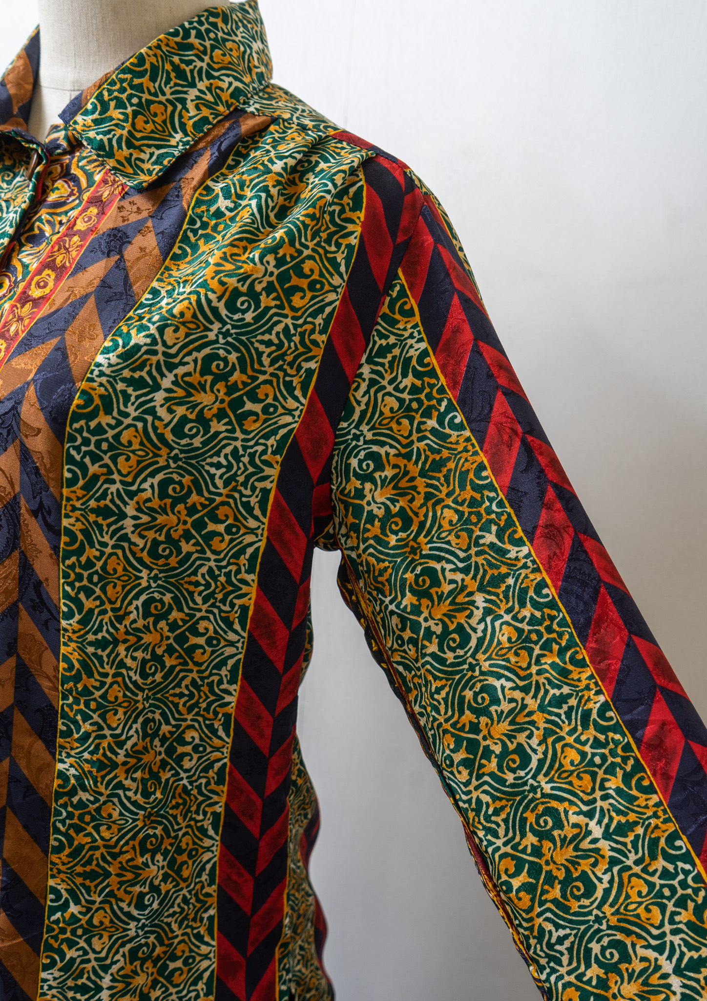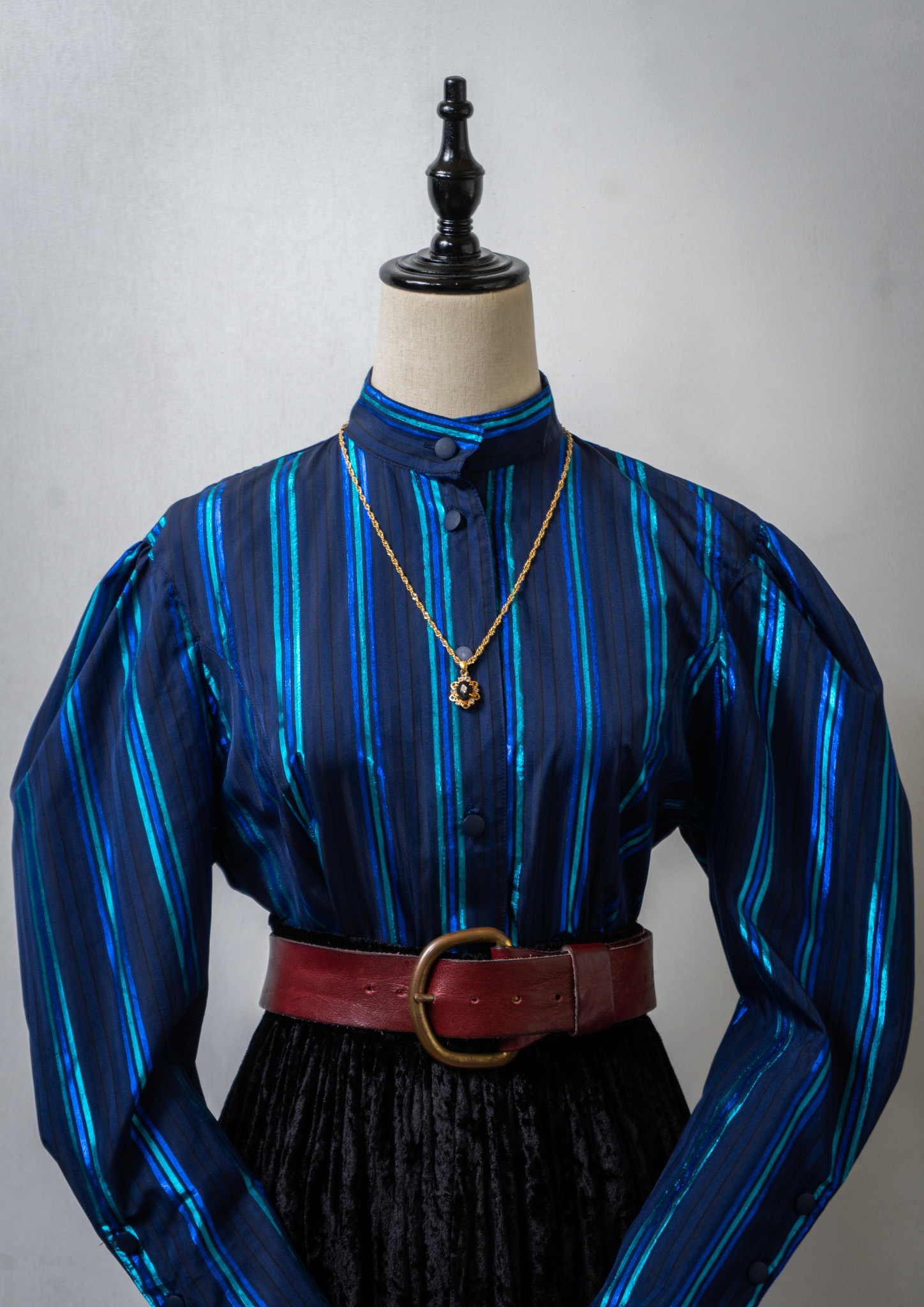 80's Greece Glossy Stripe Pattern Navy Blouse