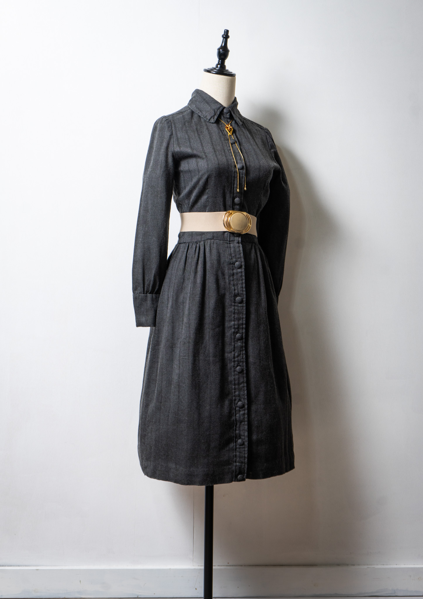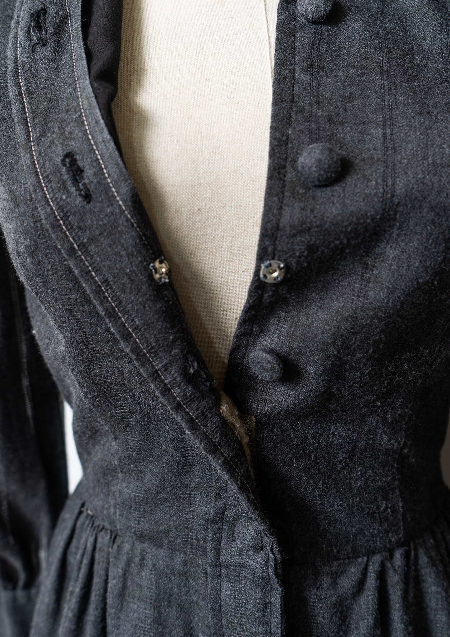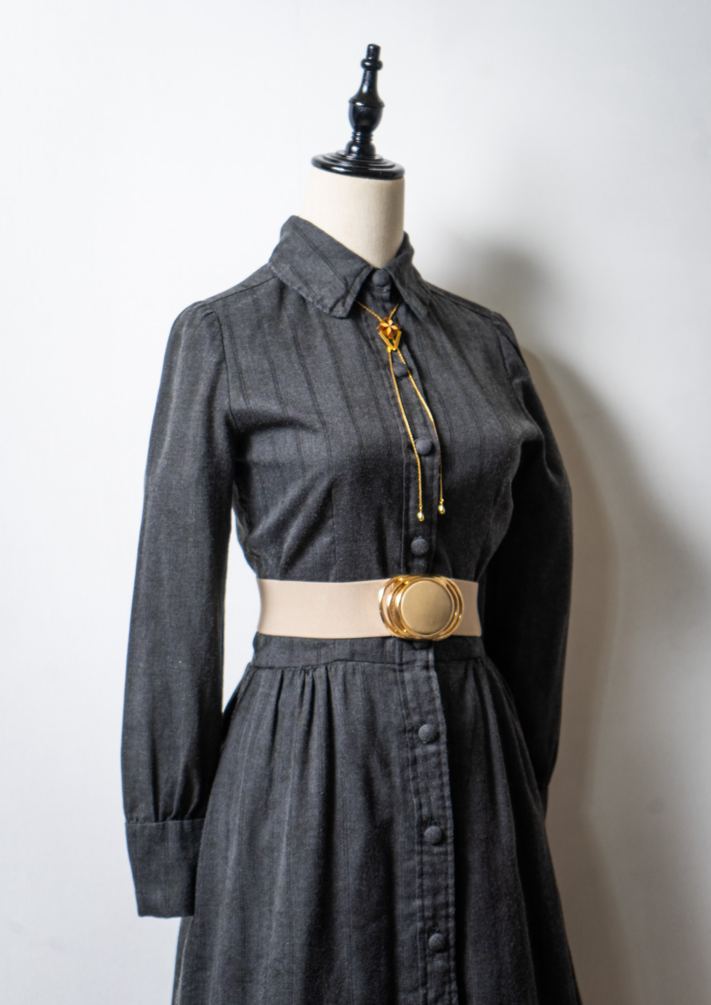 90's Black Velour Collar × Button Gray Over Dye Maxi Dress