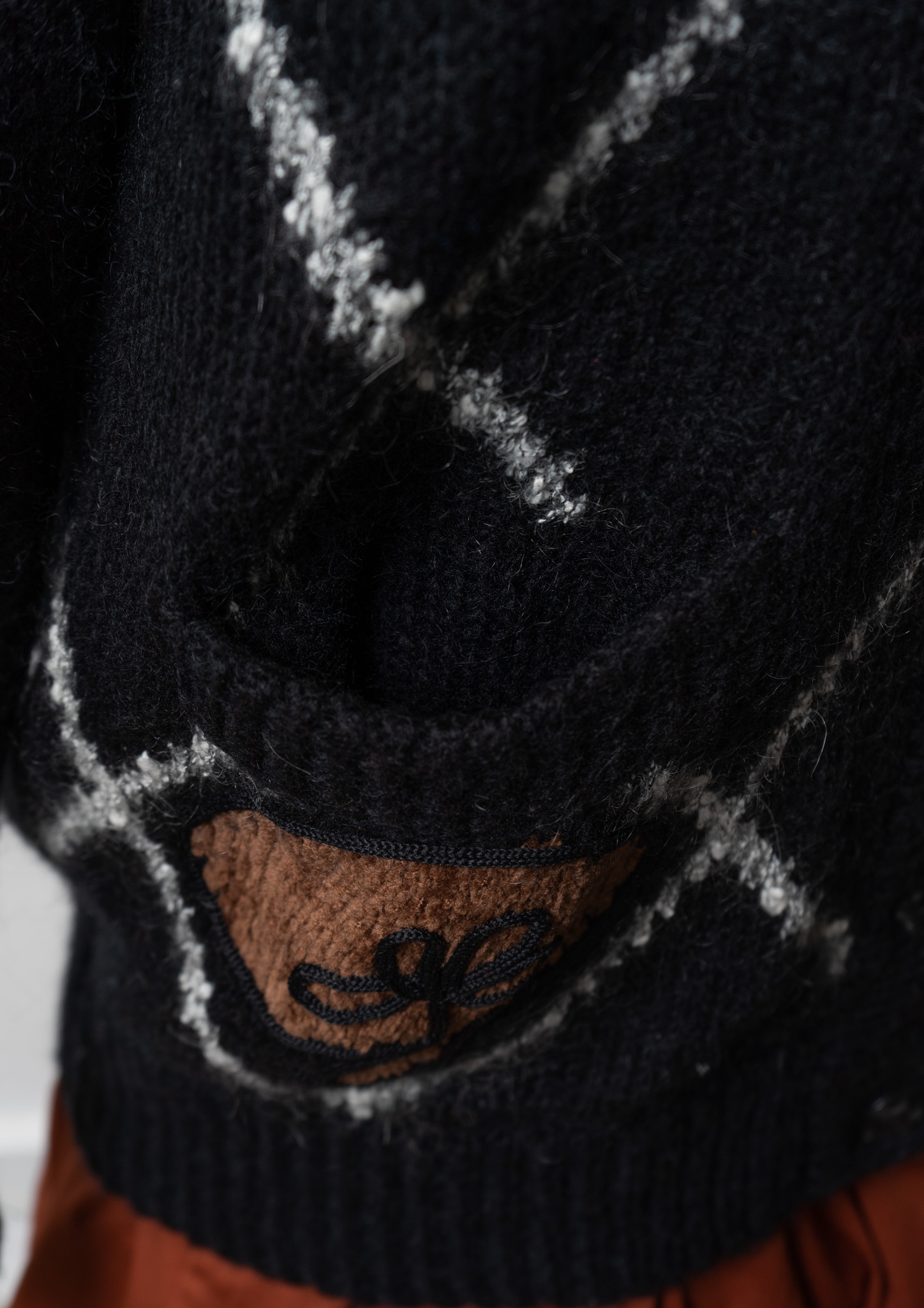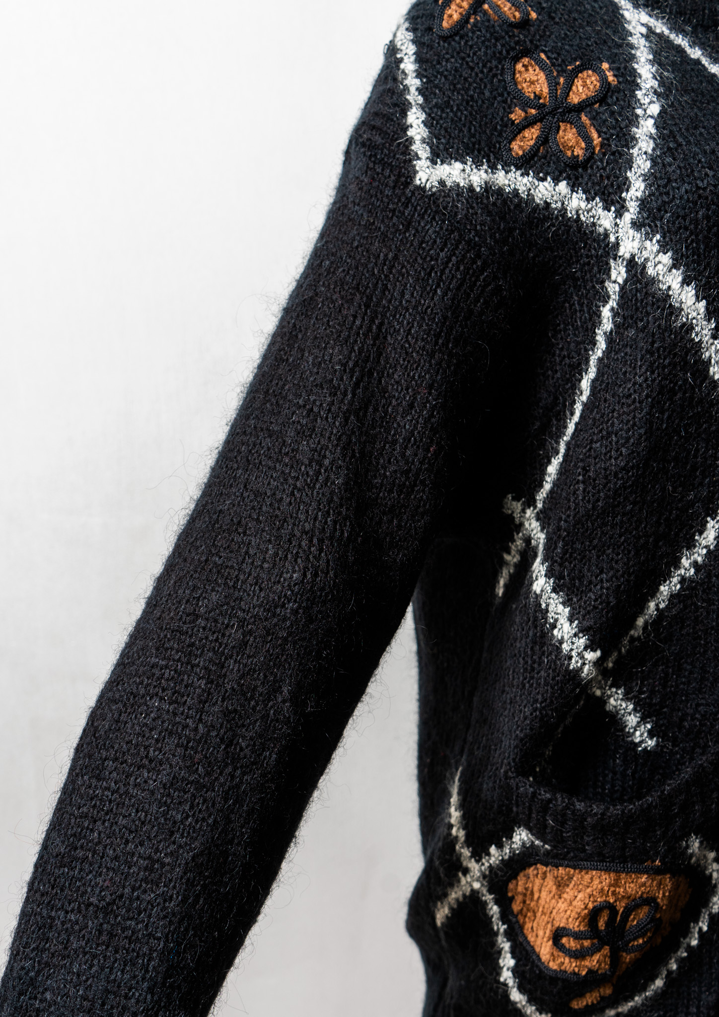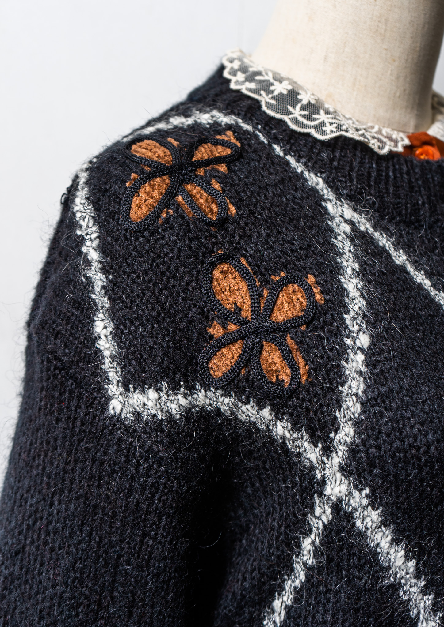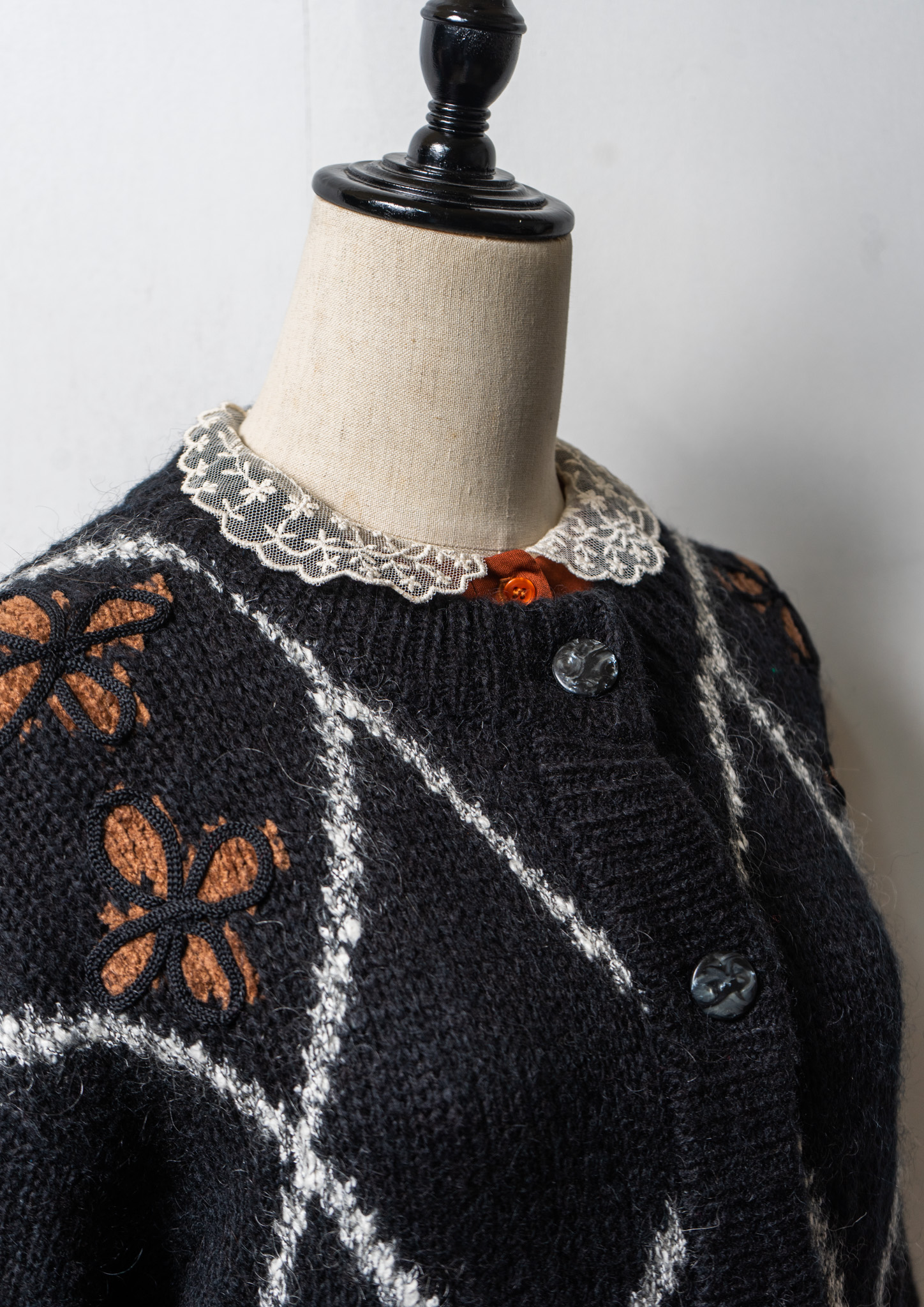 80~90's Flower × Check Pattern Black Mohair Cardigan