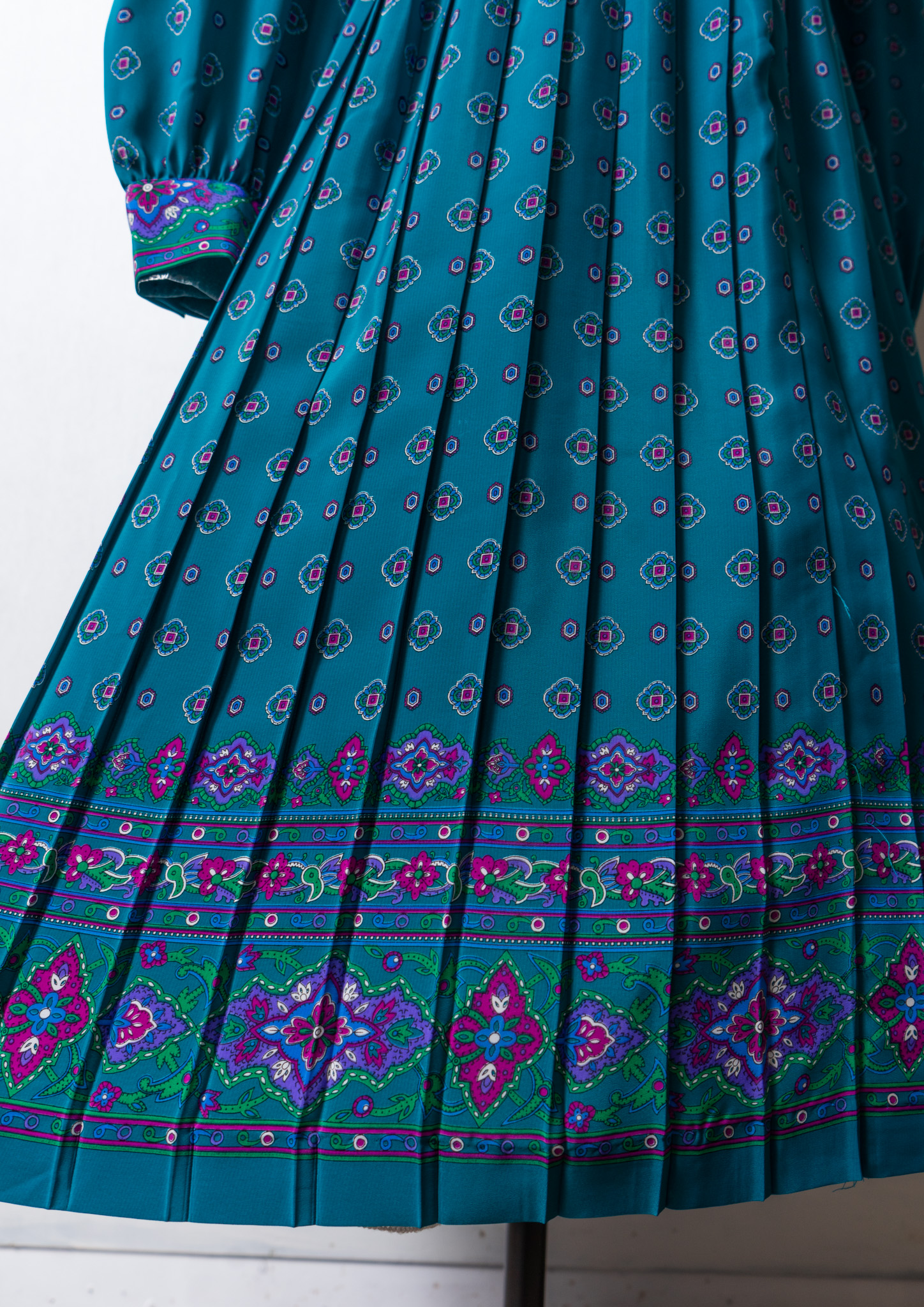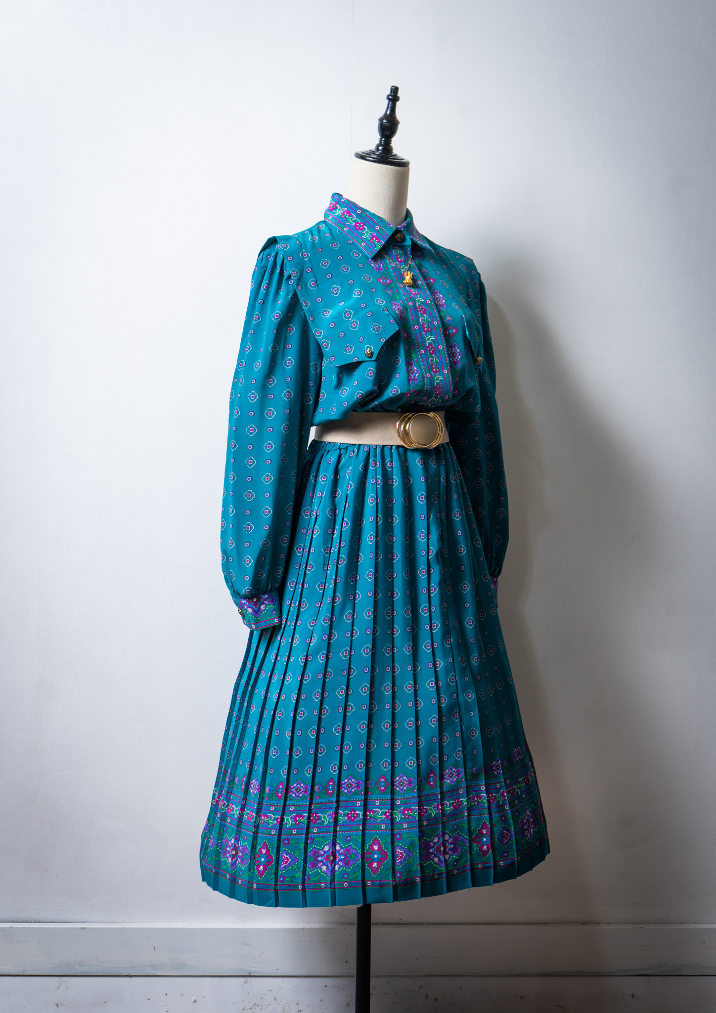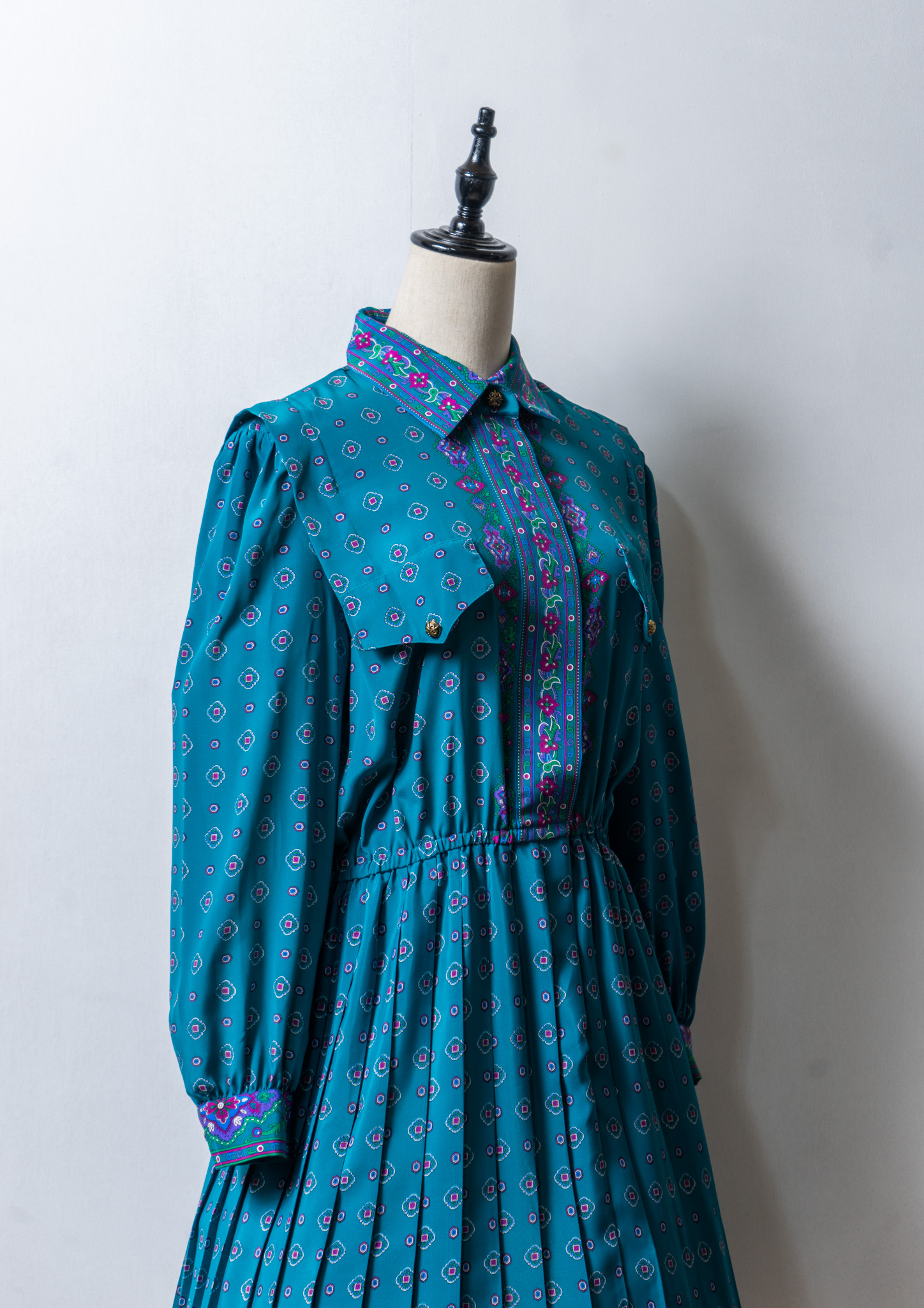 80~90's Flower × geometric Pattern Pleats Design Turquoise Blue Dress