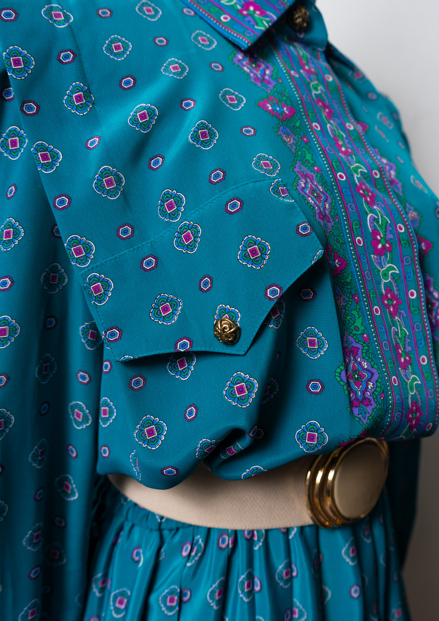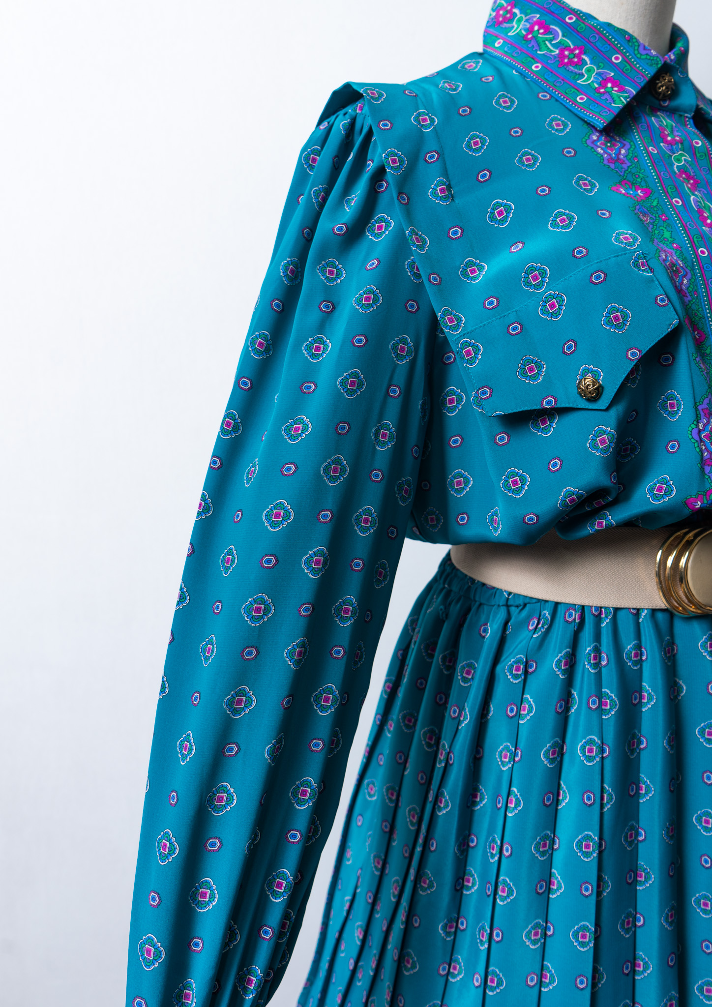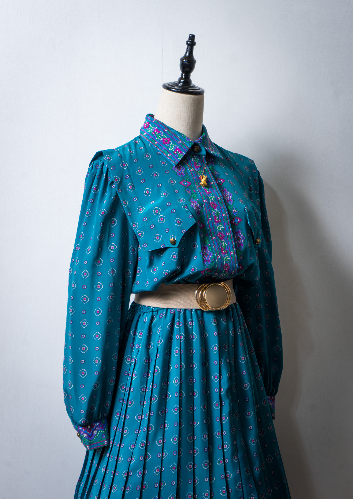 80~90's Flower × geometric Pattern Pleats Design Turquoise Blue Dress