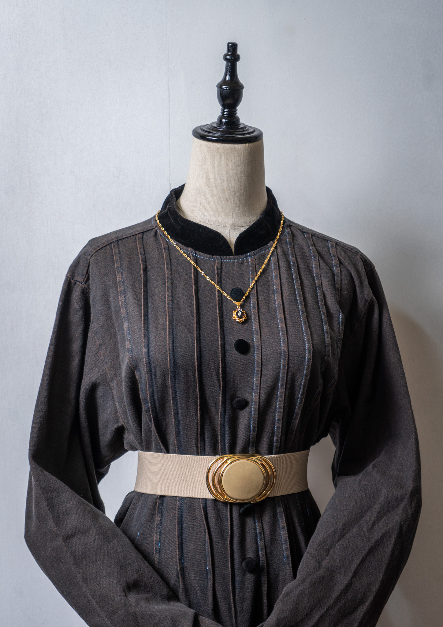 90's Black Velour Collar × Button Gray Over Dye Maxi Dress