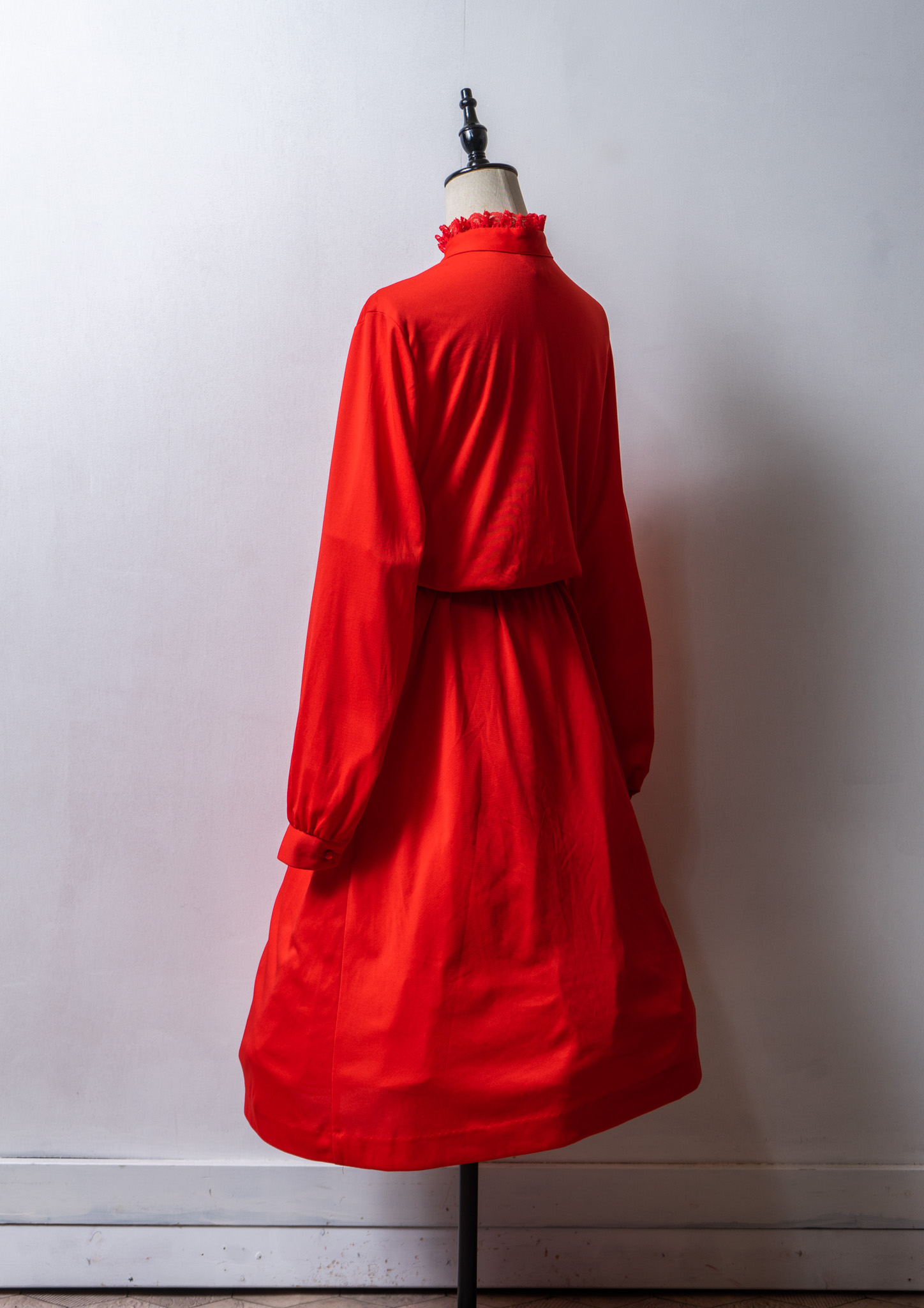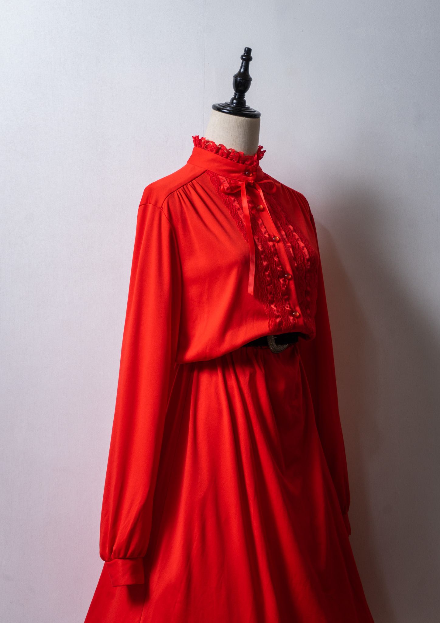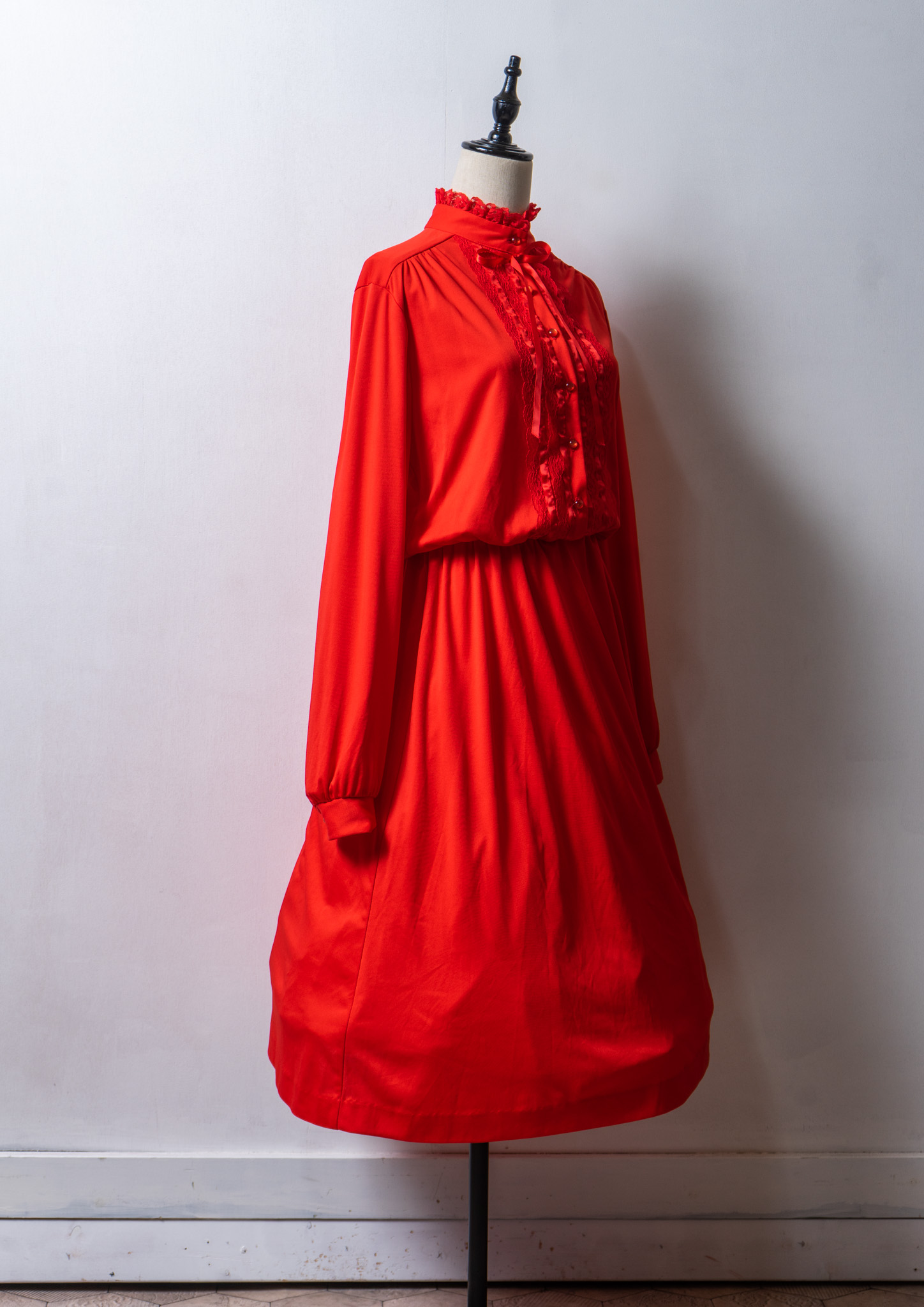 70's USA JC Penney Ribbon × Frill Design Red Dress