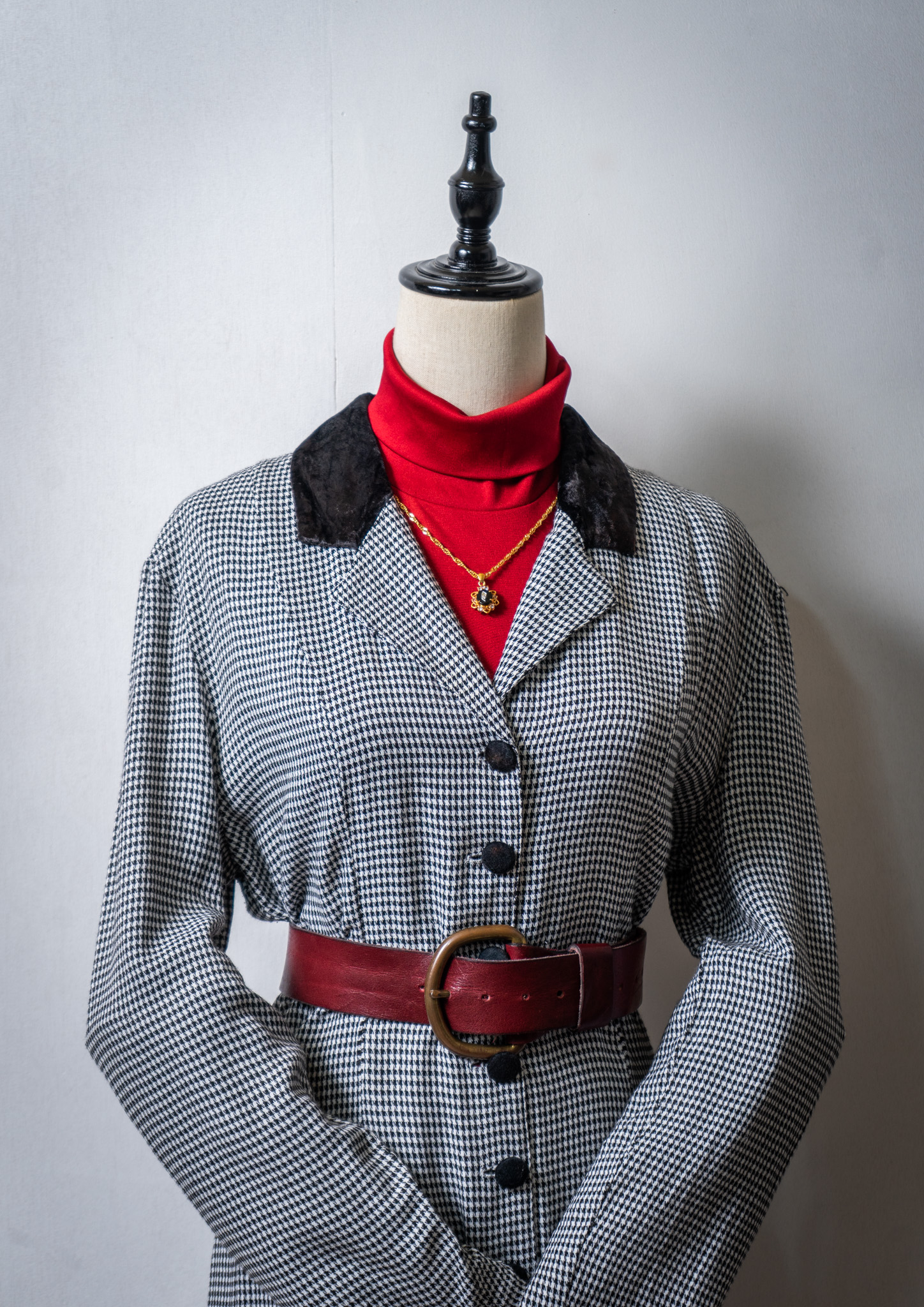 80's USA Houndstooth Pattern Velour Collar × Button Dress