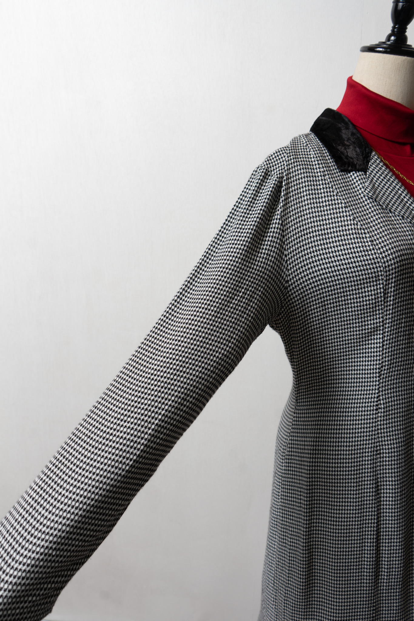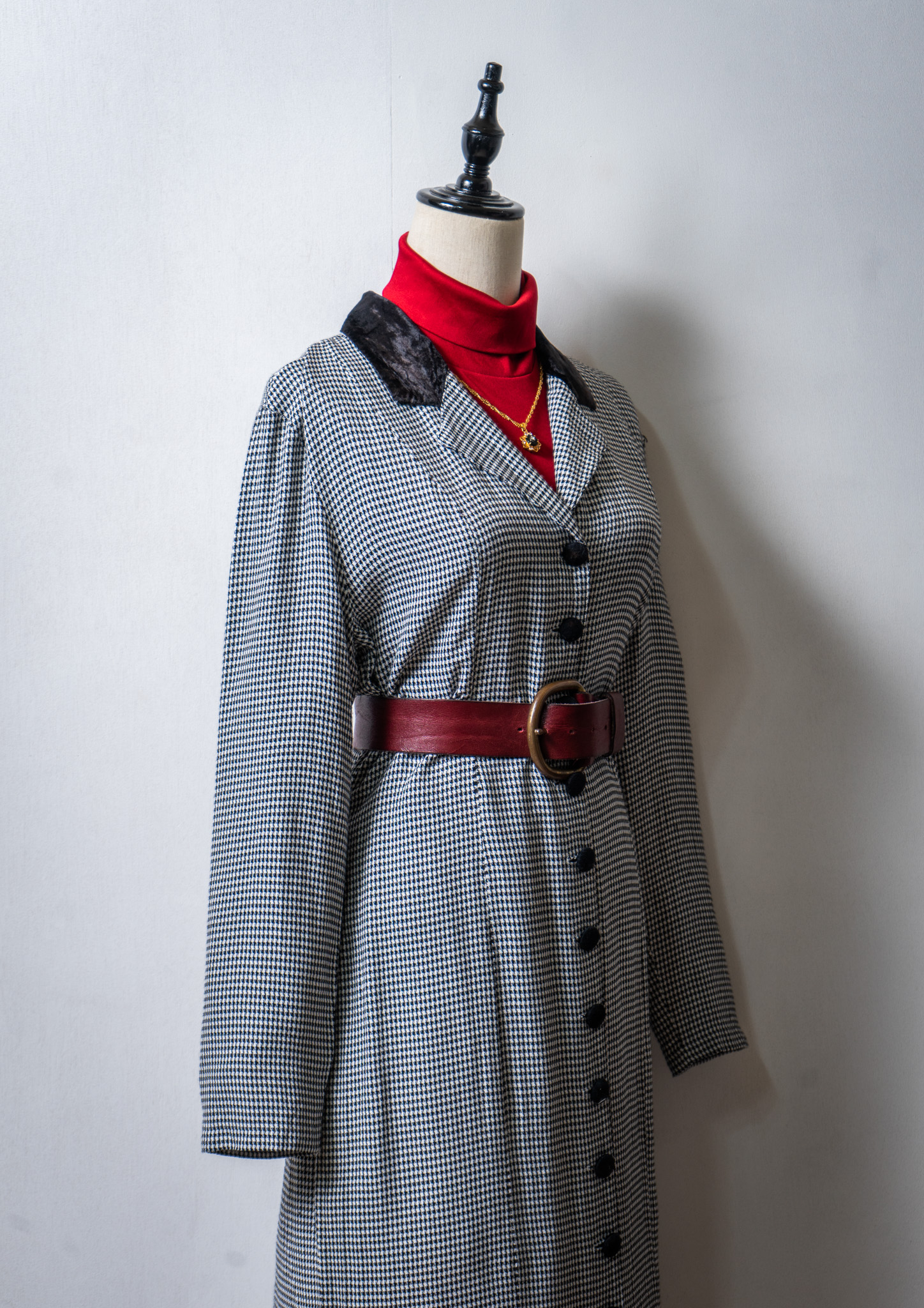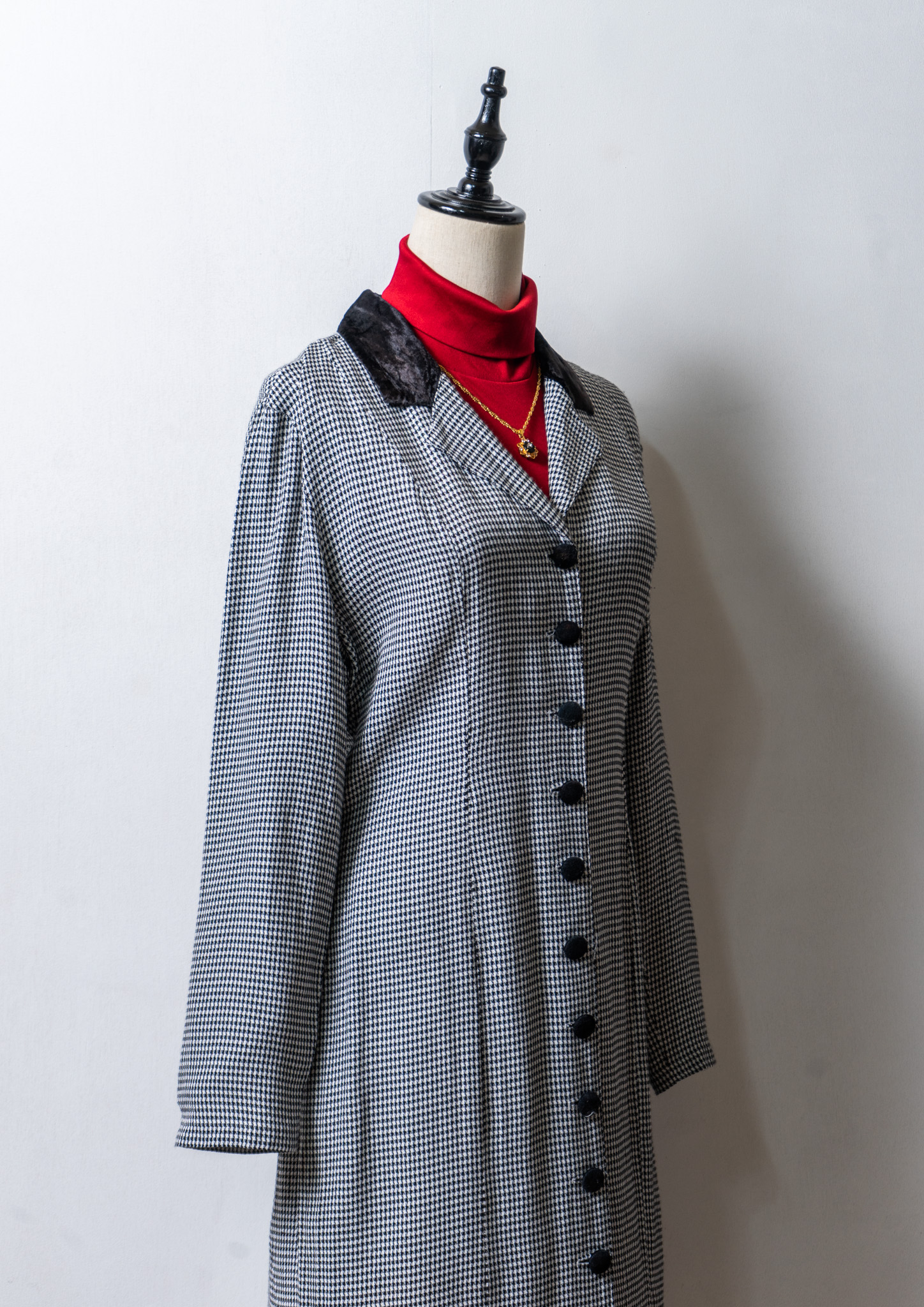 80's USA Houndstooth Pattern Velour Collar × Button Dress