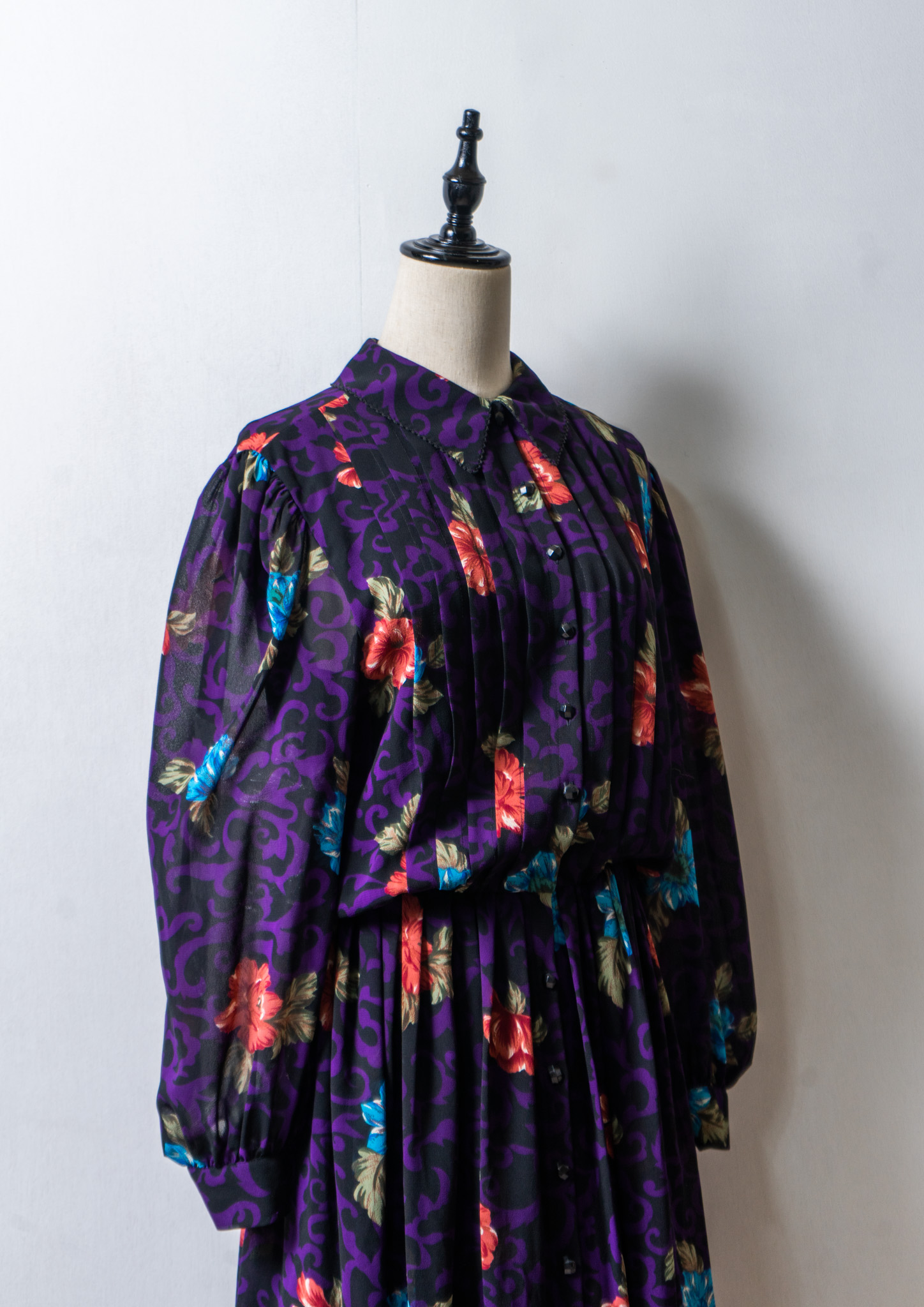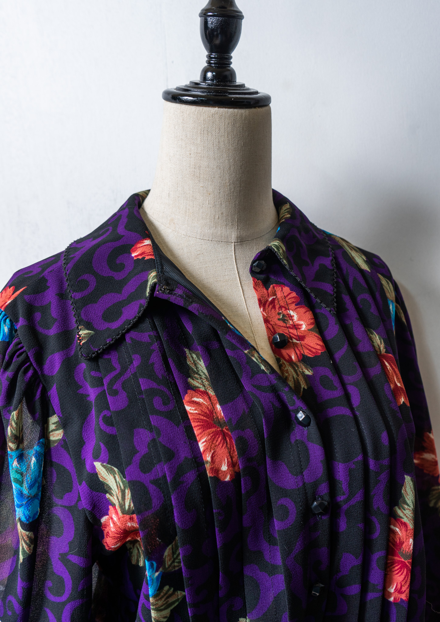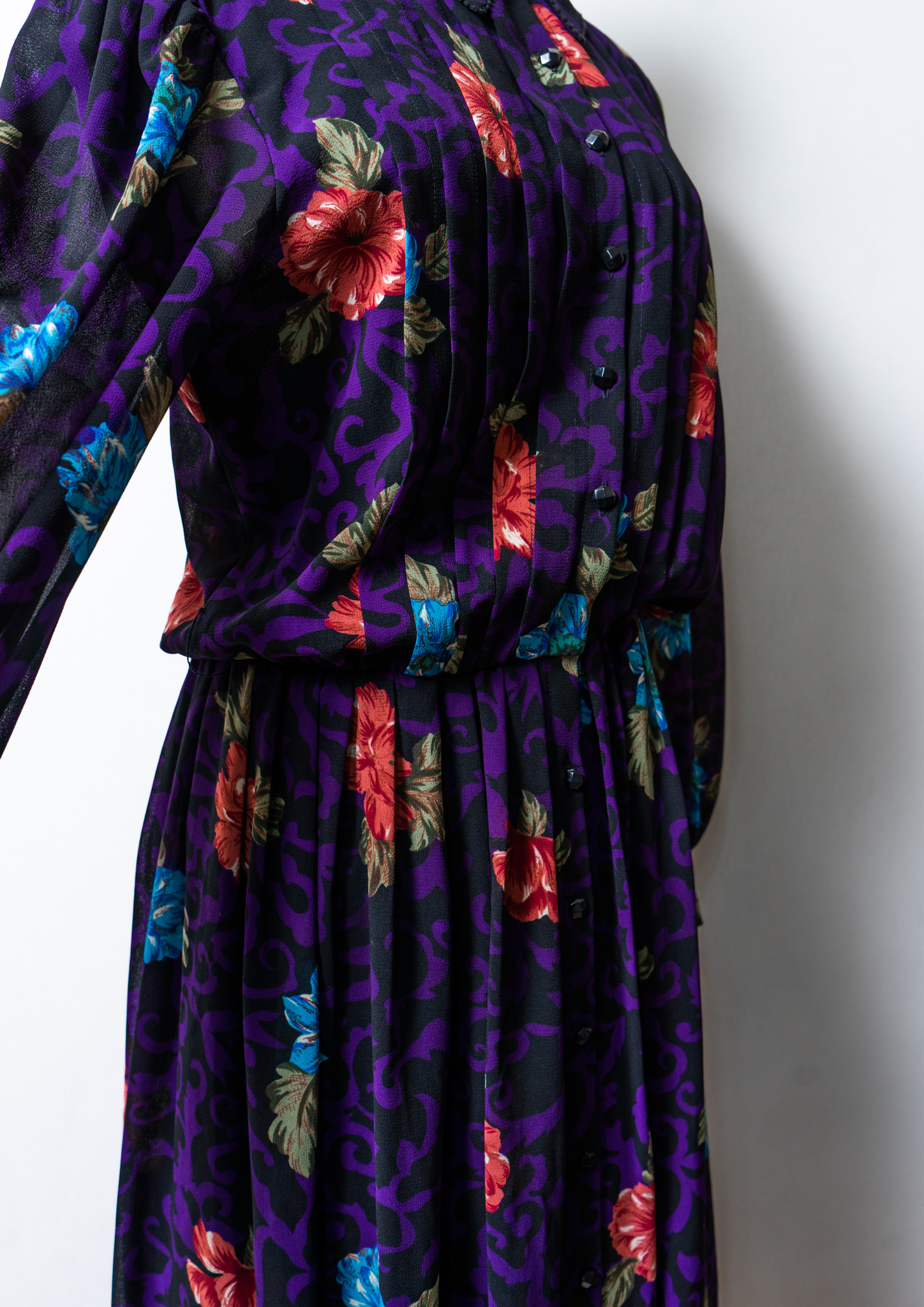 90's Donna Morgan Botanical Pattern Tuck Design Purple Dress