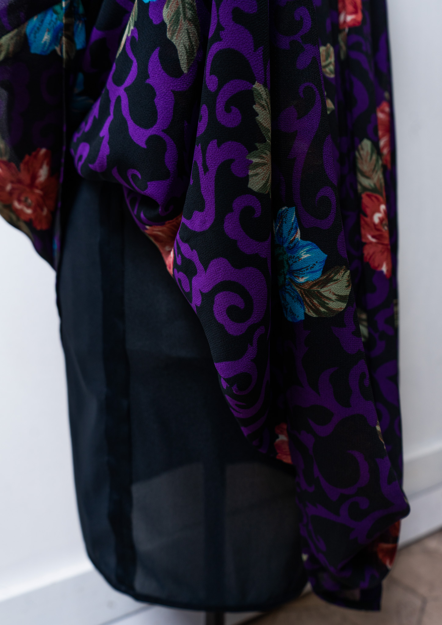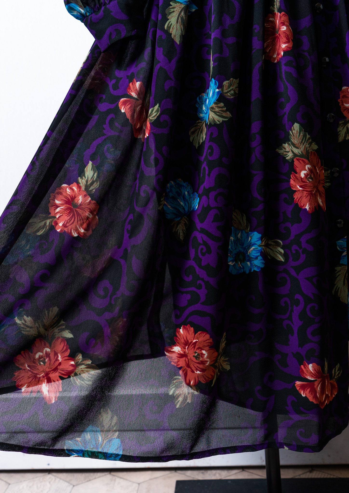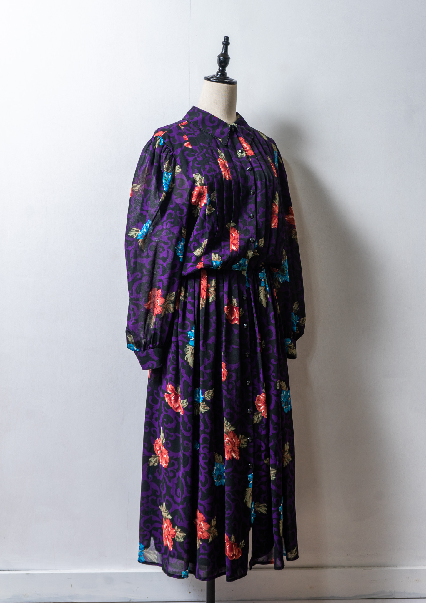 90's Donna Morgan Botanical Pattern Tuck Design Purple Dress