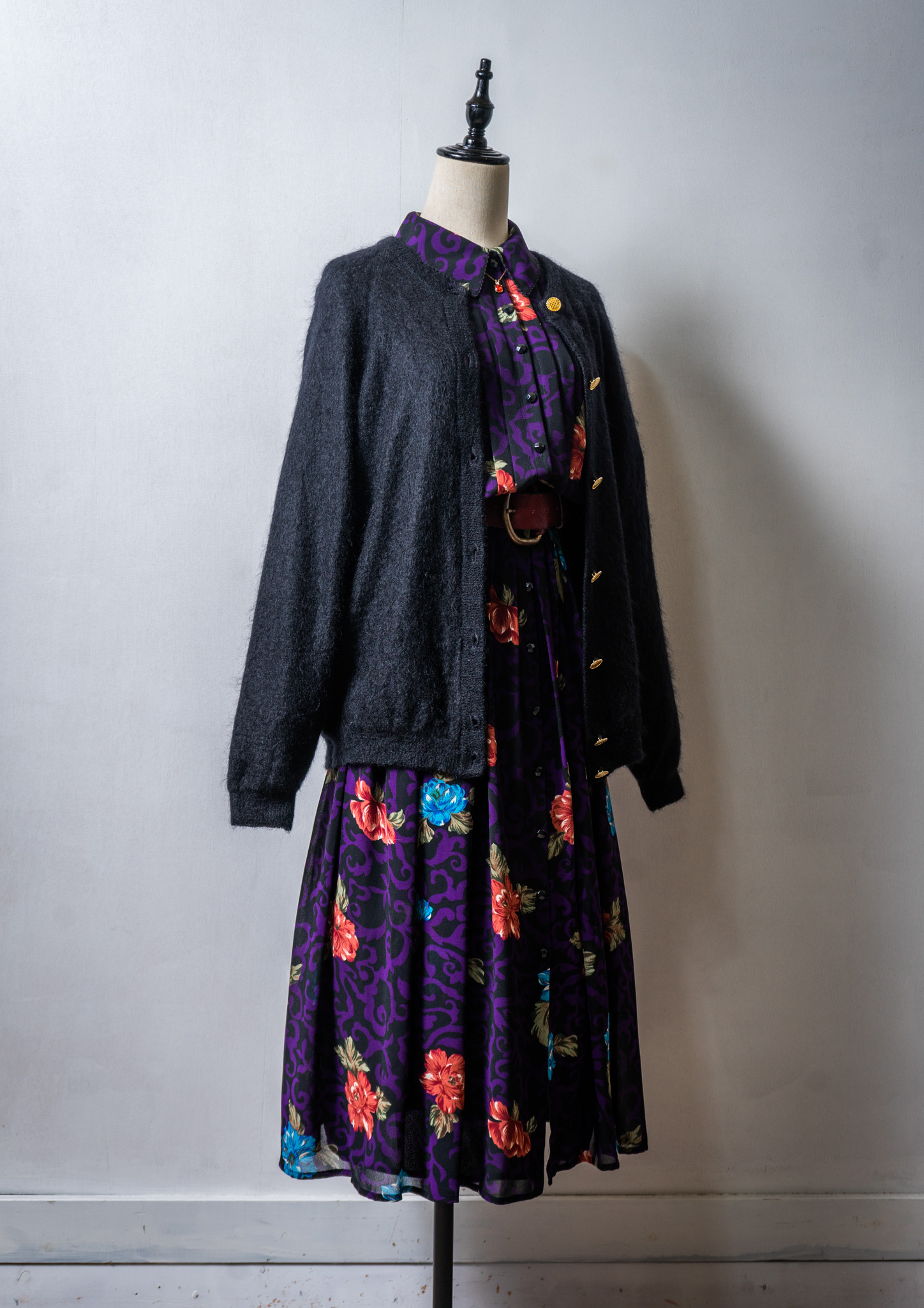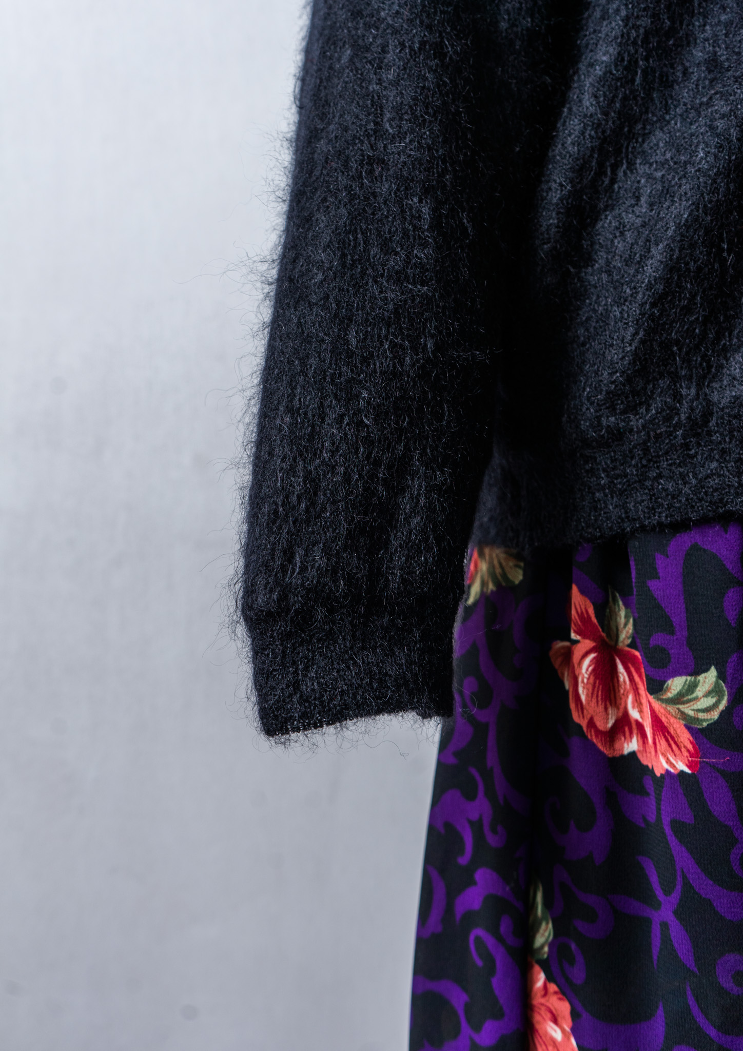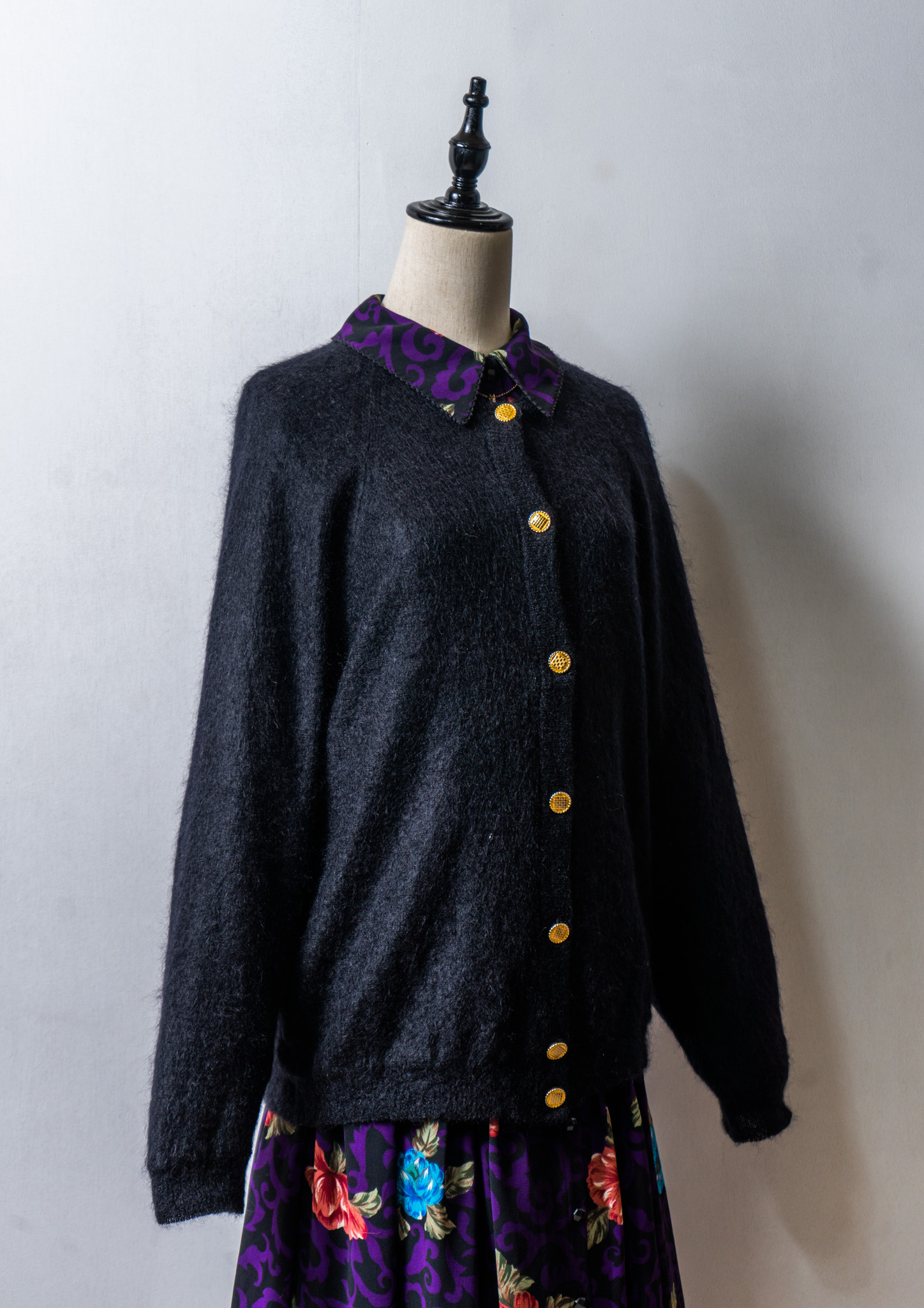 80~90's Flower × Check Pattern Black Mohair Cardigan