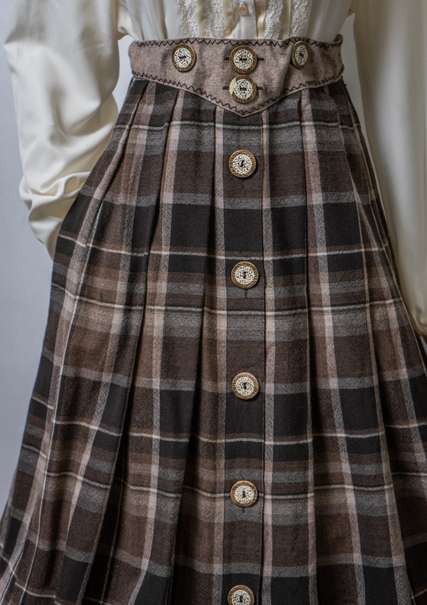 90's Euro Front Uique Big Button Design Check Pattern Brown Tyrol Skirt
