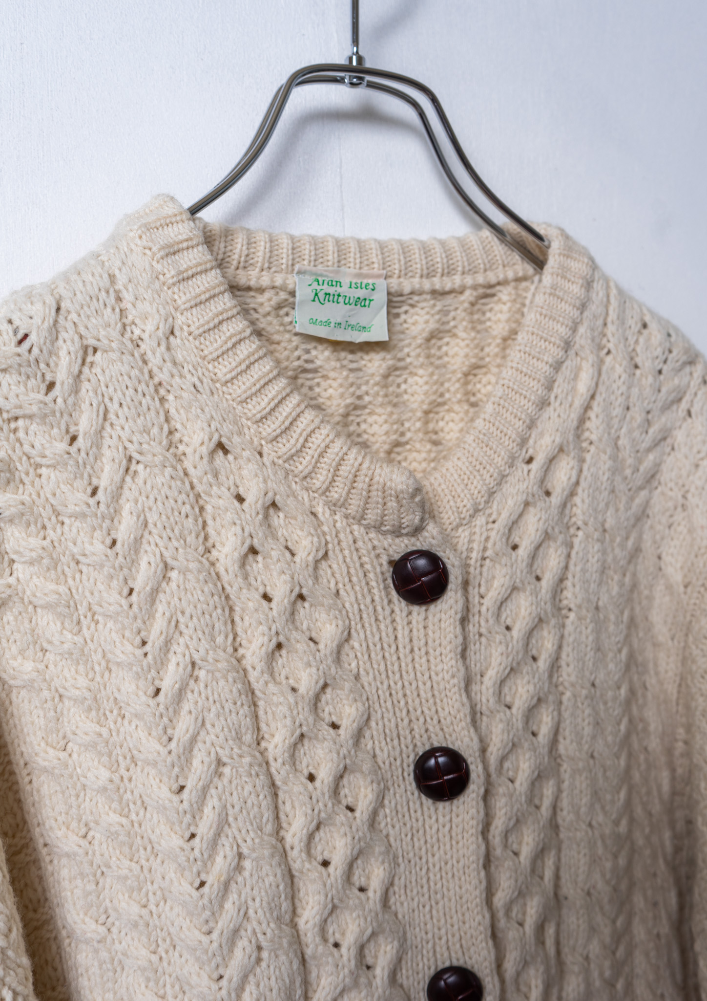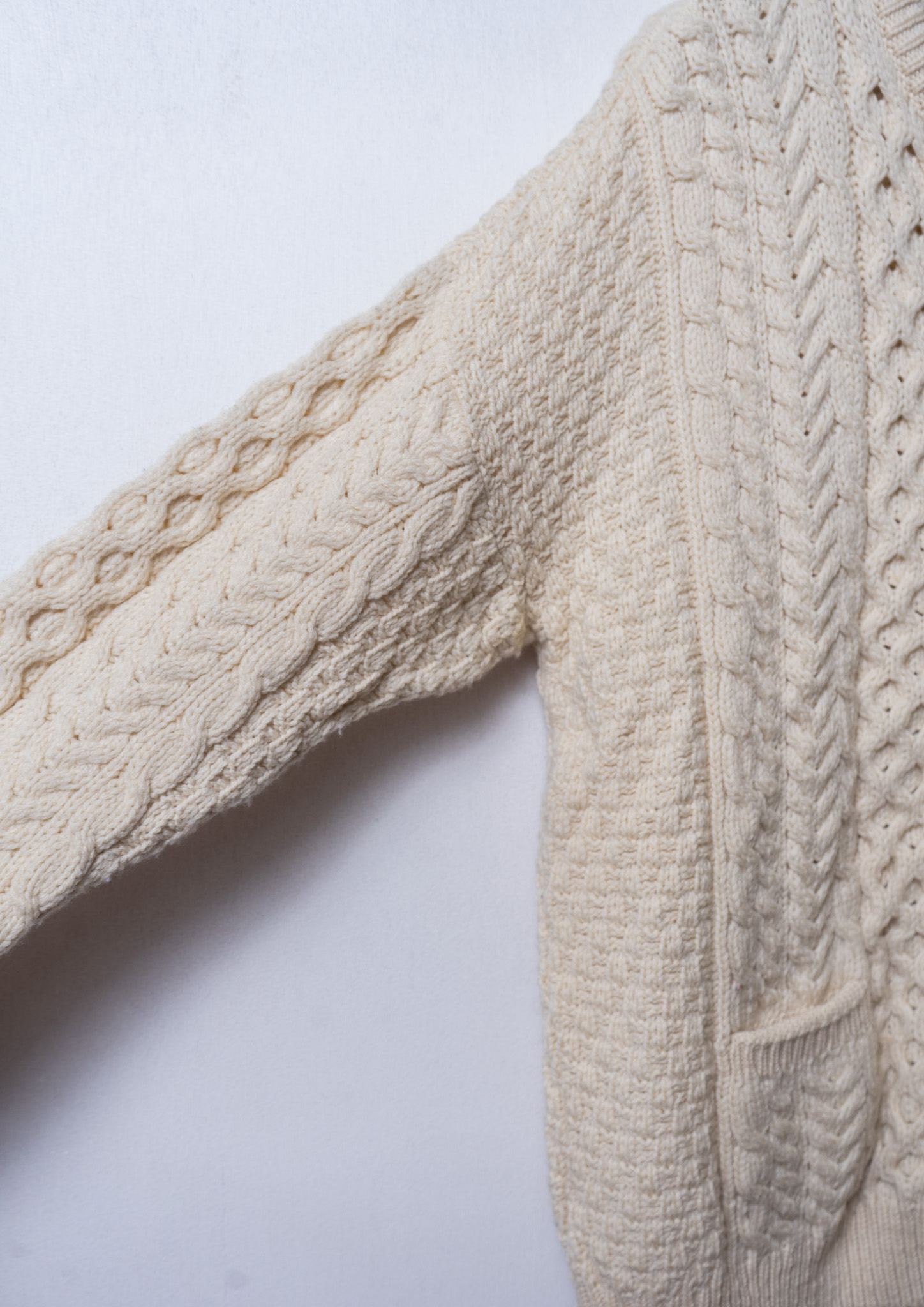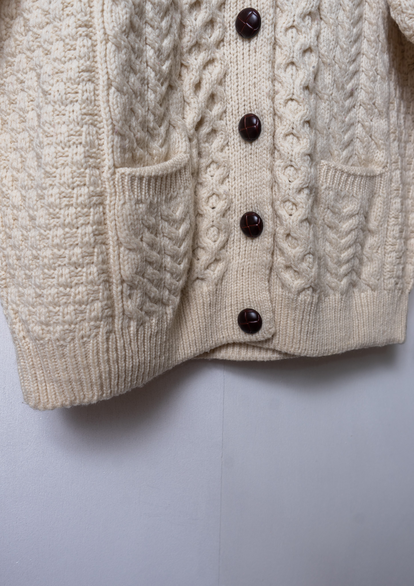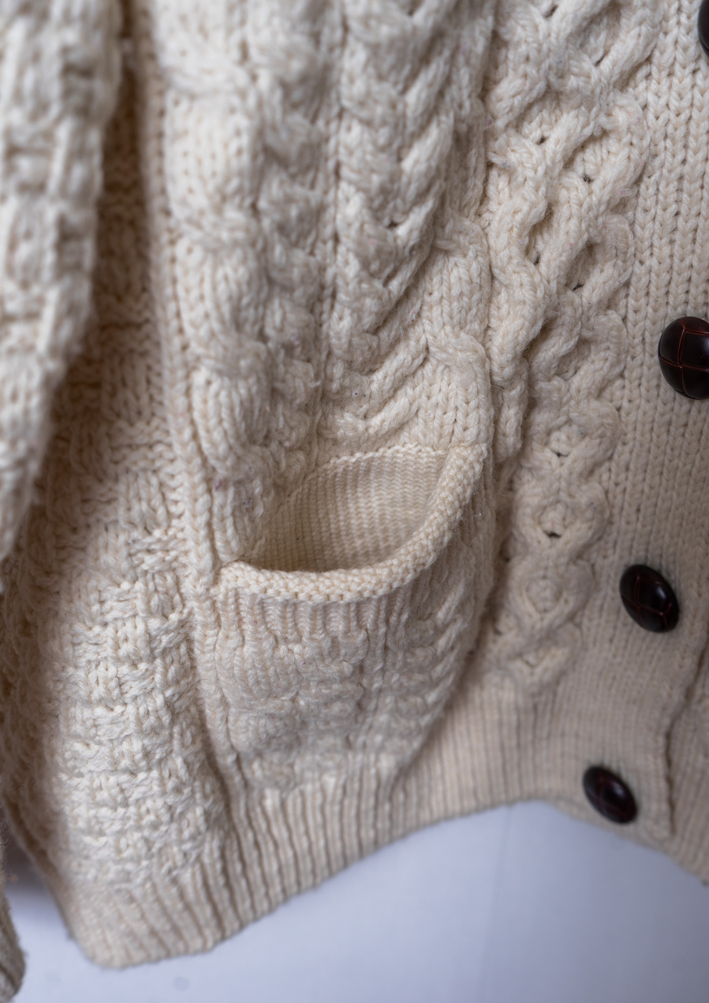 80~90's Ireland Double Pocket Design Off-White Cable Knit Cardigan