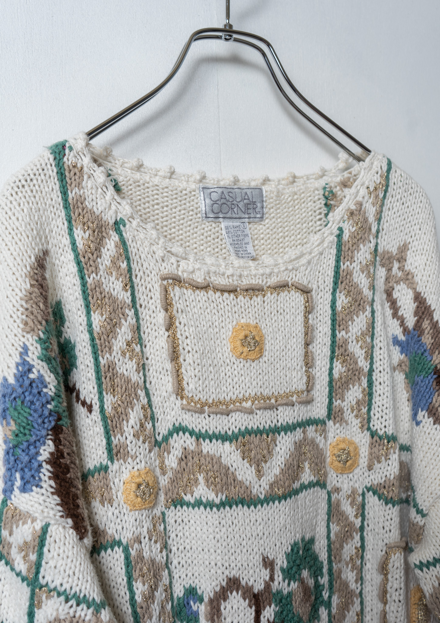 80~90's USA Tennis Art Pattern White Knit Sweater