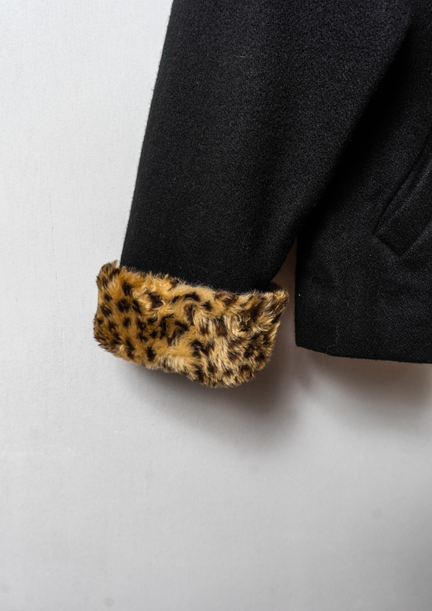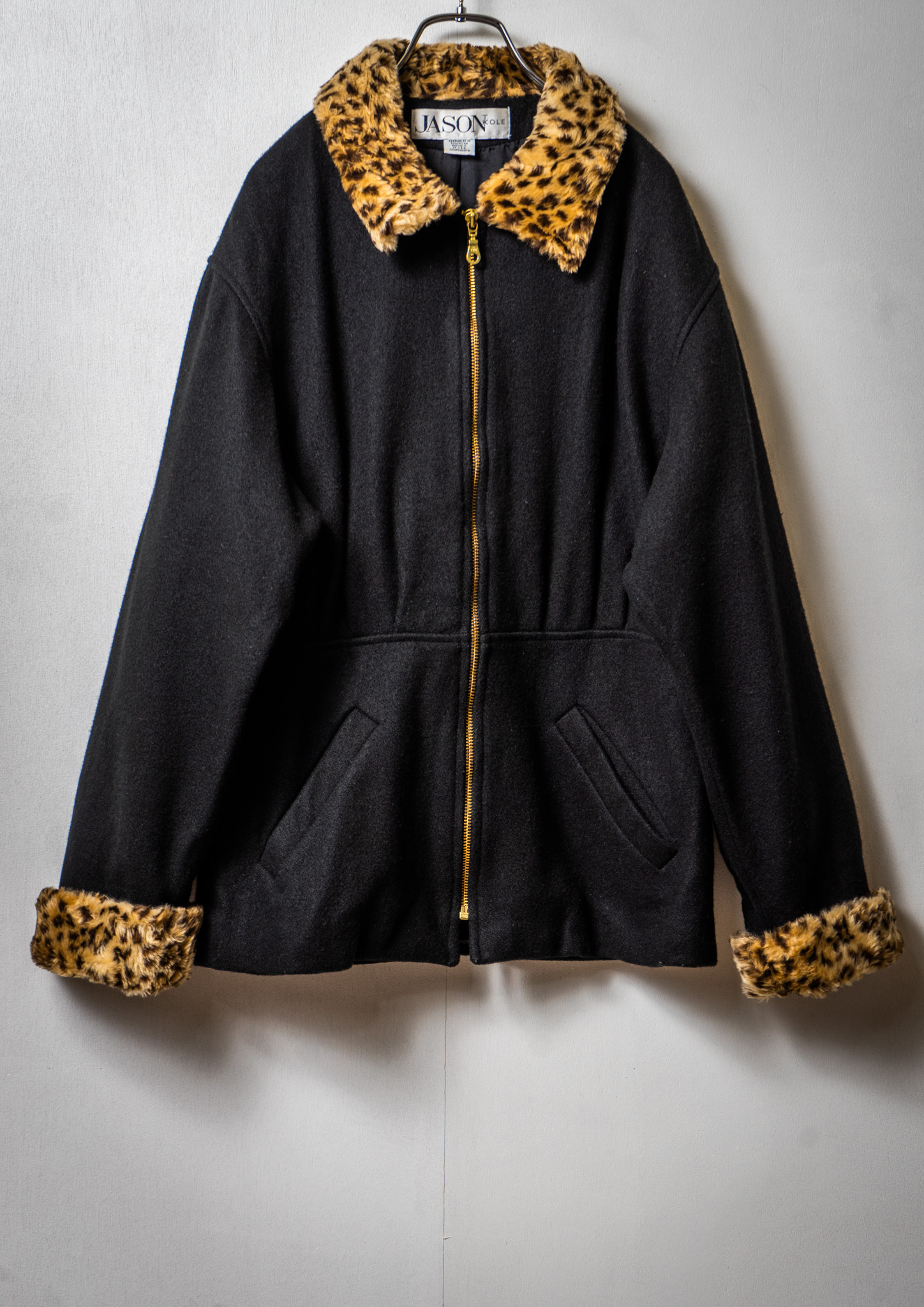 80's Double Pocket Design Point Leopard Pattern Black Wool Jacket