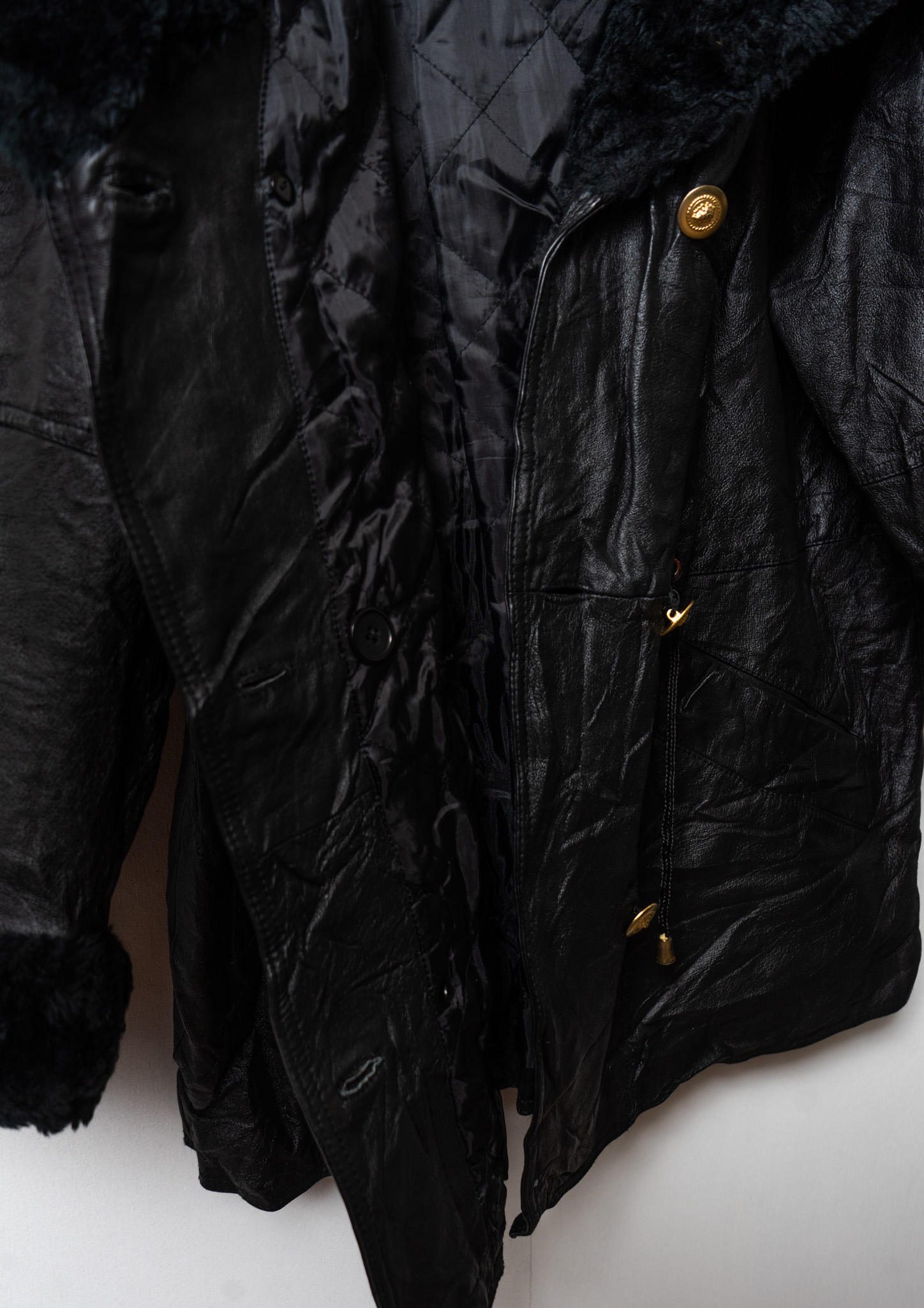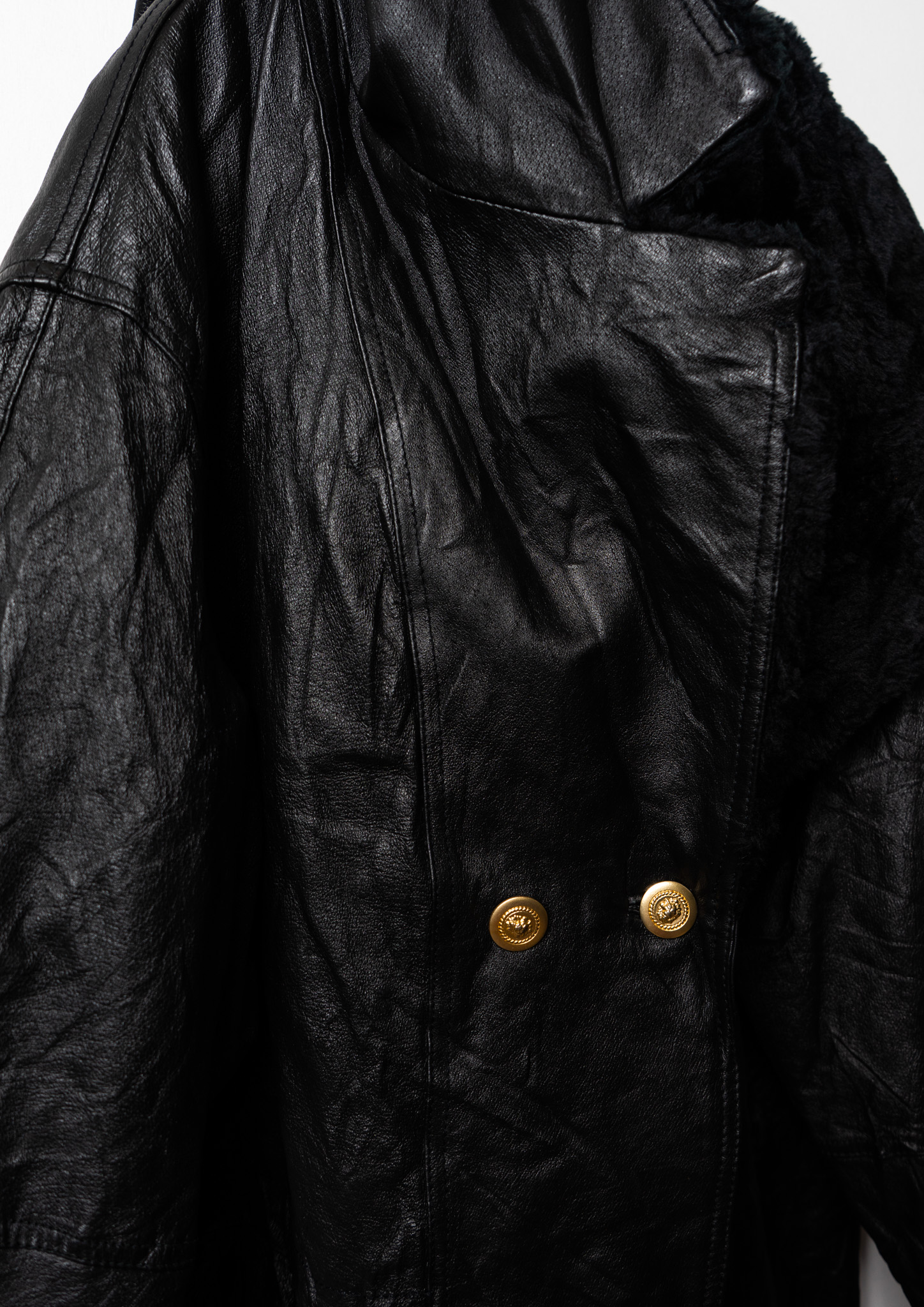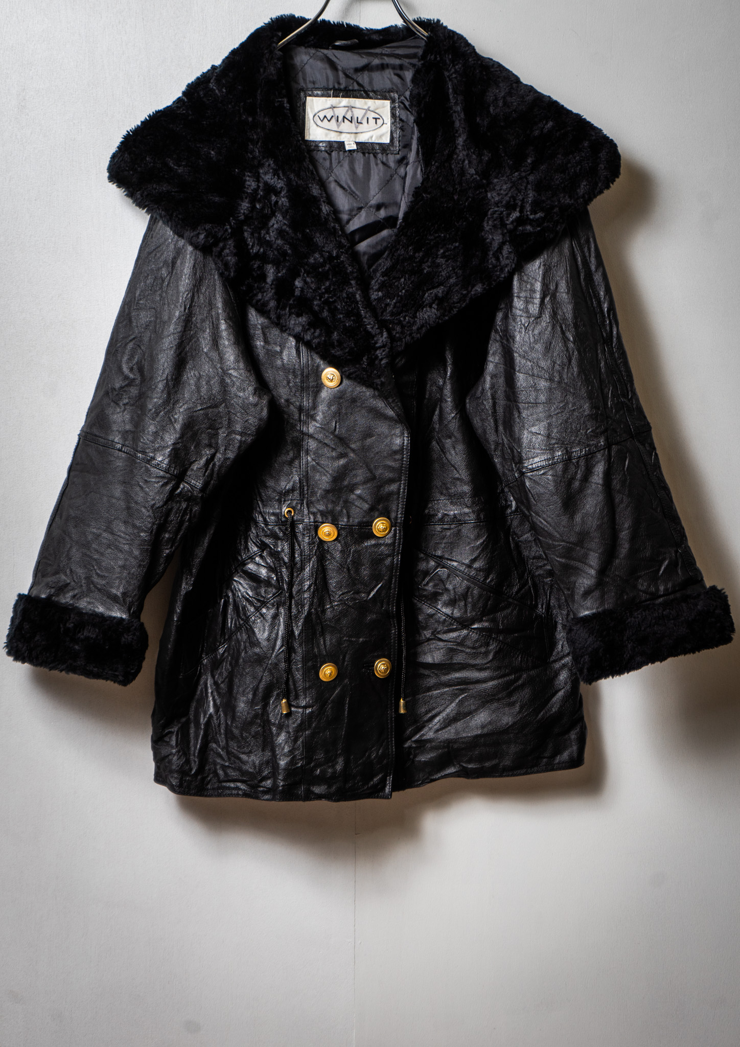80's Double Gold Button × Fur Design Black Leather Jacket