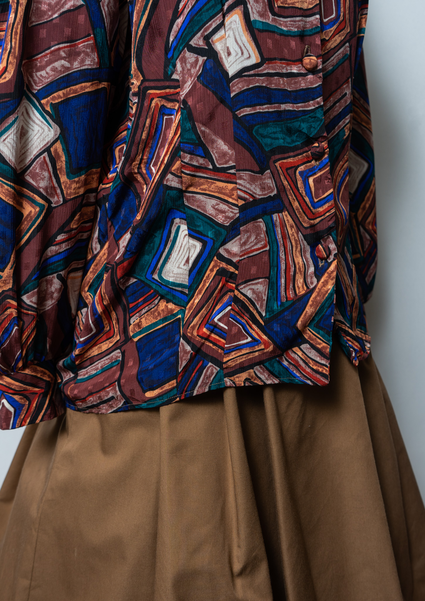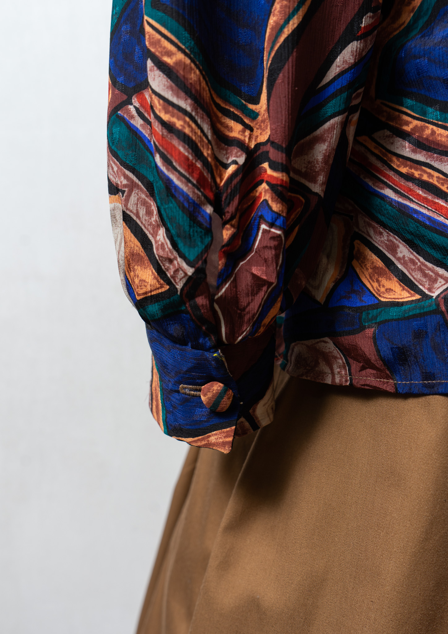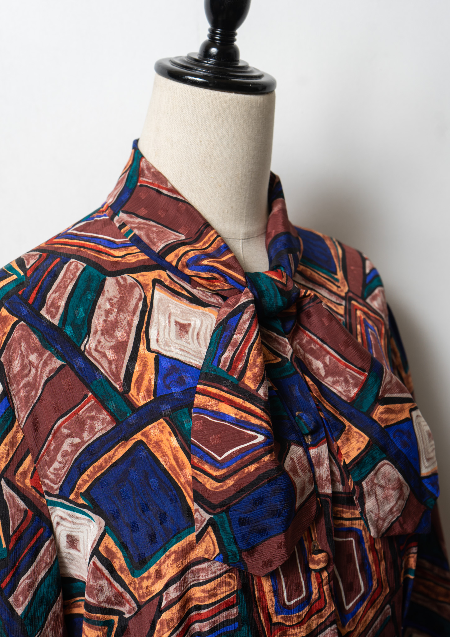 80's Euro Mosaic × Stripe Glossy Bow-Tie Blouse
