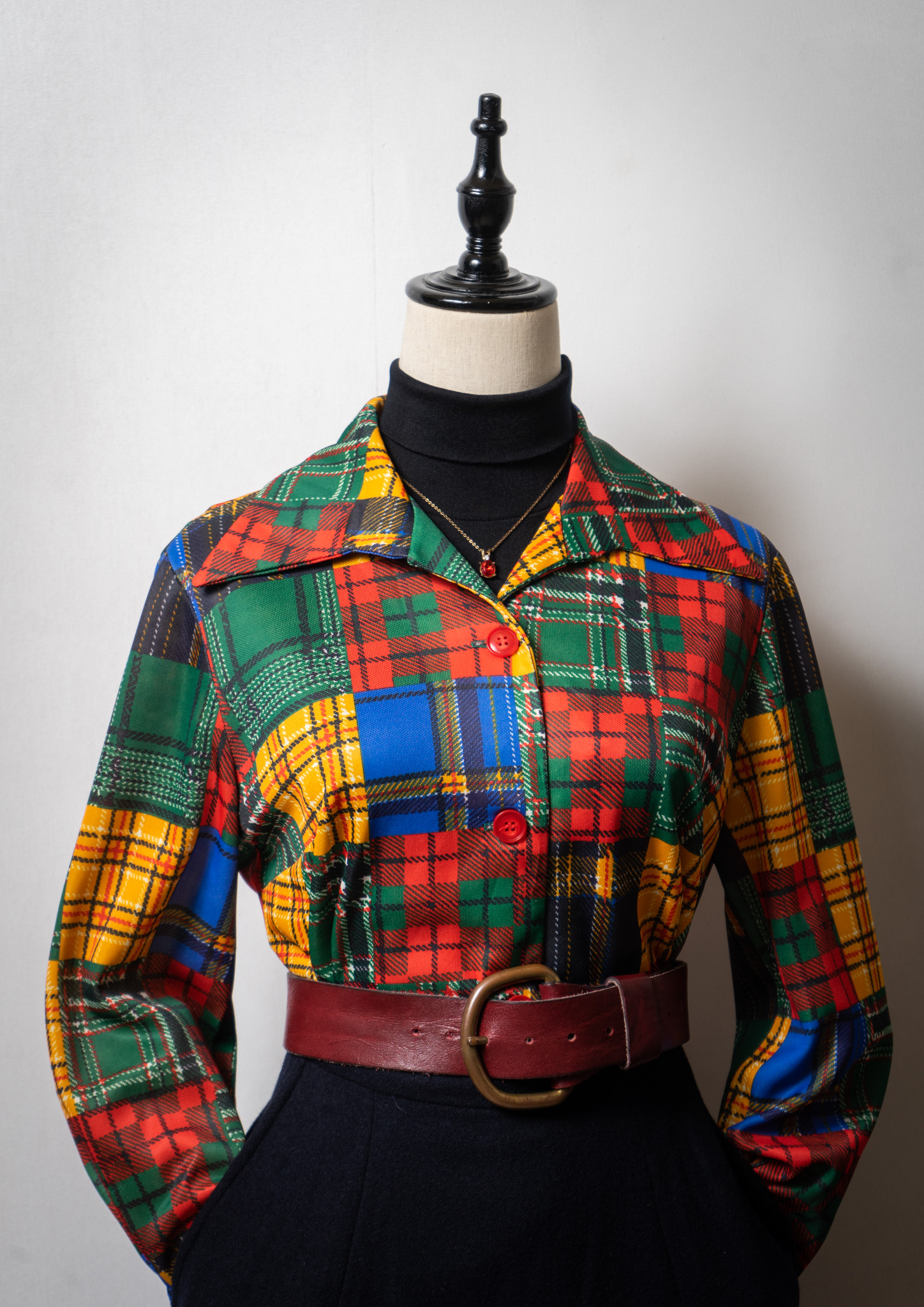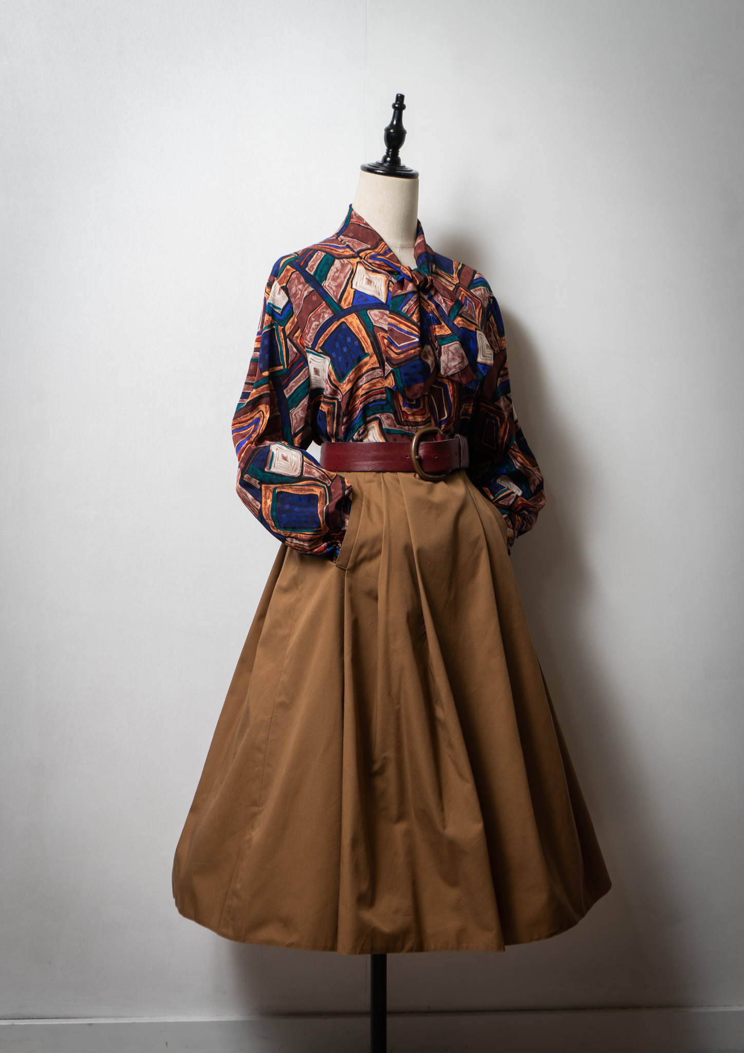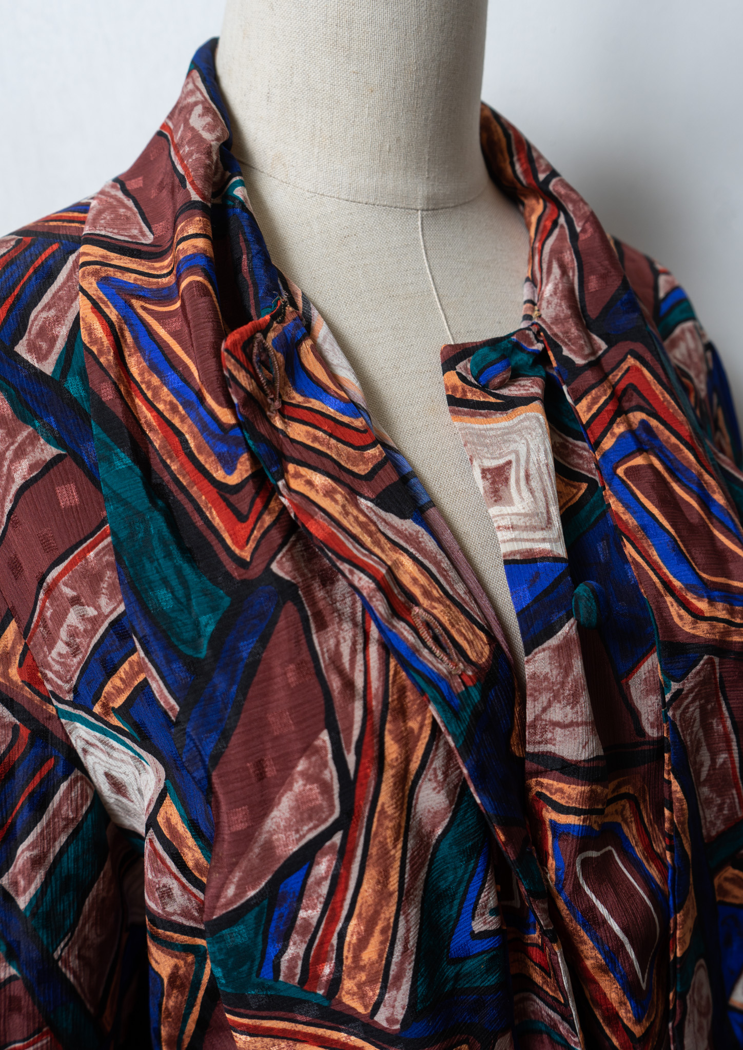 80's Euro Mosaic × Stripe Glossy Bow-Tie Blouse