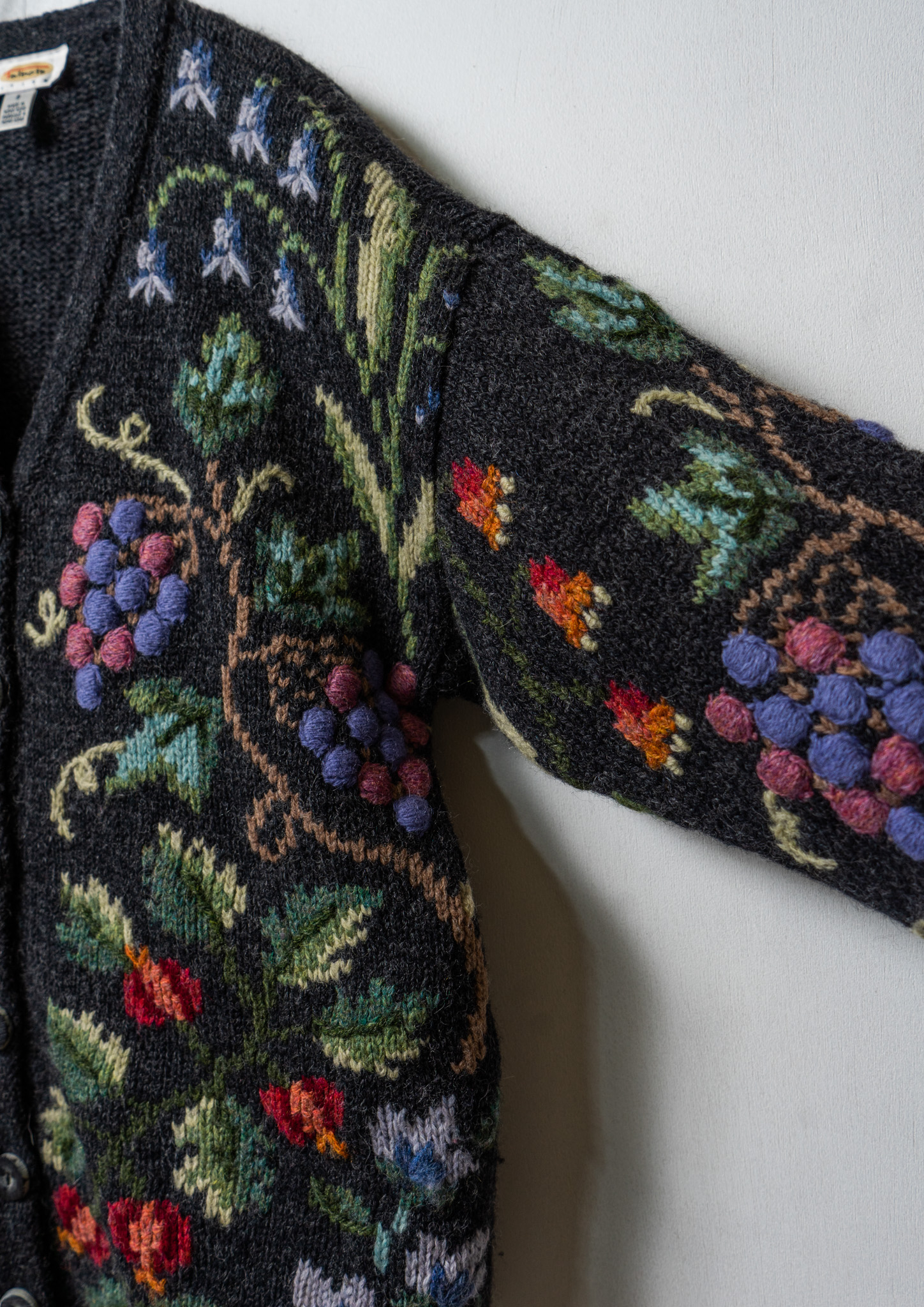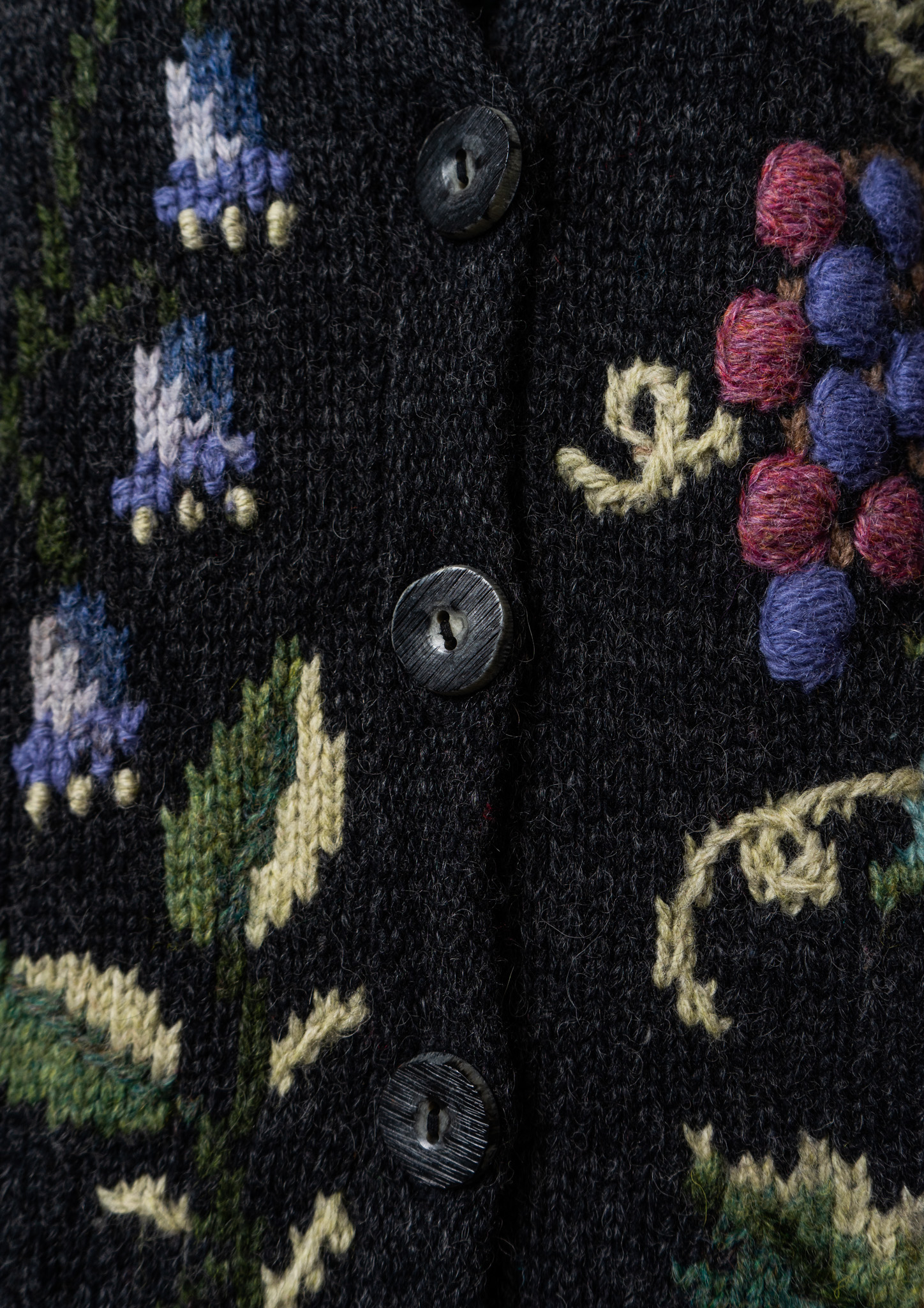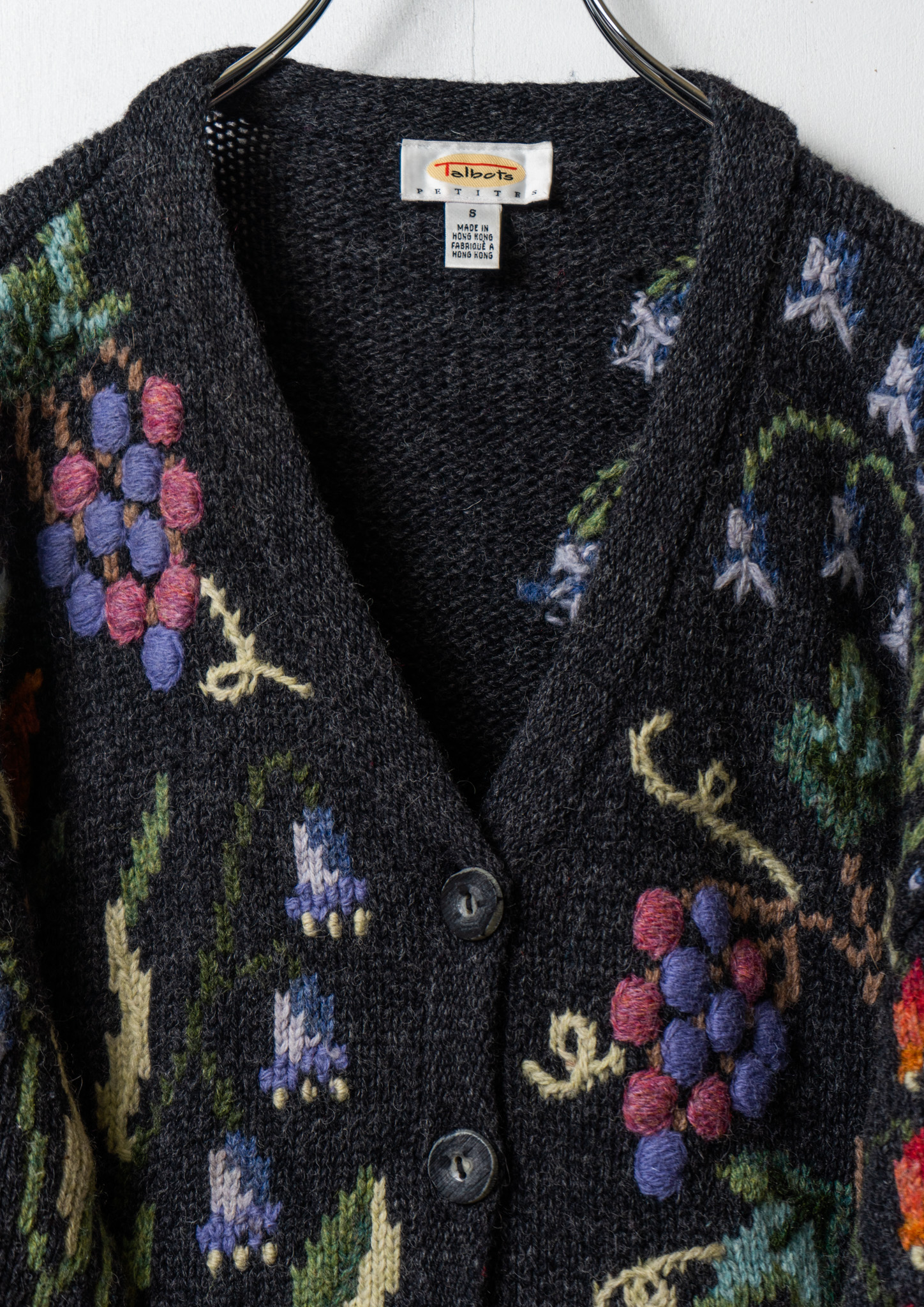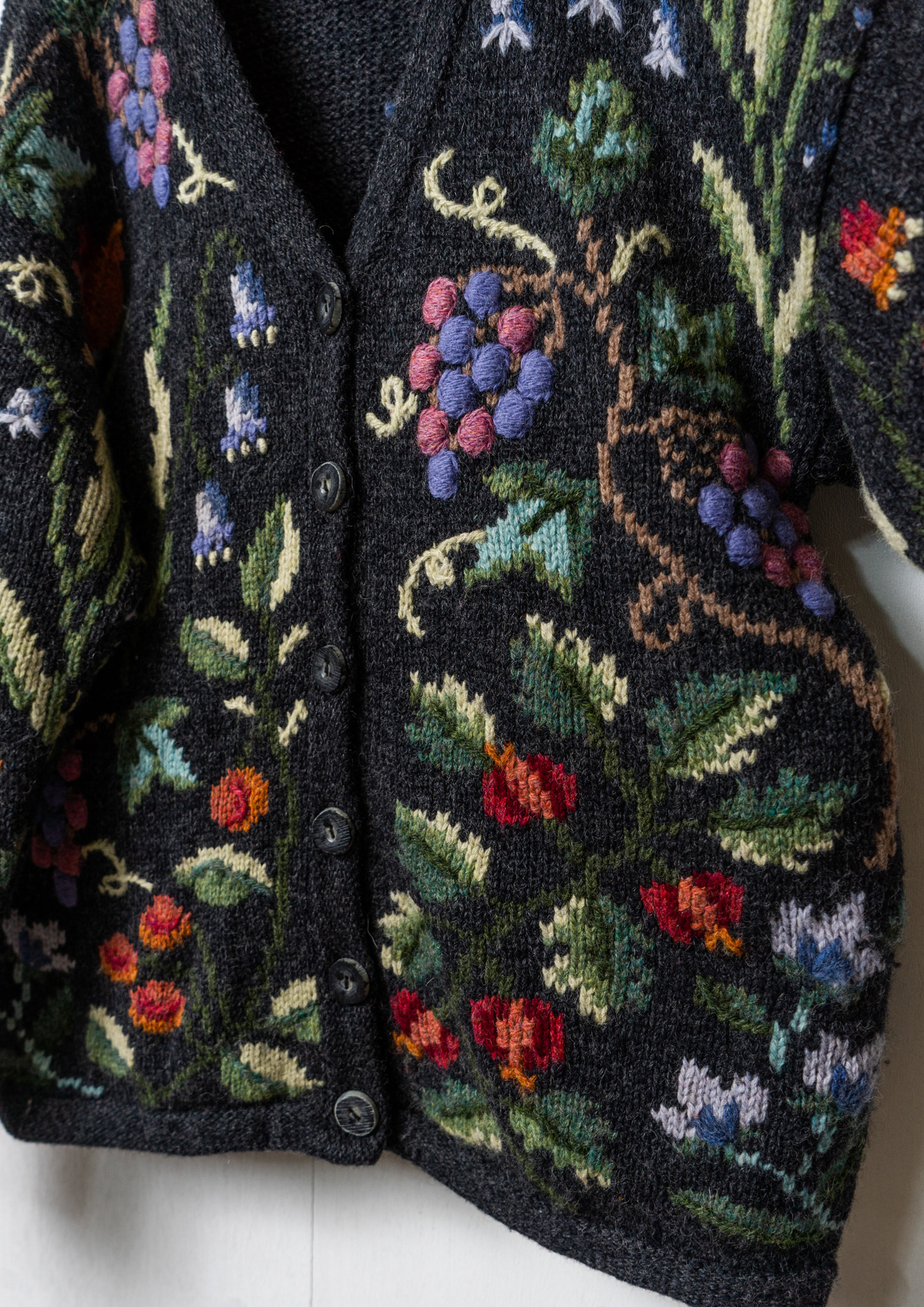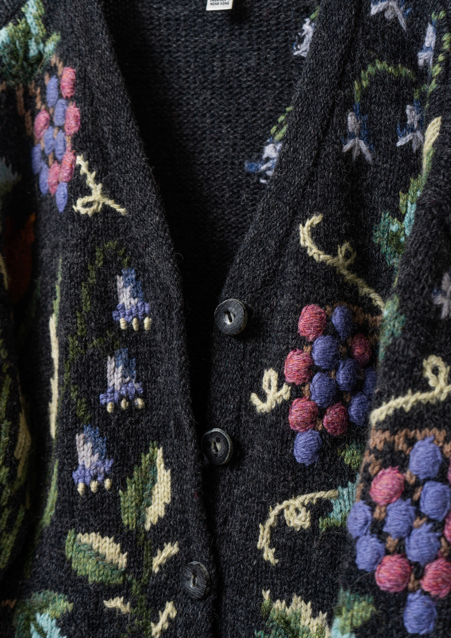 90's Grape Embroidery Pattern Dark Gray Wool Knit Cardigan