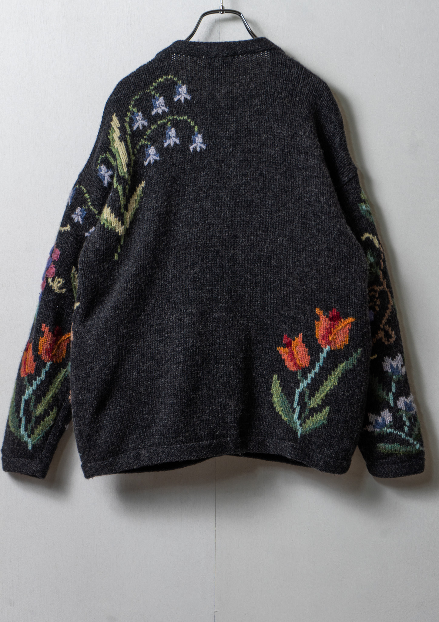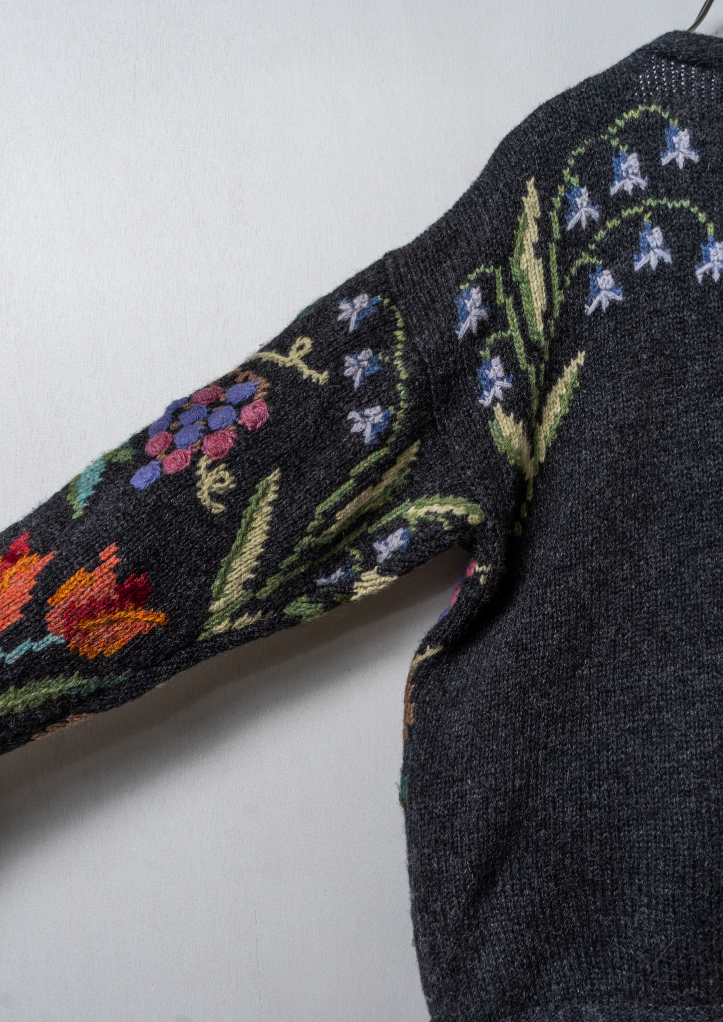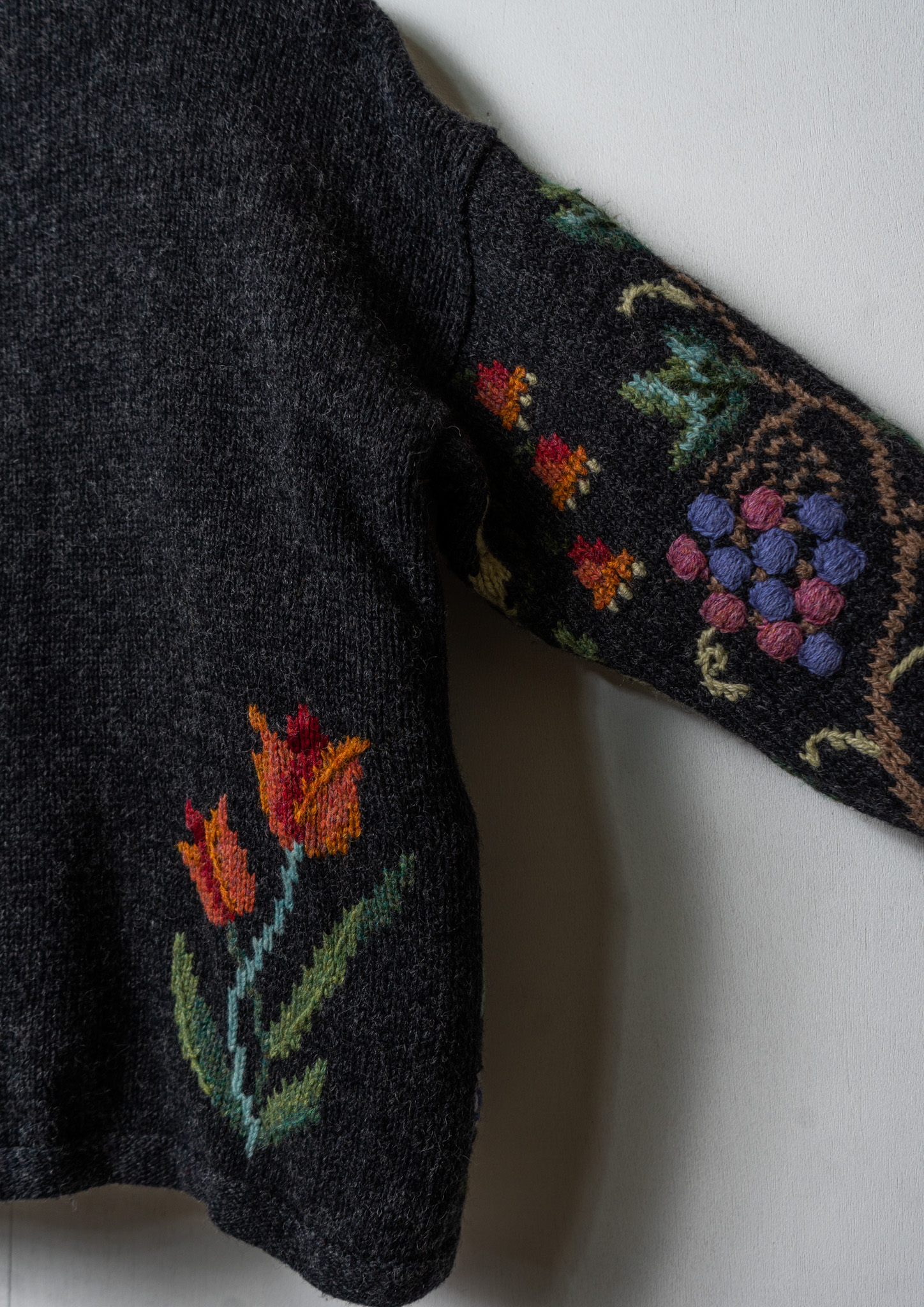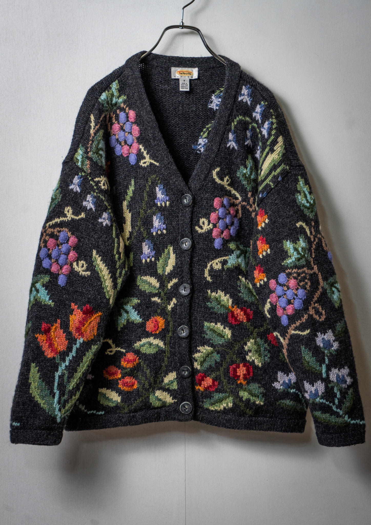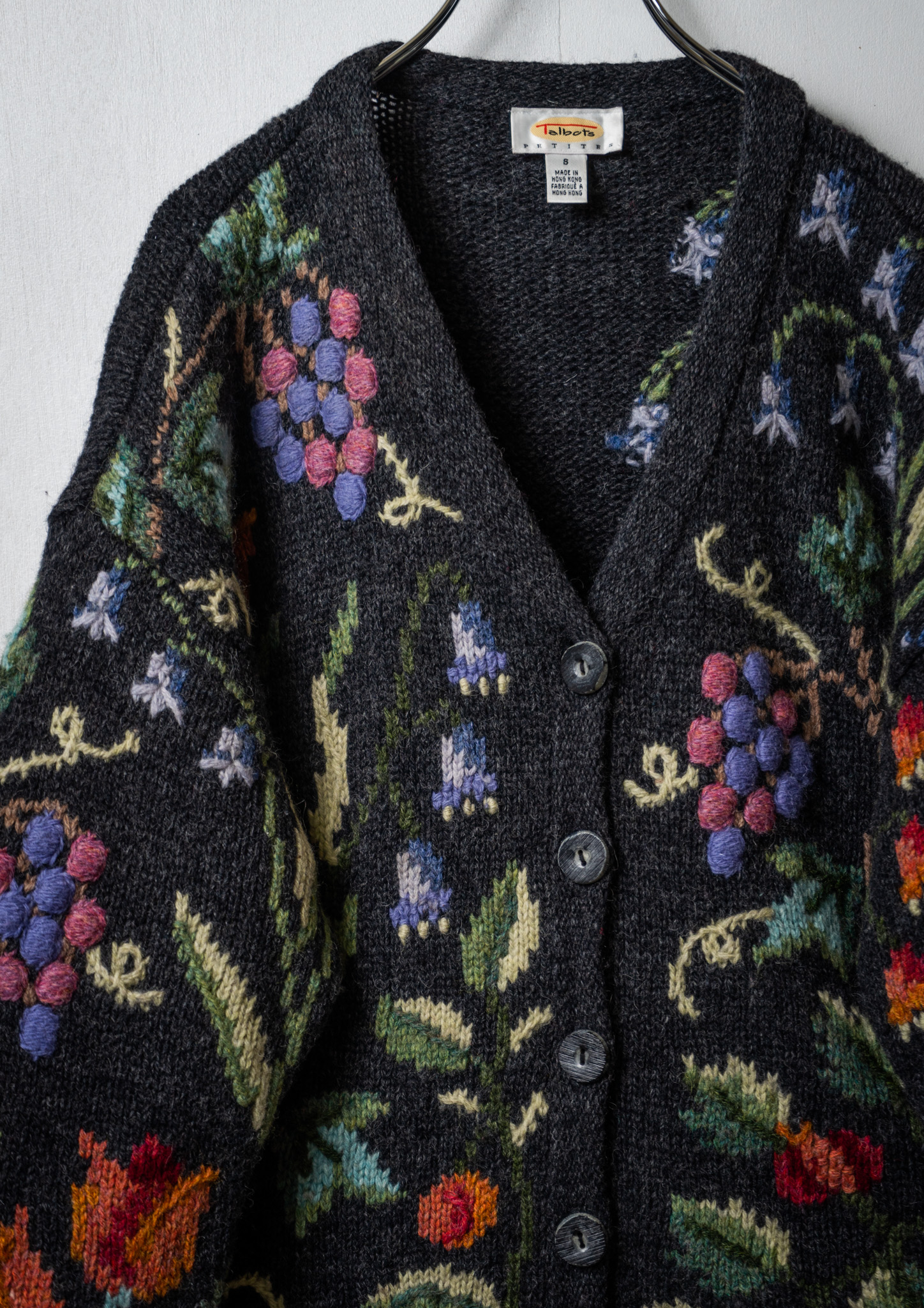 90's Grape Embroidery Pattern Dark Gray Wool Knit Cardigan