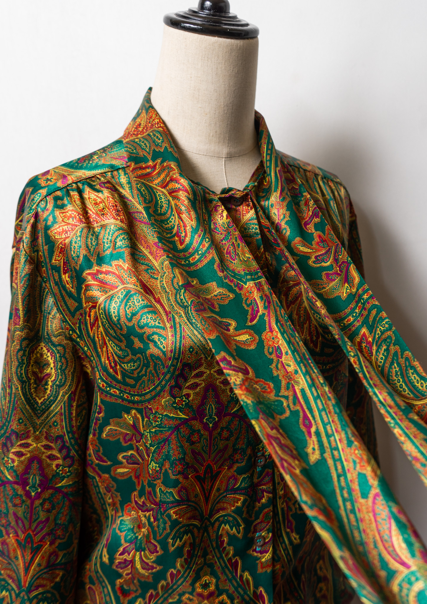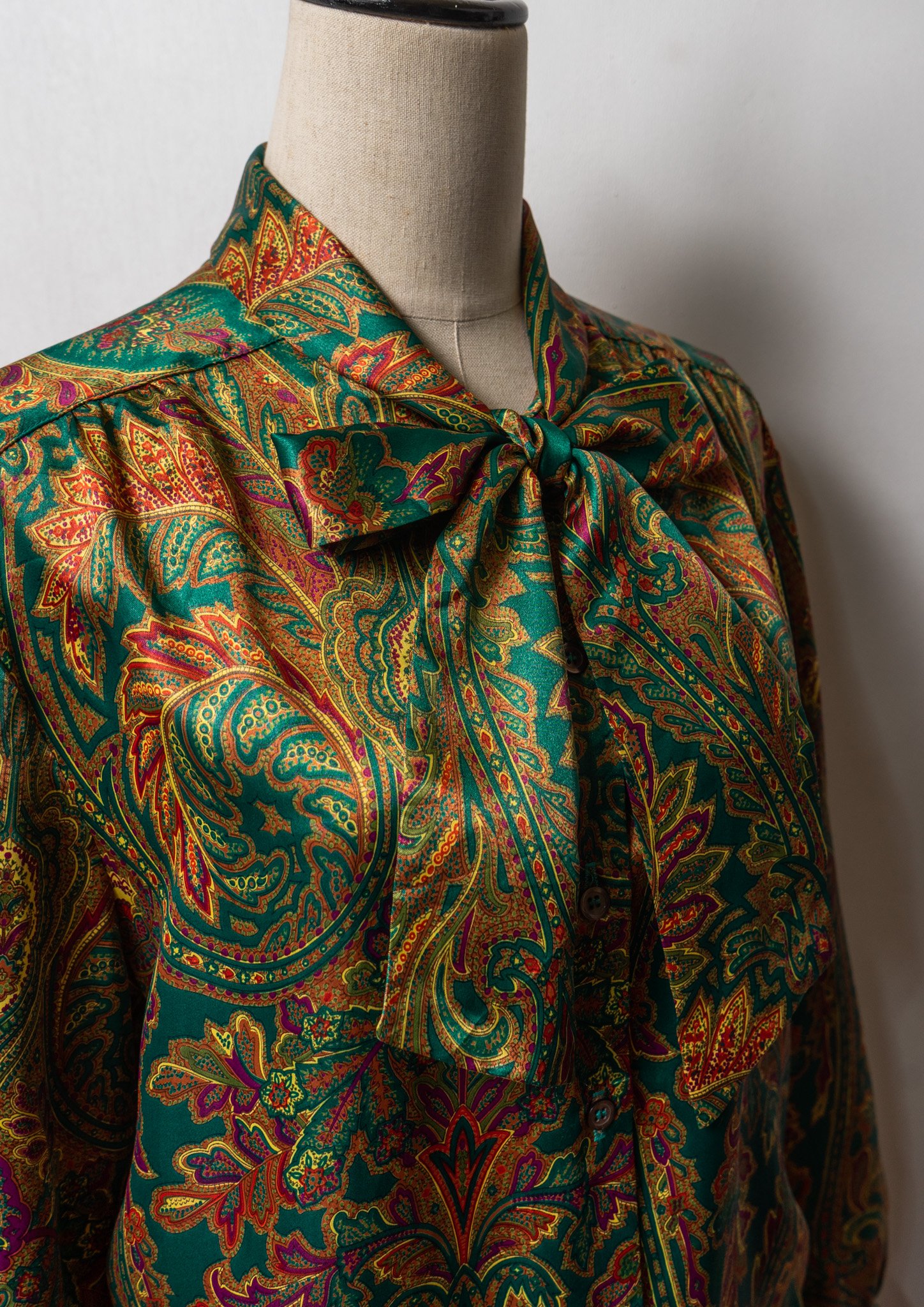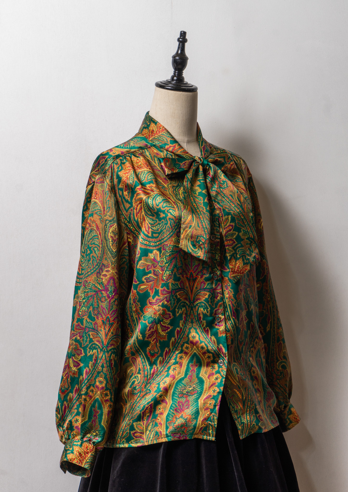 70's USA Bow-tie Design Paisley Pattern Glossy Green Blouse