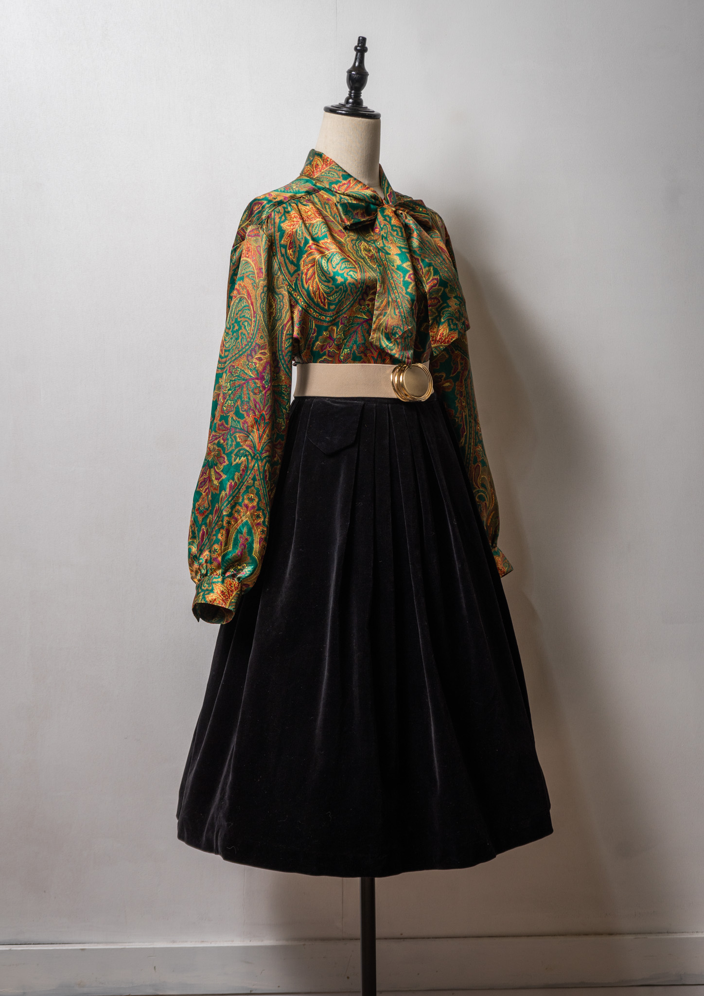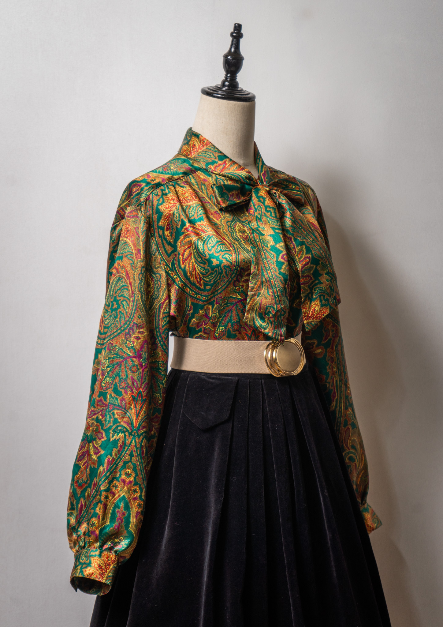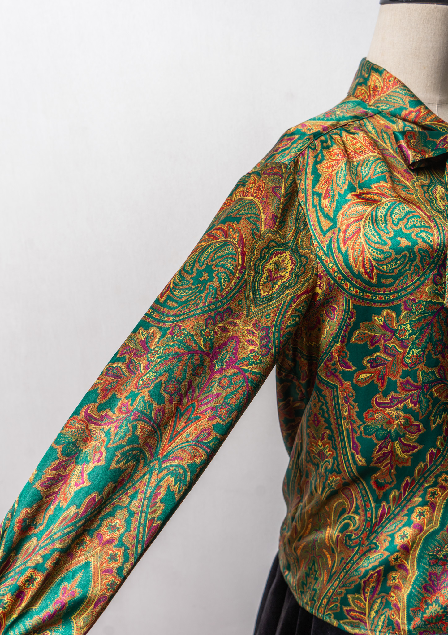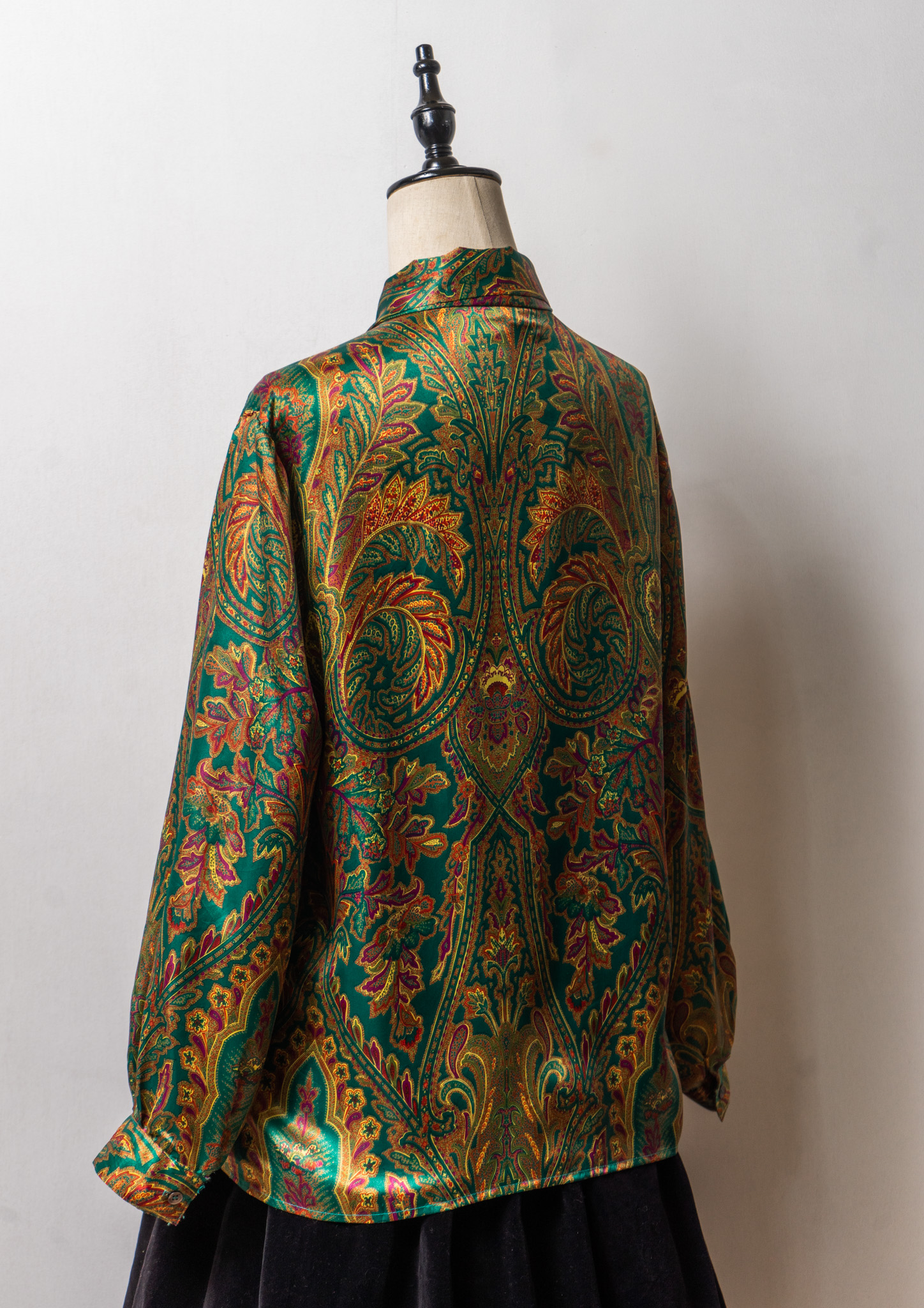 70's USA Bow-tie Design Paisley Pattern Glossy Green Blouse