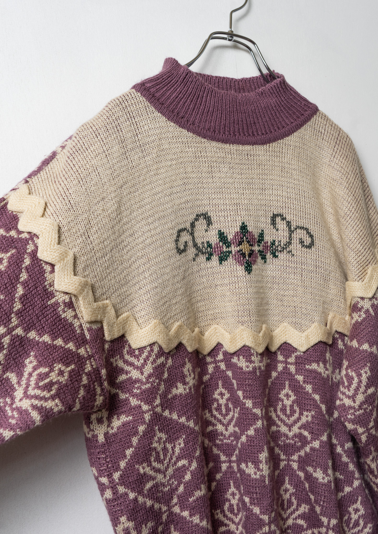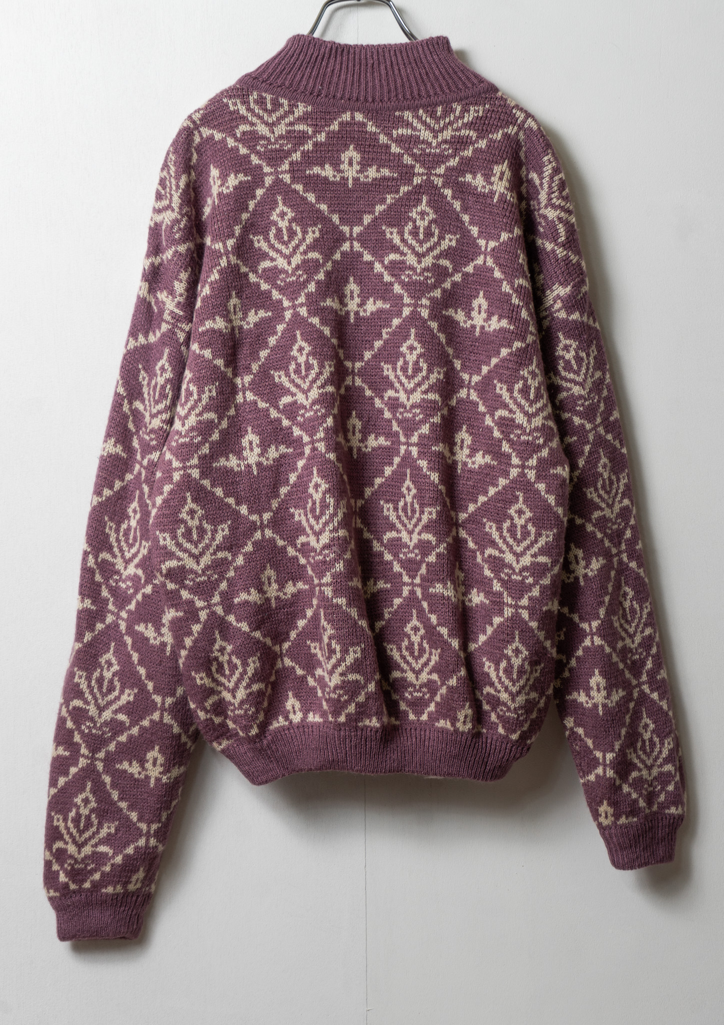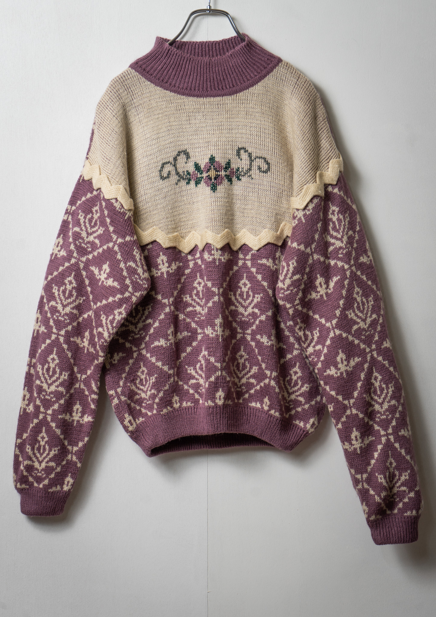 80~90's Flower × Diamond Pattern Light Purple Knit Sweater