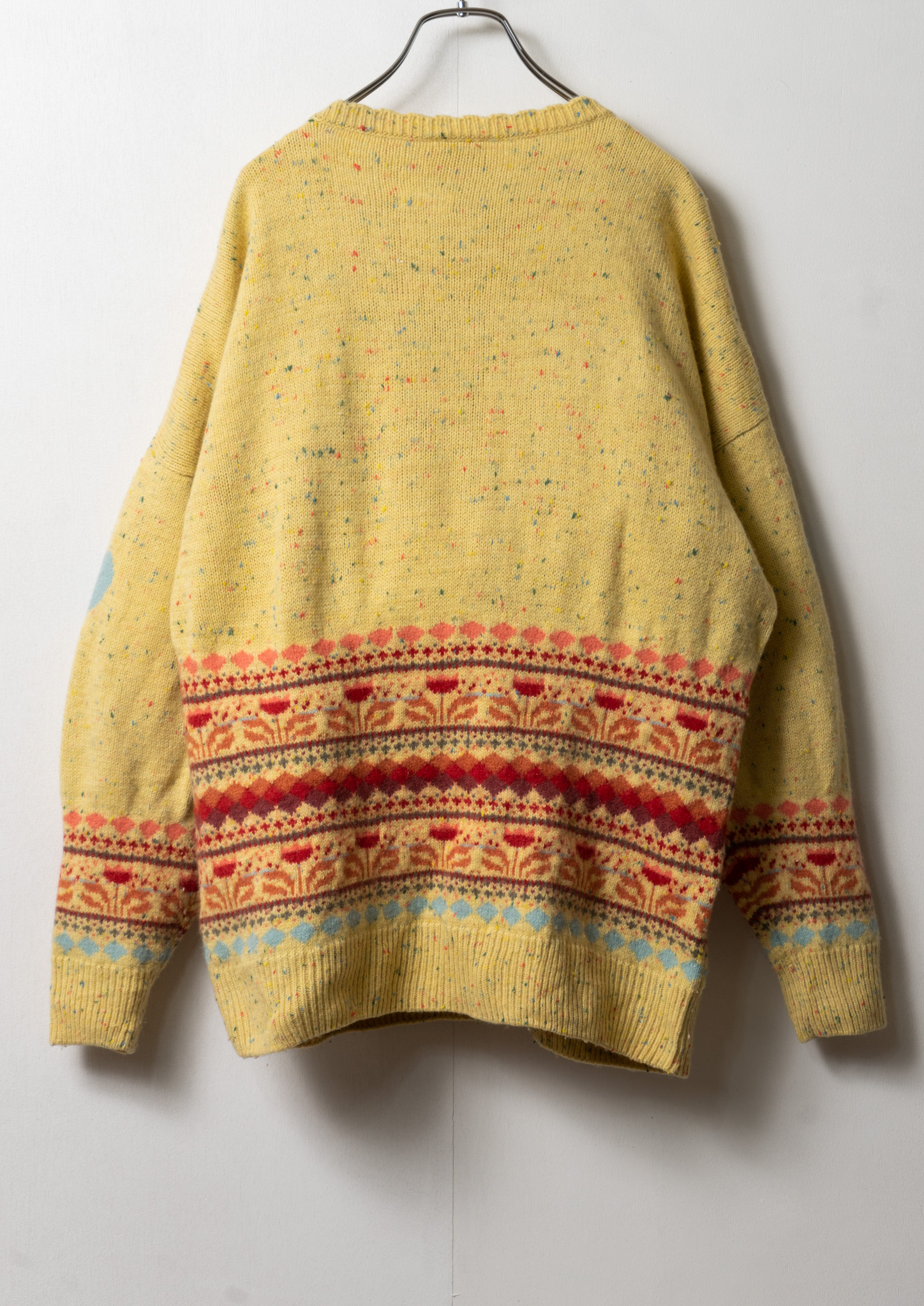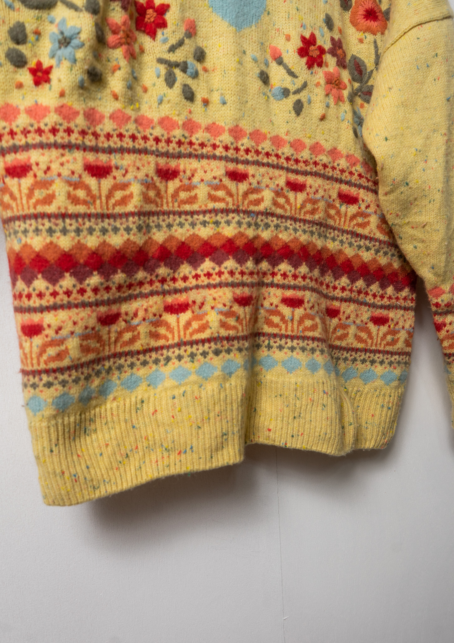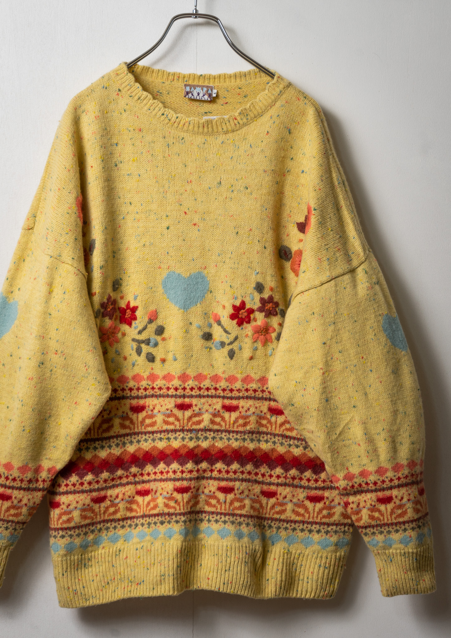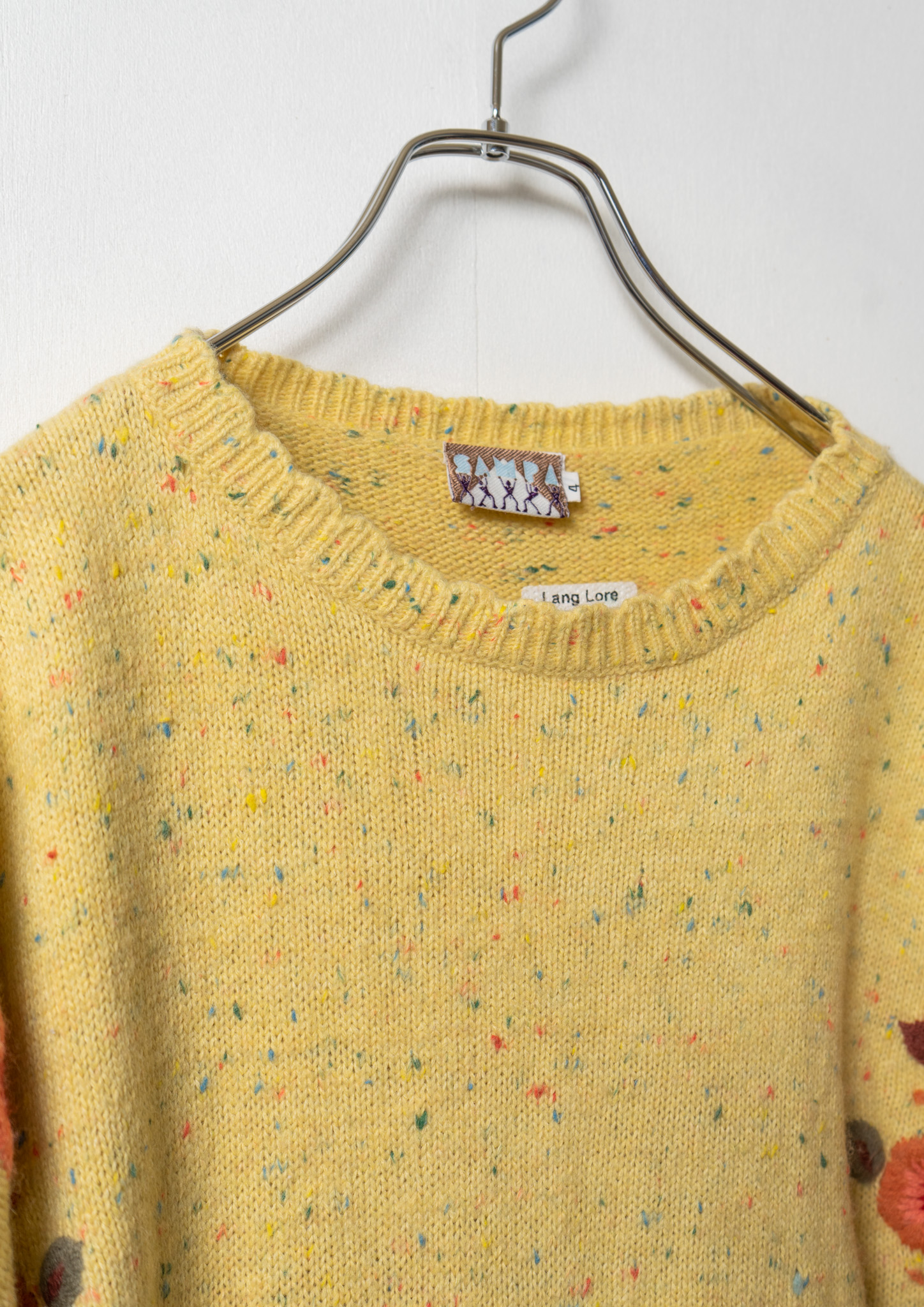 90's Flower Embroidery Color Nep Pattern Yellow Knit Sweater