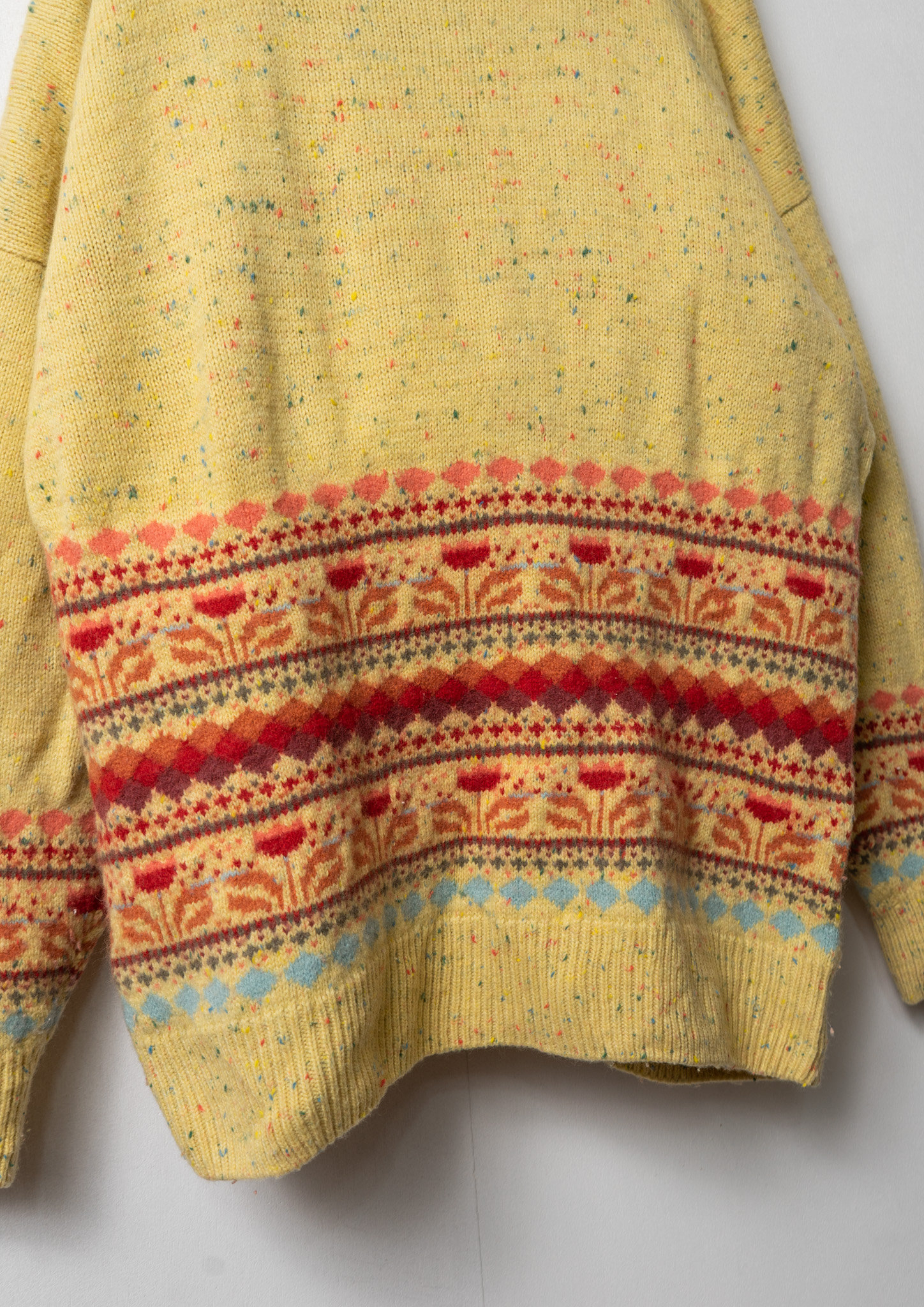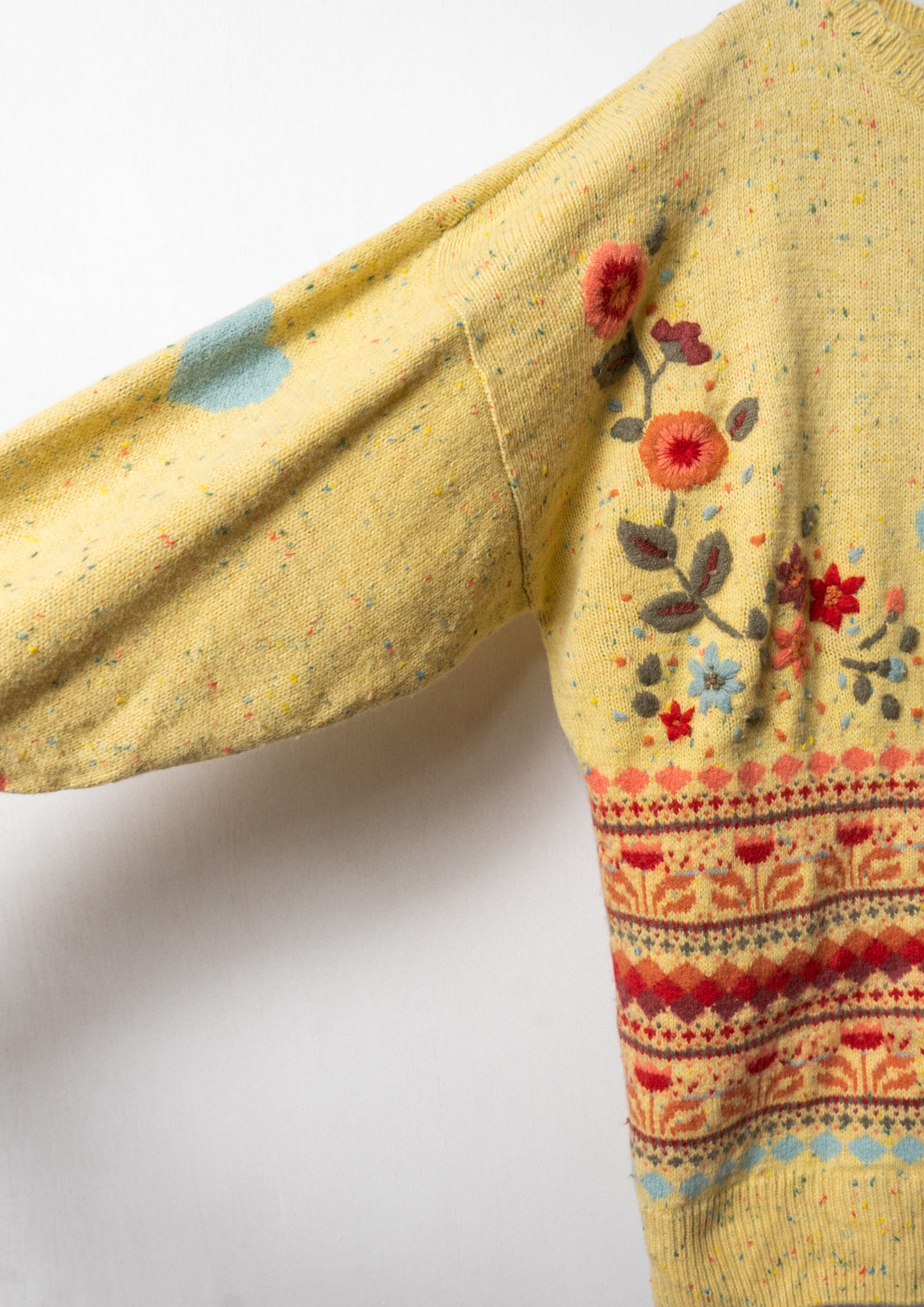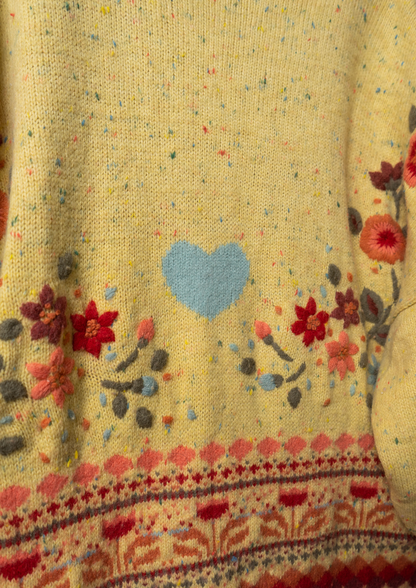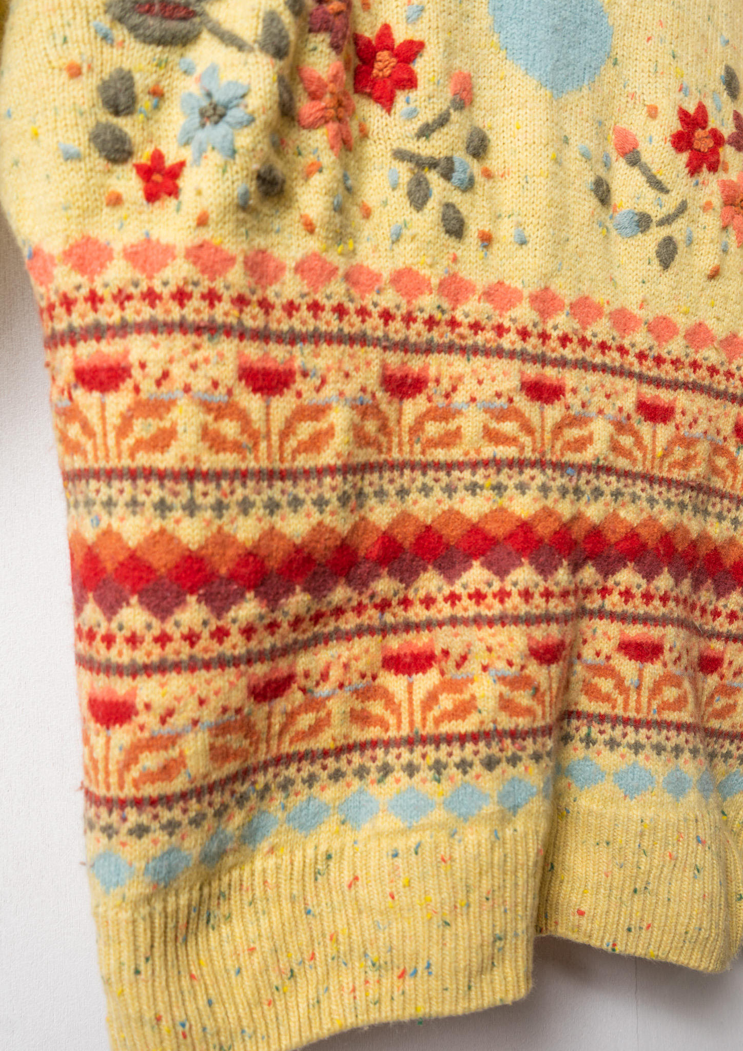 90's Flower Embroidery Color Nep Pattern Yellow Knit Sweater